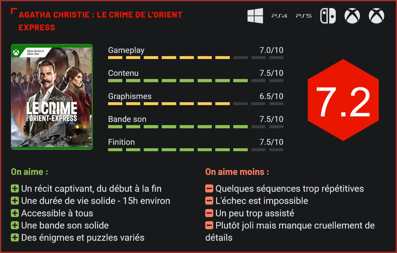 Troisième jeu dans l’univers d’Agatha Christie en l’espace de trois ans seulement chez Microids, Le Crime de l’Orient Express prend une direction très différente des deux précédentes productions mettant en scène le détective Hercule Poirot. Plus ambitieux, plus cinématographique également, Le Crime de l’Orient Express se présente comme un jeu double-A. Si les deux précédents jeux Hercule Poirot – The London Case et The First Cases – nous avaient laissé un goût de trop peu, Microids a décidé de se donner les moyens pour le prochain chapitre des aventures du célèbre détective. L’éditeur a confié à son studio lyonnais, un nouveau studio ouvert en 2021, le développement de ce nouvel épisode, qui prendrait une forme très différente des deux précédents. De facto, The London Case et The First Cases étaient des jeux à tout petit budget, en réalité des quasi productions indépendantes, qui étaient produites dans un petit studio écossais. Le Crime de l’Orient Express appartient certes au même genre – celui de l’enquête – mais prend une approche très différente puisqu’il se veut plus cinématographique mais également plus accessible. Le style animé colle parfaitement à l’univers d’Agatha Christie. Pas d’interface austère, de murmures au lieu de doublages ou de vue isométrique. Le Crime de l’Orient Express est un véritable jeu d’aventure qui se joue à la troisième personne. Dans la peau du détective Hercule Poirot, le joueur devra résoudre un odieux meurtre réalisé à bord de l’Orient Express, un train reliant Istanbul à Paris. Si le jeu est inspiré de l’œuvre d’Agatha Christie, ses créateurs ont pris quelques libertés avec le matériau d’origine. L’histoire se déroule ainsi à l’époque contemporaine et introduit surtout de nouveaux personnages et de nouveaux passages sous la forme de flashbacks. Et mine de rien, cela change pas mal de choses au niveau de l’intrigue et surtout apporte davantage de profondeur au récit. Pas d’inquiétude si vous avez récemment vu le film inspiré de l’œuvre, ou lu l’original d’Agatha Christie, vous serez agréablement surpris par ce récit revisité. La principale nouveauté sur le plan narratif concerne l’introduction du personnage de Joanna Locke, et de son passé, présenté sous la forme de flashbacks. Un choix astucieux de la part du studio, qui a pris le risque de dénaturer l’œuvre d’origine. Dans la pratique toutefois, tout cela s’intègre plutôt bien dans l’univers d’Agatha Christie. Et surtout, cela permet d’introduire des séquences de jeu ailleurs qu’à bord du train… Une atmosphère très particulière règne à bord de l’Orient Express. Bien écrit, le récit est prenant du début à la fin, et prend surtout la peine d’explorer la personnalité des nombreux personnages présents à bord de l’Orient Express à travers des dialogues savoureux. C’est bien simple, on a l’impression de visionner un film d’animation entrecoupé de quelques séquences de gameplay. Attention toutefois, si son scénario le destine à un public adulte, le jeu se veut extrêmement accessible. Il ne faudra pas s’attendre ici à un jeu d’enquête complexe. Le Crime de l’Orient Express, c’est un peu le guide du détective pour les nuls. Le joueur est pris par la main de bout en bout et d’ailleurs les erreurs n’auront aucun impact sur le récit. Concrètement, il faudra donc explorer chaque scène du jeu, interagir avec les personnages alentours en dialoguant avec, récolter des indices en s’approchant d’objets et en cliquant dessus pour les analyser, puis créer des liens entre différents éléments ou indices en explorant une “carte mentale”. Le concept est tiré des précédents jeux Hercule Poirot, mais exploré d’une façon différente, là-aussi très assistée. Concrètement, une carte avec tous les éléments narratifs apparaîtra dans un menu dédié. De nouveaux éléments créeront de nouveaux ponts jusqu’à ce que des mini jeux de déduction apparaissent, pour dresser des conclusions. Il faudra par exemple déduire, durant le prologue que c’est une fenêtre ouverte qui a causé la disparition d’un ticket de train… Après avoir fouillé méthodiquement la “scène de crime”. D’autres mini-jeux sont présents, avec à chaque fois des approches un peu différentes. Vous devrez ainsi tenter de faire rentrer des formes différentes dans un grand rectangle, pour aider les cuisiniers à stocker leur nourriture dans les frigos du train, ou encore “confronter” les personnages en leur prouvant par A + B qu’ils ont tort, en liant les bons éléments dans des conversations. C’est plutôt bien pensé mais encore une fois étonnamment accessible. Toute l’aventure ne se déroule pas uniquement dans le train. Clairement, les amateurs de jeux d’enquête resteront un peu sur leur faim. Avec son côté ultra-assisté et ses mystères relativement faciles à résoudre, Le Crime de l’Orient Express s’adresse davantage à un public moins habitué aux jeux de ce style qu’à un public de passionnés. Et c’est à la fois sa plus grande qualité et son plus gros défaut puisque dans la pratique le jeu est très agréable à parcourir mais également un peu trop facile par moments… Alors oui, Le Crime de l’Orient Express aurait pu être meilleur, oui visuellement ce n’est pas non plus une claque, la faute en grande partie aux animations très rigides et à un certain manque de détails, et oui, on aurait été être un peu moins assisté dans ce récit, mais force est de constater que Microids Lyon est parvenu à nous livrer un très bon jeu d’aventure. On notera au passage que Microids est certainement au courant des petits défauts de son jeu puisqu’en dépit d’une solide durée de vie (comptez 15h environ) et un budget plus conséquent que ses autres titres, le jeu n’est vendu que 