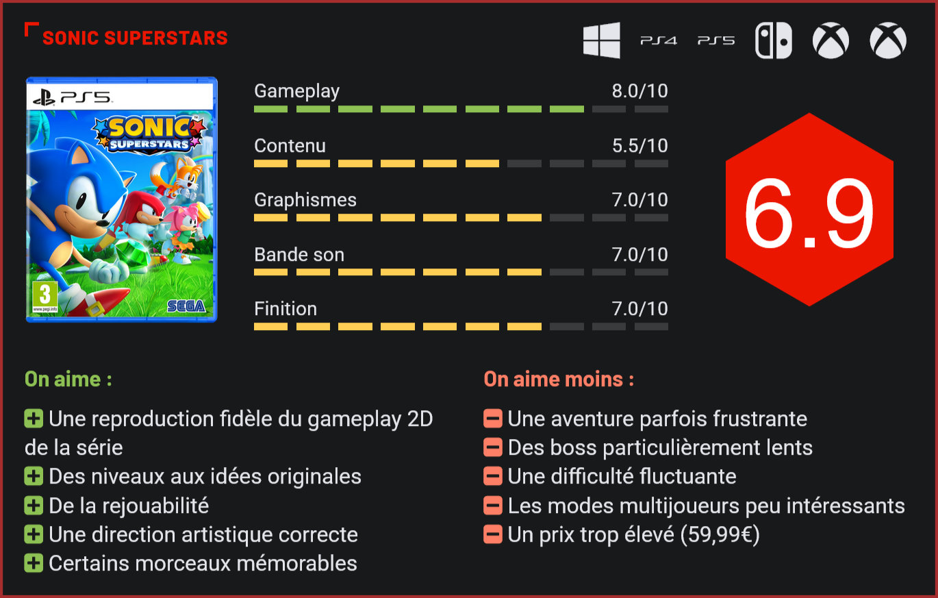 Tout comme Mario, Sonic propose également une nouvelle aventure en 2D durant ce mois d’octobre. Le plombier de Nintendo s’en est sorti avec honneur, mais qu’en est-il du hérisson de Sega ? Comme souvent, la mascotte nous livre un épisode en demi-teinte. Si vous êtes familier avec la licence Sonic The Hedgehog, vous devez sans doute aussi connaître les fluctuations de qualité qui caractérisent les titres de la série depuis ses débuts en 1991. Le hérisson ne se porte pourtant pas trop mal ces dernières années grâce au sympathique Sonic Frontiers sorti en 2022, et n’oublions pas l’excellent Sonic Mania de 2017. Annoncé lors du Summer Game Fest au début du mois de juin, ce Sonic Superstars est justement le successeur de l’épisode Mania puisqu’il est un retour aux sources, un épisode 2D modernisé avec des visuels en 3D. Un titre alors prometteur, mais réalisé en collaboration entre la Sonic Team et Arzest, un studio qui a travaillé auparavant sur des titres sympathiques au mieux, et parfois plutôt décrié comme le fameux Balan Wonderworld. Reste à savoir si le studio a réussi à faire un bon successeur à Sonic Mania, ou est-ce plutôt un successeur spirituel du catastrophique Sonic 4 ? C’est compliqué. Cette nouvelle aventure se déroule à l’époque “classique”, celle des jeux des années 90. Nous retrouvons Sonic, Tails, Knuckles et Amy qui arrivent sur les Northstar Islands. Ces îles sont attaquées par le Dr. Eggman qui, comme à son habitude, transforme les animaux en robots. Le docteur n’est cependant pas seul, puisqu’il est cette fois accompagné par Fang, un antagoniste que nous n’avions plus vraiment vu depuis 1996, ainsi qu’un mystérieux nouveau personnage nommé Trip. Un épisode très léger en scénario qui nous lance dans une aventure aux multiples zones, pour une vingtaine de niveaux. Sonic Superstars se déroule donc plus ou moins comme les épisodes en 2D précédents, et nous permet de jouer les quatre personnages principaux. Le gameplay varie en fonction de notre choix. Sonic possède son Drop Dash lui permettant de prendre de la vitesse à l’atterrissage, Tails peut voler, Knuckles peut planer et grimper aux murs, tandis que Amy peut utiliser son marteau et possède un double saut. Point positif, le gameplay du jeu est assez proche des sensations des épisodes Megadrive. La vitesse et la physique du jeu paraissent similaires à celles des meilleurs jeux en 2D, et les personnages se contrôlent comme l’on pourrait s’y attendre. Cette prise en main efficace permet à la fois de réaliser des phases de plateforme demandant une certaine précision tout en offrant de bonnes sensations de vitesse lors de passages plus automatisés. Certains niveaux sont uniquement jouables avec un personnage précis, permettant de mettre ses capacités à profit. Certains passages offrent de bonnes sensations de vitesse. Le souci vient peut-être plutôt du level design qui paraît particulièrement inconstant. Certaines zones proposent des idées très sympathiques et sont agréables à parcourir, d’autres le sont beaucoup moins en nous tendant des pièges particulièrement fourbes, en particulier vers la fin de l’aventure. Ce n’est pas inhabituel pour la série, et le plaisir d’un jeu Sonic en 2D provient également de la maîtrise du gameplay et des niveaux, mais Superstars pousse certainement le curseur de la frustration un petit peu trop loin. La faute aussi à une caméra parfois trop proche de notre personnage qui rend les obstacles très difficiles à anticiper. Certains actes paraissent aussi très longs, de même que les boss qui durent souvent plusieurs minutes et qui représentent parfois de très gros pics de difficulté. Certaines zones possèdent des anneaux géants permettant de tenter notre chance dans un stage spécial, avec à la clé une émeraude du chaos. Ces dernières ne servent plus seulement à jouer les versions “super” des différents personnages, mais chacune des émeraudes nous permet d’utiliser un nouveau pouvoir inédit. Faire apparaître des éléments cachés, nous propulser dans une direction, ou encore invoquer une horde de clones de notre personnage font partie de ces nouvelles capacités aux utilisations limitées. Si c’est une nouveauté sympathique, ces pouvoirs sont malheureusement utiles dans très peu de cas de figures, et on se surprend souvent à oublier leur existence pour jouer plus classiquement. Les personnages sont fidèles à leurs dernières représentations en 2D. Superstars propose également différentes sortes de stages bonus qui permettent souvent de gagner des médailles. Ces dernières servent de monnaie à dépenser dans un magasin dédié à un tout nouveau mode multijoueur. Il est en effet possible d’acheter et d’assembler différentes parties pour créer notre propre robot inspiré des inventions du docteur. Ces robots peuvent ensuite être contrôlés dans un mode multijoueur en ligne qui nous demande de réaliser de petits objectifs. L’on se rend cependant vite compte que la création de robot n’a pas beaucoup d’intérêt puisque les épreuves proposées sont très limitées et peu intéressantes. Dommage qu’il soit impossible de jouer avec nos créations dans les niveaux classiques du jeu. L’une des grosses nouveautés de cet épisode est aussi la possibilité de jouer jusqu’à quatre simultanément, et ce, uniquement en local. Une idée sympathique sur le papier qui se révèle peu fonctionnelle en l’état. Ce mode multijoueur ne semble pas bien adapté au concept de Sonic, un jeu dans lequel le but est d’aller vite. Pas d’écran splitté ici, cela veut dire que les coéquipiers à la traîne disparaissent tout simplement de l’écran, et reviennent après quelques secondes. Impossible de prendre des chemins différents dans ces niveaux pourtant plutôt grands, il faut impérativement rester groupé sous peine de disparaître d