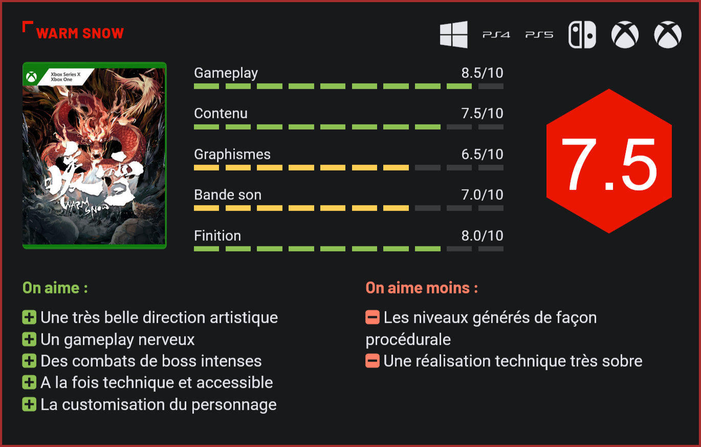 Nouvelle production indépendante éditée par Microids, Warm Snow est un petit rogue-lite sans prétention terriblement efficace. Explications. En cette période très chargée, les jeux indépendants ont un peu plus de mal à faire parler d’eux que d’ordinaire. Plus encore quand ils entrent dans une niche comme ce Warm Snow, un rogue lite qui compense sa difficulté par une certaine accessibilité. Le jeu nous propose d’incarner un guerrier qui va devoir résoudre le mystère de la neige chaude, qui a transformé les habitants d’une région reculée en bêtes assoiffées de sang. Son voyage l’amènera à affronter les 5 maisons qui défendaient autrefois le monde et à éliminer leurs leaders, qui feront office de boss de fin de niveau. Les boss sont très réussis. Comme souvent dans les rogue lite, le scénario est minimaliste et n’est surtout qu’un prétexte à voir du pays. Chaque niveau est composé de plusieurs zones qu’il faudra parcourir en éliminant tous les ennemis, en récupérant un maximum d’avantages et des armes plus puissantes, et surtout en évitant de subir des dégâts pour avoir un maximum de chances face au boss. Car dans ce jeu, votre vie ne se régénère pas avant que vous ayez éliminé un boss. Il sera certes possible de reprendre un peu de vie grâce aux fioles de santé, mais celles-ci sont rares. Tout le gameplay du jeu est basé sur l’esquive. Notre guerrier se déplace rapidement à l’écran et est capable de dasher. Il dispose de deux types d’attaques principales : au corps à corps ou à distance, avec l’envoi de katanas, qu’il pourra récupérer au sol une fois son ennemi terrassé. Et c’est là que le titre se veut un peu plus accessible que la plupart des autres rogue lite avec un nombre assez important de katanas à envoyer à l’ennemi sans prendre de risques de se faire toucher, et un système d’esquive vraiment bien fichu. A chaque mort vous reviendrez au sanctuaire. Comme on l’a dit plus haut, il s’agit d’un rogue lite et pas d’un rogue like, ce qui signifie que certains éléments de la progression sont permanents. Une fois un “monde” terminé, vous ne devrez plus y revenir. Vous pourrez aussi obtenir des améliorations permanentes pour votre personnage. Warm Snow brille par la diversité de son bestiaire, sa patte artistique très sombre et son gameplay nerveux. Le monde dans lequel on est transporté est peuplé de créatures immondes au design particulièrement réussi. Chacune vous attaquera en suivant un pattern différent. Toutefois, c’est bien lors des combats de boss que le jeu montre tout son potentiel, avec des affrontements longs, intenses et techniques. L’univers de Warm Snow mélange médiéval-fantastique, science fiction et horreur. Les joueurs pourront également adapter leur arsenal, leurs compétences et reliques à leur style de jeu. Et là aussi, le titre montre tout son potentiel très rapidement puisqu’il est possible de créer un guerrier rapide, qui harcèle ses adversaires tout en disparaissant aussi vite qu’il n’est apparu ou au contraire de créer un véritable tank. Le studio va plus loin en allant jusqu’à combiner armes et attaques élémentaires pour des possibilités d’upgrade sans limite. Il faudra en revanche composer avec une réalisation assez moyenne. Si la direction artistique du jeu est impeccable, il faut bien l’avouer, esthétiquement le jeu n’est pas franchement une claque et surtout on ressent un certain sentiment de répétitivité dans le level design, très creux. C’est lié au fait que les décors sont générés de façon procédurale. Ca n’enlève en rien les qualités du jeu, mais clairement on sent un certain manque d’ambition et de moyens. Et c’est bien dommage tant en définitive Warm Snow est une excellente surprise, potentiellement même l’un des meilleurs jeux indés de cette fin d’année. Conclusion Sorti de nulle part, Warm Snow est l’une des meilleures surprises de cette fin d’année. Le jeu de Badmud Studio s’impose comme un excellent rogue lite, à la fois accessible, intense et technique. Il se démarque des autres jeux du genre par sa direction artistique, son univers très sombre et surtout ses nombreuses options de customisation du personnage, qui permet de créer un guerrier qui vous permettra d’explorer votre propre style de jeu. On pourra certes lui reprocher une réalisation un peu limite, avec des décors très vides au level-design assez pauvre, mais malgré ce petit défaut, le titre s’impose comme un must pour les amateurs du genre.