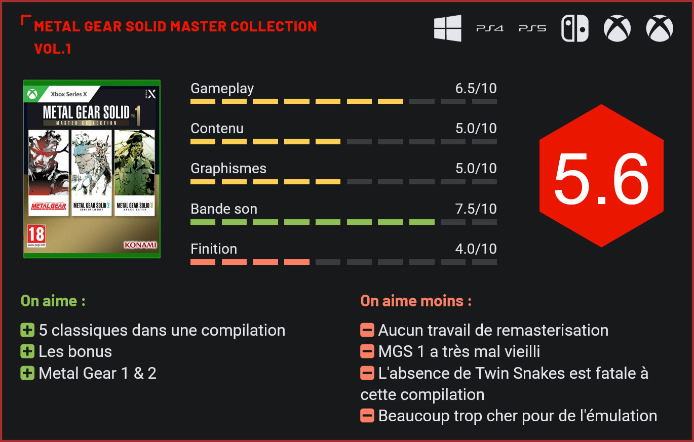 Depuis le départ d’Hideo Kojima de chez Konami, les fans de Metal Gear Solid n’ont pas grand chose à se mettre sous la dent. L’éditeur, qui avait fortement diminué son nombre de productions en interne, offre un revival inattendu à la franchise avec une compilation des cinq premiers volets de la franchise. Après nous avoir livré des compilations des premiers Castlevania et Contra, Konami s’attaque à un autre monument de son catalogue avec une compilation “Metal Gear”, qui comprend les deux premiers épisodes en 2D, ainsi que les trois premiers volets de la série Metal Gear Solid. Le titre de la compilation Vol.1 laisse par ailleurs clairement sous-entendre qu’un second volet verra le jour, avec on l’espère MGS 4 et 5 au programme, en plus de potentiels spin-off. Le premier volet est livré dans on état original. Attendez-vous à un choc graphique… Si les fans seront ravis de pouvoir remettre la main sur ces classiques de l’infiltration, il convient de tempérer les espoirs. Car malheureusement, cette compilation n’apporte aucune modification ni au gameplay ni aux graphismes du jeu. N’espérez pas un affinage des graphismes, il n’y en a pas. C’est tout simplement un gros émulateur qui fait tourner les jeux d’époque. On notera au passage que ce ne sont d’ailleurs pas les rééditions des titres qui sont livrées mais les versions originales. Vous n’aurez donc ni droit à l’excellent remake du premier MGS sorti sur Gamecube ni même au portage sur PC de l’original, en tout point supérieur pourtant à la version PSX… En plus des versions originales des jeux, on retrouve également quelques petits bonus : des artworks inédits, la bande originale du jeu, des “sauvegardes” qui permettent d’accéder à des easter eggs du jeu et… c’est à peu près tout. Les deux premiers Metal Gear sont relativement méconnus des fans de MGS. Assez paradoxalement, ce sont les deux premiers Metal Gear, sortis sur MSX2 à la fin des années 80, qui ont le moins mal vieillis. Deux titres mêlant brillamment action et infiltration, qui dressaient déjà à l’époque le portrait de Solid Snake. Alors bien sûr, il faut davantage les voir comme des bonus qu’une raison de craquer pour cette compilation. De facto, les titres ne correspondent plus du tout aux standards actuels, mais ils offrent la possibilité aux fans de redécouvrir la genèse de la saga. Les choses sérieuses débutent donc avec Metal Gear Solid, sorti à l’époque sur PSX, qui reste sans l’ombre d’un doute le volet le plus emblématique de la saga. Malheureusement aussi, le jeu qui a le plus mal vieilli avec ses graphismes en 3D tout pixélisés. Dans ce volet, très axé infiltration donc, Snake infiltre une base en Alaska pour déjouer les plans machiavéliques d’une organisation terroriste. Avec son scénario riche en rebondissements, ses combats de boss haletants, ses séquences d’infiltration prenantes, MGS 1 reste un monument du jeu vidéo. Mais quelle tristesse que cette pépite n’ait pas eu droit à un remake ou un remaster… Car même pour ceux qui chérissent la franchise, difficile de prendre son pied sur un titre qui souffre autant de son âge. L’affichage 4:3, les bugs, les textures qui bougent à l’écran, les visuels tout pixélisés ne donnent vraiment pas envie de s’y replonger. MGS 2 est l’épisode le plus intéressant de cette compilation. Le choc générationnel est un peu moins marqué avec Metal Gear Solid 2 et 3, sortis sur PS2 et PS3. Bonne nouvelle, ce sont les versions remasters de Bluepoint Games, sorties en 2011, qui ont été retenues. On a donc tout de même droit à du 1080p. Mais pas de 4K ni de 60 FPS en revanche. Et là encore, on constate toute la paresse de l’éditeur, qui se contente du minimum syndical. Alors oui, il est tout à fait possible de redécouvrir MGS 2 et 3 en 2023, sur consoles new gen. Mais très honnêtement, la plupart des joueurs préféreront sans doute attendre le remake du troisième volet qui sortira en 2024. Seul MGS 2 mérite réellement le déplacement, parce que c’est le seul volet de la franchise à ne pas avoir eu droit à un remake au fil des années. MGS 2 et 3 restent en soi des monuments du jeu vidéo, et figurent sans l’ombre d’un doute parmi les meilleurs volets de la saga. Les fans n’ont toutefois pas beaucoup de raison de se tourner vers cette compilation, pauvre en contenus. Il y a certes la BO et les artworks à fouiller, mais côté jeux, on regrette amèrement l’absence du remake du premier épisode, The Twin Snakes, et de remasters sérieux des deuxième et troisième opus, qui auraient mérité un plus gros travail qu’un simple portage d’une version de ces jeux qui date de 2011. MGS 3 aura bientôt droit à un remake. On notera au passage que Konami n’a même pas pris la peine de regrouper tous ses jeux dans un seul hub. Chaque titre sera installé séparément sur votre console et se comportera comme un jeu stand alone… Au final, difficile de ne pas être déçu par cette compilation, qui semble à priori généreuse en contenus avec 5 jeux, plusieurs variantes (versions NES pour les 2 premiers, internationales pour les 3 suivants), pas mal de petits bonus à découvrir, mais qui se veut en réalité très paresseuse, puisqu’il ne s’agit que d’un portage à peine déguise de la MGS Trilogy sorti en 2011, qui aurait troqué l’épisode PSP pour le premier volet de la saga… L’addition est donc salée pour une compilation minimaliste, qui ne fait aucun effort au niveau de la présentation ou du contenu. Espérons que le volume 2 apportera des titres plus intéressants. Conclusion Konami nous livre une compilation extrêmement paresseuse des 5 premiers volets de sa série Metal Gear. Si elle donne l’opportunité de redécouvrir les deux premiers Metal Gear sortis sur MSX, ainsi que les trois premiers Metal Gear Solid, en plus d’une quantité substantiell