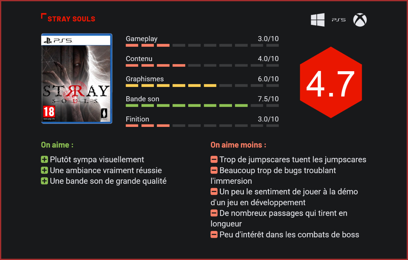 Pour une première production, Jukai Studios s’attaque au survival horror avec Stray Souls. Un Alan Wake-like en beaucoup, mais vraiment beaucoup moins bien. Imaginez. Votre grand-mère décède à un âge plus qu’honorable et vous héritez de sa maison. Lors de votre première nuit, vous faites la connaissance d’une étrange voisine sur un site de rencontre qui semble en savoir plus que vous-même sur l’habitation où se produisent d’étranges phénomènes paranormaux. Pour le commun des mortels, la première réaction logique serait de prendre ses jambes à son cou et d’abandonner la maison. Mais Daniel, lui, veut trouver l’origine du mal qui tourmente sa maison et ce qui est réellement arrivé à sa grand-mère. Voici le postulat de départ de Stray Souls, la première production des Polonais de Jukai Studios, une équipe indépendante “fondée par des vétérans de l’industrie qui ont participé au développement de jeux acclamés par la critique avec une spécialisation dans le genre de l’horreur. Leur mission est de susciter la prochaine évolution des médias d’horreur”, explique le site internet. Dans son gameplay et son approche du style du survival-horror, Stray Souls nous fait directement penser à un certain Alan Wake. Vous progressez dans des environnements naturels, sombres et hostiles, peuplés de créatures maléfiques qui veulent votre peau. Équipé d’une lampe torche (inutile ici, si ce n’est pour éclairer) et d’un pistolet à la maniabilité catastrophique, votre personnage se bat pour sa survie. Stray Souls est fort d’une ambiance et d’un univers au poil, bien qu’un peu intrigants par moments. Si nous reviendrons sur le gameplay plus tard, pointons tout de même l’excellente ambiance dans laquelle nous berce le jeu. C’est probablement le seul point fort du jeu, et il est plutôt particulièrement important. Dès le début, avec une cinématique d’introduction forte, dérangeante mais intrigante, Stray Souls pose les bases d’un scénario troublant et d’un univers complètement barré. On ne se sent jamais réellement à l’aise face à cette ambiance empreinte de satanisme et d’horreur. Toutefois, en ayant voulu faire peur aux joueurs, les développeurs ont peut-être poussé le curseur des jumpscares un peu trop loin. Ils en ont clairement abusé, certains devenant même prévisibles et risibles. On est donc bercés dans cet environnement stressant, même s’il nous arrive de rigoler face au non-sens de certains détails. Une ambiance excellente donc, aidée par des compositions musicales réalisées par Monsieur Akira Yamaoka, compositeur de légende des Silent Hill. Et pour cause, tout au long de notre aventure, nous avons été subjugués par la justesse et la qualité des mélodies. En revanche, le titre n’est aucunement doublé en français, nous laissant avec de tristes sous-titres en français… Le level-design est catastrophique. Prenons en exemple le passage vers le cimetière lorsqu’on se retrouve seul dans un bois face à ces drôles de créature. Si l’on excepte le fait qu’on ne voit rien à plus de trois mètres, la construction du bois est totalement ratée. On erre pendant plus d’une dizaine de minutes sans trop savoir vers où, dans des niveaux qui donnent l’impression d’être totalement ouverts et qui se ressemblent tous les uns les autres. C’est le cas également pour les cinématiques. Celles-ci traînent inutilement en longueur, avec des dialogues à rallonge qui n’ont que peu d’intérêt alors que ça pourrait aller plus vite et aider à accélérer le rythme. La maniabilité du pistolet et de notre héros, Daniel. Niveau gameplay, Stray Souls nous met donc dans la peau de Daniel, armé d’un pistolet pour se défendre contre les étranges créatures qui pourraient vous en vouloir. Impossible pour le jeune homme, qui fête ses dix-huit ans durant l’aventure, de se défendre avec un coup de pied ou autre, les seuls gestes qu’il puisse faire étant une roulade par esquive ou courir. Honnêtement, rien de positif n’est à souligner dans le gameplay. Les déplacement de Daniel sont très lourds et ultra désagréables. Absolument pas fluides, ils sont très compliqués à coordonner lorsqu’il faut éviter les attaques d’un ennemi ou d’un boss. Le pire est probablement le dégainement de l’arme, qui ne peut se faire qu’en effectuant une combinaison de touches. On oublie ainsi régulièrement de dégainer avant de commencer à viser, nous rendant alors totalement vulnérable pour l’ennemi. Les hitboxes sont également hasardeuses, puisque même si l’on tire à côté d’un ennemi, celui-ci est touché… Nous évoquions justement les boss. Ceux-ci sont totalement dépourvus d’intérêt. À l’instar d’un gros méchant des plus banals, il suffit juste de les éviter et d’enchaîner les coups de feu dans leur direction. Ils disposent tout simplement d’une barre de vie plus conséquente que les plus petits ennemis, mais c’est tout. Leur pattern de coups est totalement vide, se contentant de foncer vers nous et de nous attaquer. Notre seule mission étant alors d’éviter puis de tirer sur ces ennemis vides de sens. Visuellement certains panoramas et décors sont franchement réussis. Vide, c’est l’adjectif que nous utiliserons pour définir Stray Souls. Les nombreuses énigmes mises sur notre route sont assez bien cherchées, quoique souvent tirées par les cheveux et sans logique. Elles sont mêmes en anglais, ce qui n’est pas toujours évident pour ceux qui ne maîtrisent pas la langue de Shakespeare. D’ailleurs, le jeu est entièrement en anglais, avec du sous-titrage en français. C’est bien simple, la production de Jukai a plutôt des allures de démo ou de jeu en accès anticipé plutôt qu’un titre fini et commercialisé. Vendu tout de même 30€ au prix plein, il ne se boucle qu’en moins de cinq heures et est parsemé de bugs e
