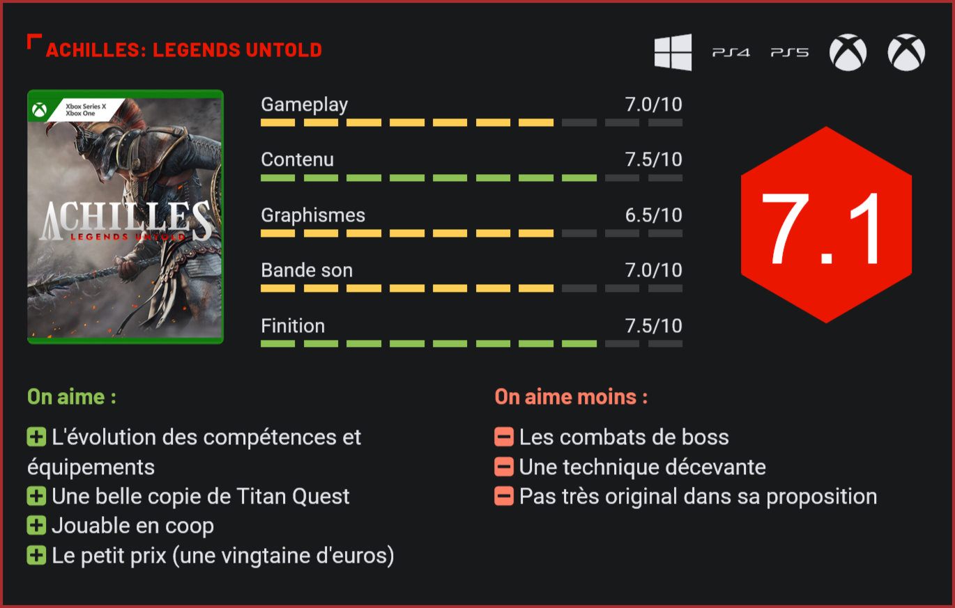Marchant sur les traces d’un Titan Quest, Achilles: Legends Untold est un hack & slash ambitieux, qui nous fait redécouvrir l’histoire de l’un des plus célèbres guerriers de la Grèce Antique. Sorti il y a plus d’un an en accès anticipé, Achilles: Legends Untold avait reçu un accueil glacial de la part des médias spécialisés, et pour cause puisque le jeu avait été livré dans un état peu recommandable. Truffé de bugs jusqu’à l’os, le jeu de Dark Point Games a heureusement eu droit à de nombreux patchs et updates depuis. Le voilà donc qui débarque enfin dans sa version finale plus d’un an plus tard. Et s’il est loin d’être parfait, le titre de Dark Point Games n’en est pas moins aujourd’hui un titre plutôt plaisant à parcourir. Visuellement, le jeu est très correct. Il conviendra d’entrée de jeu de le préciser : Achilles n’est pas un jeu triple-A mais une petite production indépendante vendue une vingtaine d’euros seulement. Il ne faut donc pas s’attendre à des miracles dans l’enrobage. Comprenez par là la réalisation technique – ceci dit très décente -, la narration, les doublages et la mise en scène générale. Ceci étant dit, les développeurs ont fait des efforts considérables pour se rapprocher au maximum d’une grosse production. Il y a des cinématiques, des doublages, quelques cut-scenes entre les séquences d’action et d’exploration. Les doublages sont d’ailleurs très corrects, mais il ne faudra pas s’attendre à croiser des grands noms. Il en va de même pour les cinématiques, décentes pour donner un contexte, mais pas forcément passionnantes à suivre. L’équipement est entièrement personnalisable, et upgradable grâce aux matériaux récupérés. Côté gameplay en revanche, très peu d’éléments séparent Achilles d’un hack & slash triple-A. Legends Untold a tout d’un Titan Quest. Si le jeu est assez linéaire dans sa progression, il nous laisse explorer librement des zones de jeu assez vastes dans lesquelles on pourra découvrir des micro-donjons et des tas de trésors. Le jeu n’y va pas de main molle au niveau du loot. Vous pourrez non seulement récupérer de nouvelles armes et équipements, mais également mettre la main sur des pièces d’or et surtout des matériaux de différents types qui vous permettront d’augmenter le niveau de vos armes. Comme Titan Quest, Legends Untold mise beaucoup sur les combats. Le jeu est à la fois accessible et exigeant. Accessible car il propose un mode facile et quelques aides contextuelles. Par exemple, vous saurez quel comportement adopter en observant la jauge qui apparaîtra au-dessus d’un ennemi. Si elle est blanche, vous pourrez parer le coup et contre-attaquer. Si elle est rouge en revanche, le coup ne pourra pas être paré et il faudra réaliser une esquive. Et mine de rien, lorsqu’on passe à un niveau de difficulté supérieur, le jeu se montre assez exigeant. Quelques coups suffisent à nous mettre au tapis et surtout les ennemis sont assez costauds. Heureusement, vous disposerez d’un stock de potions assez important, qui vous permettra de récupérer assez rapidement votre santé. Le bestiaire comprend de nombreuses créatures mythologiques. Pad en main, Achilles ressemble beaucoup à un Titan Quest, à ceci près que notre personnage devra être beaucoup plus mobile ici. Il est indispensable de jouer avec les contres et les esquives, un peu à l’image d’un Dark Souls. S’il est finalement très classique dans son approche du genre et sa progression, Legends Untold a le mérite de proposer une gestion d’équipement et des compétences assez poussée. Concrètement, vous aurez accès à un large panel d’armes, qui vont de l’épée à la masse en passant par la lance. Chacun se contrôle différemment, a des avantages et défauts, et est upgradable grâce aux matériaux récupérés. L’arbre de compétences est également étonnamment vaste et permet de débloquer de nouvelles techniques mais aussi et surtout d’augmenter ses performances tout au long de l’aventure. On sent dès lors une vraie montée en puissance du personnage. Globalement très plaisant à parcourir, Legends Untold conserve toutefois quelques défauts qui peuvent être cause de frustration. Les combats de boss par exemple ne sont pas forcément les plus passionnants, la faute à des patterns très grossiers. L’IA n’est pas hyper réactive non plus. Et puis il y a bien sûr ce côté assumé de la petite production indépendante qui fait que côté présentation, ça reste très léger. Reste qu’en l’absence de multiples concurrents, Legends Untold reste un titre plaisant qui mérite le détour. Après tout, rares sont les hack & slash à nous faire plonger dans la mythologie grecque. Et s’il est imparfait par essence, Legends Untold a l’avantage d’être un “petit jeu pas très cher”, qui vous occupera un gros weekend et qui a de surcroit le mérite d’être jouable en coop. Alors, pourquoi se priver ? Conclusion S’inspirant assez ouvertement de Titan Quest, Achilles: Legends Untold est un hack & slash très agréable qui nous propose de nous plonger dans la mythologie grecque. S’il reste très classique dans sa progression, le jeu est plutôt plaisant à parcourir grâce à son gameplay exigeant, son bestiaire assez varié mais surtout son système d’évolution des compétences et de l’équipement qui lui donnent un petit côté RPG pas déplaisant. Vendu une vingtaine d’euros, ce petit jeu indépendant parvient pratiquement à égaler des jeux double-A. Il ne faudra toutefois pas en attendre de trop de la narration et de la technique, très décente ceci dit pour une petite production puisqu’on a même droit à des doublages et cinématiques.