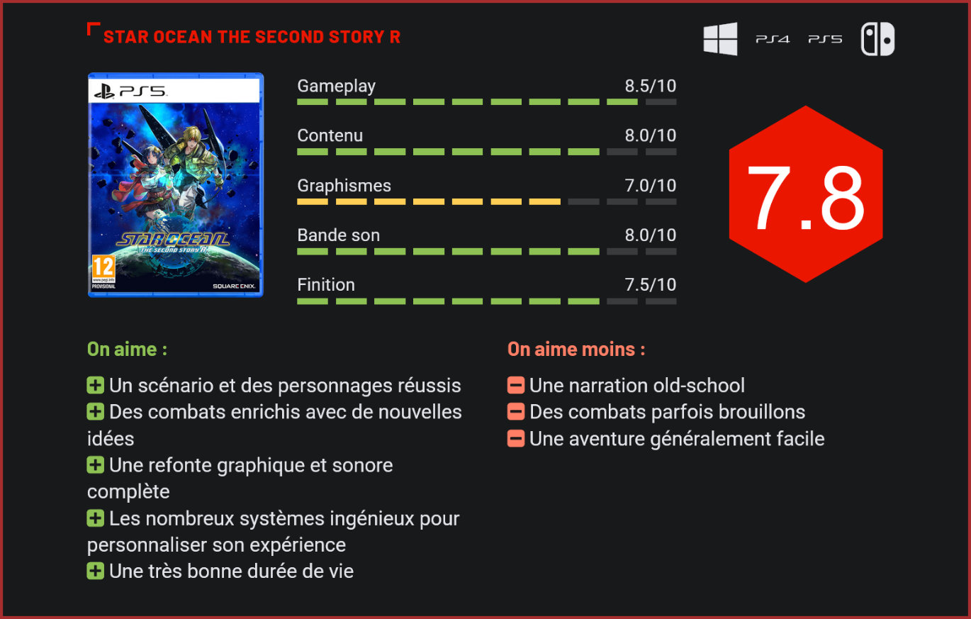 Alors que le dernier épisode de la licence Star Ocean vient de fêter son premier anniversaire, Square Enix nous propose de redécouvrir le second jeu paru originellement sur Playstation en 1998. Ce remake tout neuf permet à la majorité de la série d’être disponible sur nos consoles modernes. Alors que le tout premier Star Ocean a bénéficié d’un remake en 2019, Square Enix propose cette fois de redécouvrir le second épisode de la licence d’Action-RPG de tri-Ace. Originellement sorti en 1998 sur Playstation, Star Ocean : The Second Story était le tout premier épisode de la série à atteindre l’Europe, le succès de Final Fantasy VII à l’international ayant fait comprendre aux éditeurs japonais que l’occident était aussi un public potentiel pour leurs RPG. À l’époque publié par Enix, cet épisode est devenu une petite pépite de la ludothèque de la première machine de Sony puisqu’il est souvent reconnu comme étant le meilleur opus de la licence. Si ce second jeu a déjà eu droit à une refonte sur PSP, le travail a été repris à zéro pour cette toute nouvelle version “R”, cette fois développée par le studio Gemdrops. Tout comme plusieurs épisodes de la licence, The Second Story mélange de l’heroic fantasy et de la science-fiction en proposant deux protagonistes aux points de vue différents. Le quotidien de l’un est composé de technologies et de vaisseaux spatiaux, tandis que l’autre vit sur une planète alors dans une relative ignorance de ce qui se déroule au-delà de la stratosphère. Nous suivons les aventures de Claude C. Kenny et de Rena Lanford. Le premier est le fils de l’un des protagonistes du jeu précédent qui s’est accidentellement retrouvé sur Expel, une planète qu’il ne connaît pas, tandis que la deuxième est une habitante de cette même planète et qui possède un mystérieux pouvoir de guérison. Ensemble, ils vont explorer le monde pour percer les mystères qui entourent Rena et pour essayer de trouver un moyen pour Claude de rejoindre l’espace. La planète Expel s’explore à travers une carte du monde classique. Si quelques liens sont tracés avec le tout premier jeu de la licence, il n’est cependant pas nécessaire d’en connaître les tenants et les aboutissants pour profiter pleinement de The Second Story. Le scénario se concentre sur ces nouveaux protagonistes et leur groupe d’aventuriers qui s’agrandit au fil du jeu. L’intrigue est très sympathique à suivre, de même que les personnages qui bénéficient de beaucoup de développement grâce à des interactions optionnelles durant l’entièreté du jeu. La narration reste un peu vieillotte, mais les dialogues sont doublés en anglais ou en japonais, ce qui donne un peu de vie à ces personnages représentés en 2D, comme à l’époque. Nous n’avons aucun doute sur le fait que cette version “R” puisse réellement être qualifiée de “remake”. Un simple coup d’œil à ce nouveau jeu permet de s’assurer que, à l’exception des personnages tout en pixel art directement tirés de la version originale, l’entièreté du jeu a subi un véritable travail graphique. Les villes et les donjons sont entièrement remodelés pour en faire des espaces un peu plus vastes. Le style visuel se démarque un peu du fameux “HD-2D” utilisé récemment par Square Enix en proposant des décors modélisés en 3D et texturés de manière plus “réaliste”. Le mélange avec les personnages tout en pixels est particulier, mais loin d’être déplaisant. La très bonne bande-son du jeu original est également modernisée pour l’occasion. Cette nouvelle version arrive à conserver un aspect old-school tout en lui donnant un air moderne. Le système de combat est simple et efficace. Côté gameplay aussi, le titre apporte de la modernité tout en conservant la formule originale. À la manière d’un Tales of, le jeu mélange les habitudes des JRPG traditionnels avec un côté “action”. Entendez par là que nous voyageons sur une carte du monde où se trouvent des villes et des donjons à explorer. Une fois entré en contact avec un ennemi, le jeu transitionne vers une zone de combat où nous avons le contrôle direct de l’un des personnages de notre équipe, trois autres étant gérés par le jeu. Le système de combat n’est pas bien complexe et parfois un peu brouillon, mais permet des affrontements agréables et généralement rapides. Nous pouvons ainsi attaquer, esquiver et lancer des attaques spéciales coûtant des points de magie. Plusieurs nouveautés apportent un peu plus de possibilités, il est par exemple possible d’appeler l’un des membres du groupe en réserve pour lancer une unique attaque dévastatrice, ou encore de briser la garde des ennemis sous certaines conditions. Chacun des personnages peut être amélioré dans différentes catégories grâce à des points obtenus en combat. Le titre propose également un autre système particulièrement riche, celui des “spécialités”. En échange d’une autre sorte de points obtenus en combat, chaque personnage peut devenir expert dans différents domaines comme la cuisine, la biologie, la forge, la botanique… Une fois des points investis dans ces métiers, nous pouvons alors accéder à la spécialité liée qui ouvre d’autres possibilités telles que plusieurs systèmes de craft ou d’amélioration d’équipement, la capacité d’envoyer des animaux chercher des objets dans d’autres villes, créer une copie d’un objet existant… Les spécialités ne s’arrêtent pas là puisqu’elles permettent aussi d’utiliser des modificateurs de jeu divers, comme une augmentation d’expérience en échange d’un malus de statistique, ou la diminution d’apparition des ennemis… Plusieurs quêtes secondaires sont proposées durant l’aventure. Les différents systèmes de ce Star Ocean sont riches et permettent une expérience modulable. Il est par ex