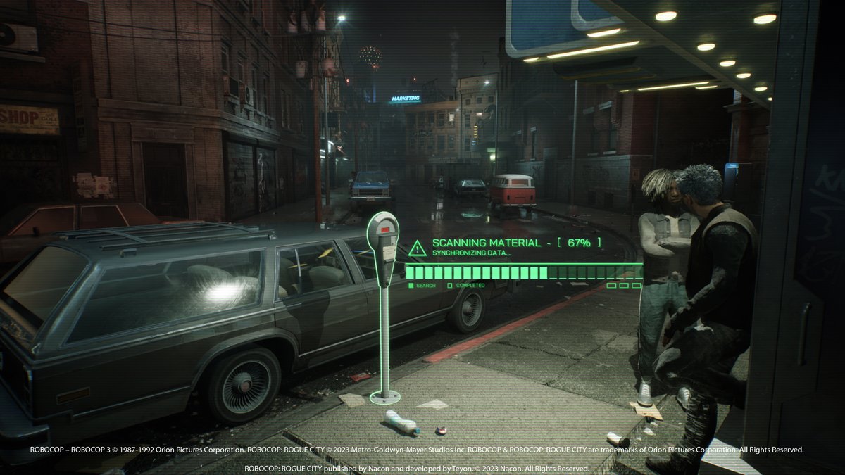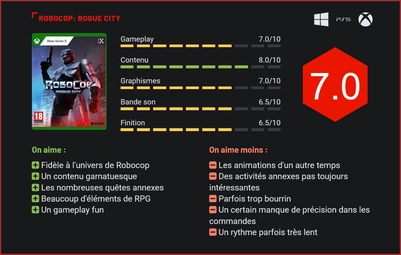 Après Rambo et Terminator, le studio Teyon s’attaque à un autre monument de la pop-culture en nous livrant une nouvelle adaptation de Robocop en jeu vidéo. Moqué il y a de cela plus d’une dizaine d’années pour sa très médiocre adaptation de Rambo en jeu vidéo, le studio polonais Teyon était parvenu à agréablement nous surprendre avec Terminator Resistance, un jeu de tir à la première personne qui prenait place dans l’univers de Terminator. Le studio a attiré l’attention de Nacon, qui lui a confié un nouveau projet ambitieux de FPS dans l’univers de Robocop. C’est ainsi que Rogue City est né, potentiellement le projet le plus ambitieux du studio polonais. Le jeu est extrêmement fidèle aus films, jusque dans le système de visée. Et le moins que l’on puisse dire, c’est que si vous aviez joué au très sympathique Terminator Resistance, vous saurez précisément à quoi vous attendre puisque Robocop Rogue City en reprend pratiquement la formule dans les moindres détails. On est ici face à un FPS narratif qui donne une certaine liberté au joueur puisque le jeu emprunte certains éléments au genre des RPG. On retrouve un système d’évolution des compétences, des dizaines de quêtes annexes, des PNJ à qui parler, des histoires à découvrir… comme dans un RPG. La violence est omniprésente. Et c’est sans aucun doute ce qui fait le charme de ce FPS narratif, qui se démarque des autres jeux de tir par la multitude d’activités annexes, de dialogues et de PNJ qu’il propose… Comme Terminator Resistance, Robocop vous plonge dans des mini mondes-ouverts dans lesquels vous pourrez évoluer librement. Vous pourrez choisir ainsi d’aller droit au but pour réaliser la mission principale, d’explorer les décors, de réaliser des missions annexes, et même de coller des contraventions aux citoyens étourdis qui ont mal garé leurs véhicules… Les à-côtés sont vraiment nombreux et contribuent beaucoup à l’immersion dans l’univers de Robocop. Au commissariat, véritable hub central du jeu, vous vous verrez aussi confier de nombreuses missions secondaires parfois sans aucun intérêt si ce n’est à vous faire interagir avec certains PNJ que vous n’aviez pas encore croisés. Il faudra ainsi régulièrement aider l’accueil du commissariat en vous entretenant avec des citoyens qui viennent demander de l’aide pour diverses affaires. Vous pourrez aussi vous entrainer au stand de tir pour tenter de décrocher un meilleur résultat. Côté gameplay, Rogue City est un FPS plutôt brutal. De facto, vous incarnez ici une véritable machine de guerre, capable d’endurer de multiples coups avant de s’effondrer, mais aussi d’empoigner vos ennemis pour les faire valdinguer dans les airs, de porter un container pour le jeter à la figure d’un groupe de malfrats. Il ressort réellement une sensation de surpuissance. L’ennui, c’est que notre personnage est assez lent et rigide – fidélité au matériau d’origine oblige. Robocop est une machine de guerre, un véritable tank. Les environnements offrent beaucoup de liberté dans l’exploration. Les missions principales mettent clairement l’accent sur les combats et des enquêtes également. Si les combats sont plutôt réussis, on regrette la rigidité de Robocop, des animations en général, et surtout le cheminement très dirigiste des missions. Robocop se transforme très souvent en un shooter bête et vilain qui se joue en ligne droite. C’est fun, mais à petite dose. Pour varier les plaisirs, les développeurs ont tenu à ajouter tout un tas de séquences plus variées, comme des dialogues interactifs, qui permettront d’améliorer vos relations avec certains PNJ, des séquences d’enquête aussi, durant lesquelles vous devrez scanner divers éléments du décors pour retrouver des indices. Sans oublier bien sûr du loot. L’ennui, c’est que si tout cela apporte certes de la diversité, ces séquences de jeu sont globalement très fades. Robocop brille au final par la richesse de ses niveaux, qui regorgent de missions annexes à découvrir et qui jouent à fond la carte du fan-service. Le titre parvient également à joliment se renouveler dans son gameplay à nous confrontant à diverses sortes de nouveaux ennemis : des soldats qui appelleront des renforts, des lance-grenades, des motards qui vous écraseront avec leurs bécanes… Le “bestiaire” est étonnamment varié. Côté scénario aussi, Robocop: Rogue City se veut extrêmement fidèle au matériau d’origine et parvient à nous immerger dans une intrigue prenante, qui nous fera redécouvrir l’histoire de Robocop sous un nouvel angle. Les développeurs misent énormément sur les dialogues et les interactions avec les PNJ pour nous faire explorer l’univers de Robocop, à la façon d’un RPG, et ça marche plutôt bien. Par ailleurs, on lui reprochera tout de même un rythme très haché. On enchaine parfois les frags pendant 20 minutes sans aucune interruption pour ensuite ne plus tuer aucun ennemi pendant plus d’une heure… Il faudra régulièrement scanner les environnements. Généreux en contenu avec son mode solo bourré de missions secondaires, Rogue City est donc un FPS plutôt solide, qui brille par sa fidélité à l’univers des films et sa réalisation globale, plutôt maîtrisée. Le jeu est “new gen only”, plutôt joli avec de superbes effets de reflets, des décors qui se pulvérisent de partout et du ray-tracing à gogo. Mais il est loin d’exploiter le potentiel des machines, avec des modélisations parfois très sommaires, notamment des visages, qui manquent cruellement d’expressions faciales. Le plus gros reproche qu’on lui adresserait concerne toutefois la précision des commandes. Même en tentant plusieurs configurations, il nous a été très difficile de trouver quelque chose qui nous convienne dans la sensibilité des sticks. On ressent tout le temps des petits effet