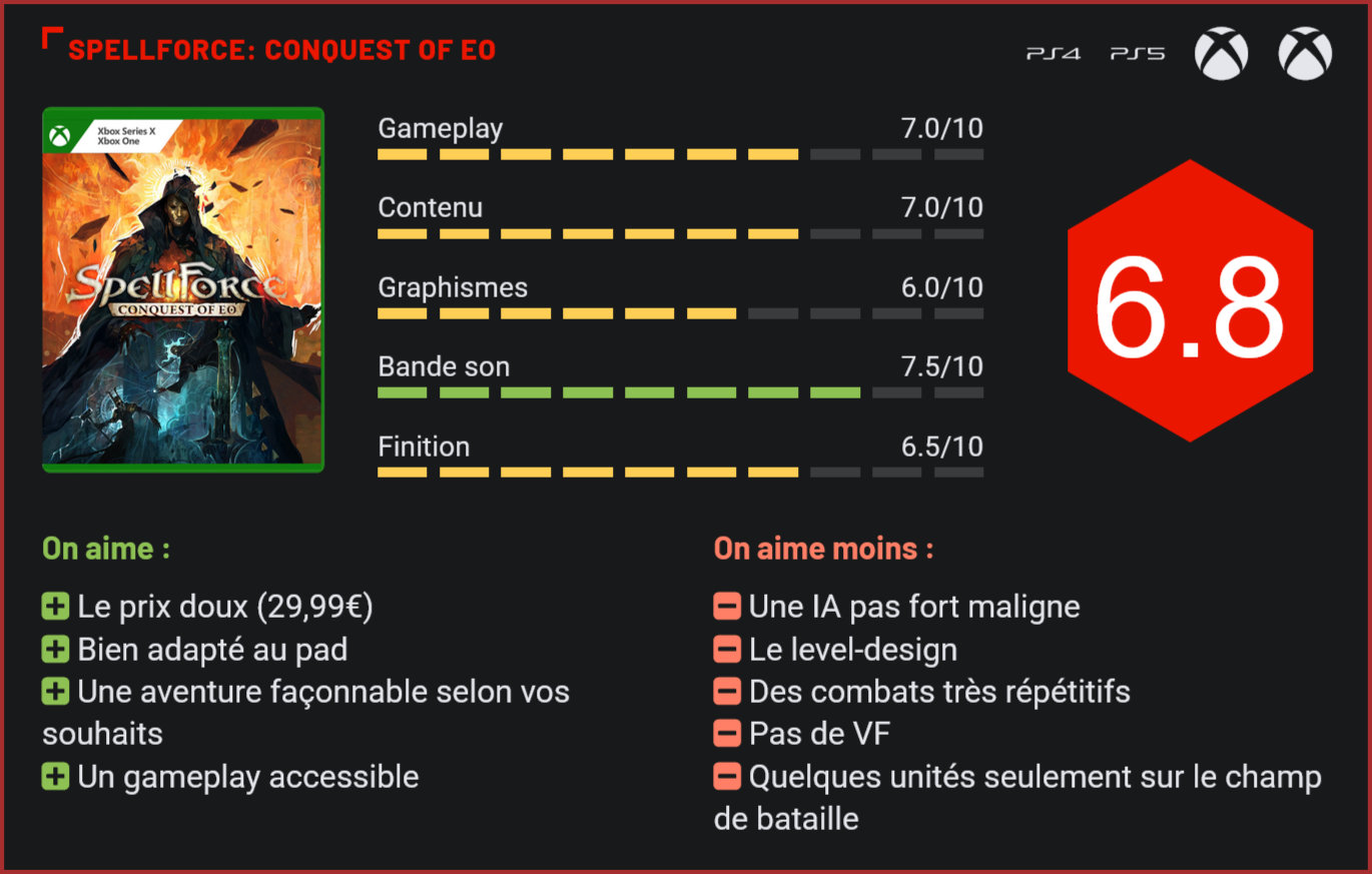 Sorti en début d’année sur PC, Spellforce Conquest of Eo a aujourd’hui droit à une sortie sur consoles de salon. Il y a déjà deux décennies que la franchise SpellForce a vu le jour. Moins célèbre et populaire que des titres comme Civilization et d’autres jeux de stratégie 4X, cette série créée par Phénomic Game Development et Encore, Inc en 2003 a réussi à cultiver une base de fans solide. Ces fans sont restés fidèles à cet univers enchanteur au fil des ans, bien que la franchise ait légèrement dévié de sa formule originale avec Conquest of Eo, en mettant davantage l’accent sur la stratégie au détriment du jeu de rôle. EO ne se joue pas en temps réel mais au tour par tour. Avec Conquest of Eo, la franchise SpellForce vous offre la possibilité d’incarner un héros choisi parmi trois classes disponibles : Nécromancien, Artificier et Alchimiste. Le Nécromancien se spécialise dans la magie noire et dirige une armée de morts-vivants, l’Artificier crée des explosifs et des potions, tandis que l’Alchimiste confectionne des objets magiques pour équiper ses troupes. Malgré ces différences de classe, l’objectif reste le même : poursuivre la quête de votre maître à la recherche de la source ultime de magie, le Feu éternel. Conquest of Eo s’apparente en quelque sorte à un jeu 4X et est relativement facile à prendre en main. L’avantage de ce jeu est que vous avez la possibilité de personnaliser votre expérience de jeu. Vous pouvez choisir parmi plusieurs cartes du monde, chacune représentant un niveau de difficulté, et combiner différentes conditions de victoire pour créer votre propre expérience. Cela signifie que chaque partie que vous jouerez sera légèrement différente des précédentes, même si l’histoire reste la même, quelle que soit votre approche. Visuellement, le jeu est décent, mais ne brille pas forcément. À l’instar de Civilization, les ressources jouent un rôle clé dans SpellForce. Vous collectez de l’or, accumulez des points de recherche et créez de nouvelles unités ou objets depuis la tour de votre maître, qui sert de quartier général. Ces ressources vous permettent d’améliorer vos forces de morts-vivants, de créer des potions plus puissantes et de fabriquer des glyphes pour renforcer vos troupes. Vous devez gérer la tour et ses ressources tout en défendant vos intérêts sur le champ de bataille ou en collectant des ressources. Les combats se déroulent au tour par tour, à la manière des jeux 4X classiques. Ils sont basés sur des points d’action, mais le jeu reste accessible aux débutants. Les combats peuvent devenir complexes si vous ne prenez pas les bonnes décisions, mais heureusement, l’intelligence artificielle est relativement limitée, ce qui vous permet de rectifier le tir et de l’emporter. Cependant, les combats peuvent devenir répétitifs en raison du nombre limité d’unités disponibles (généralement entre quatre et huit unités par bataille) et de leur résolution rapide. Déjà très accessible sur PC, le jeu se joue très bien au pad, car ici on ne dirige pas de grandes armées et les menus restent légers en contenus. C’est typiquement le genre de jeu de stratégie auquel on peut jouer sur consoles également. Le scénario de SpellForce s’inspire grandement des jeux 4X tels que Civilization, tandis que l’univers rappelle davantage celui de Heroes of Might & Magic. Le scénario est bien construit et plonge les joueurs dans un univers heroic fantasy. Cependant, les décors, bien que jolis, manquent de détails et d’éléments, ce qui est dommage compte tenu du potentiel de l’univers heroic fantasy. La bande son du jeu est agréable à l’oreille, mais le jeu ne propose malheureusement pas de traduction en français, y compris pour le doublage. Les menus ne sont pas non plus traduits en français, ce qui peut être un obstacle pour les francophones non anglophones. Visuellement non plus il ne faudra pas s’attendre à une claque. Le jeu est correct graphiquement, mais loin de briller. Comme on l’a dit plus haut, Conquest of Eo est un spin-off de la série des Spellforce et est proposé à un tarif très correct (29,99€). Il s’apparente davantage à une expérience indé du studio, qui devrait plutôt réjouir les fans, même si le titre manque de profondeur et de richesse pour réellement marquer les esprits. Face aux autres 4x, il faut bien l’avouer, Conquest of Eo ne tient pas la comparaison. Ceci étant dit, il n’existe pas non plus des milliers de références sur ce marché… Conclusion Spin-off de la série des SpellForce, Conquest of Eo propose une expérience de jeu différente avec ses combats au tour par tour, qui s’inspirent des jeux tels que Might & Magic. Accessible aux débutants, le jeu a le mérite de proposer un univers riche et attrayant. Le jeu délaisse en grande partie l’aspect RPG au profit d’un gameplay à la manière de Civilization, indiquant ainsi une intention claire d’attirer un public qui n’a jamais eu d’expérience préalable avec SpellForce. Les combats sont accessibles aux débutants, mais ils se concluent malheureusement rapidement. Avec seulement de 4 à 8 unités sur le champ de bataille, le jeu peut sembler limité pour un jeu de stratégie. La difficulté peut parfois être présente, mais la simplicité de l’IA permet à quiconque de se lancer dans Conquest of Eo. Bien que l’univers du jeu soit prometteur, nous regrettons qu’il n’ait pas été suffisamment exploité dans la conception des niveaux, qui nous semblent trop fades. Autre gros défaut du jeu : il est intégralement en anglais. Si vous parlez sans difficulté la langue de Shakespeare et que vous parvenez à fermer les yeux sur ses nombreux petits défauts, le jeu en vaut toutefois la chandelle, surtout au prix auquel il est proposé (29,99€).