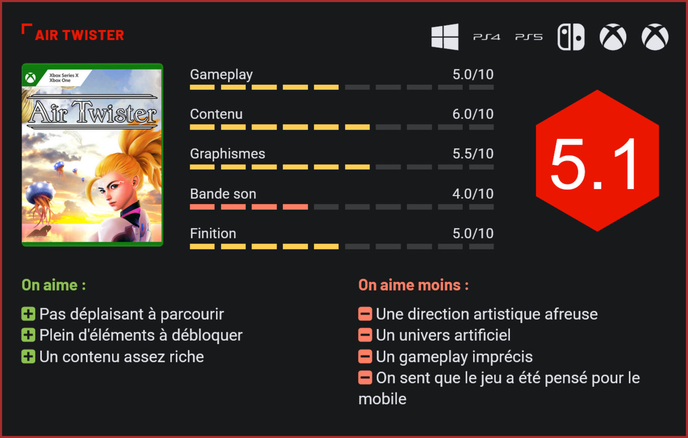 Nouvelle création du légendaire Yu Suzuki, le “papa” de Virtua Fighter et Shenmue, Air Twister intriguait beaucoup les gamers. Avant de sortir sur consoles, le titre avait toutefois vu le jour sur smartphones en 2022. Parmi ces créations spécifiquement conçues pour remplir le catalogue d’Apple Arcade, Air Twister n’aura finalement pas beaucoup fait parler de lui malgré la notoriété de son créateur. Il faut que dans le secteur, les jeux mobiles n’ont pas forcément bonne réputation. Rares sont d’ailleurs les productions destinées au catalogue d’Apple Arcade à avoir droit à un portage sur consoles… Visuellement le jeu n’est pas vraiment une claque. Air Twister fait donc figure d’exception et sans doute pour une bonne raison puisqu’il s’agit d’un shoot them up arcade dans la droite lignée d’un Panzer Dragoon. Dans les grandes lignes, le jeu de Yu Suzuki propose d’ailleurs une expérience relativement similaire avec un système de lock des adversaires, le suivi d’un trajet prédéfini (le joueur dirigeant le personnage à l’écran mais pas sa trajectoire), des niveaux qui se terminent par un combat de boss… Bref, rien de très original mais une recette qui fonctionne. Il faudra toutefois garder ceci à l’esprit : le jeu est issu du monde du mobile et souffre dès lors de quelques défauts rédhibitoires de ce type de production. Par exemple, un certain manque de précision dans les commandes, des niveaux très courts et un niveau de difficulté par défaut assez bas… En d’autres termes, c’est un peu Panzer Dragoon version fast-food et c’est bien dommage car les shmups sont typiquement le genre de jeux qui visent plutôt les passionnés. L’univers graphique manque cruellement de personnalité. Cela ne veut pas dire qu’il n’y a pas là de bonnes idées. Par exemple, on récupère des points qui permettent de débloquer des équipements pour notre personnage, de changer son look, de débloquer de nouvelles armes et d’améliorer ses stats. Le système est plutôt bien pensé car tout cela nous pousse à rejouer plusieurs fois l’histoire. Les à-côtés sont également nombreux avec plein de modes de jeu alternatifs, dont des défis. L’ennui, c’est que pad en main, on a beaucoup de mal à s’immerger dans cet univers coloré et féérique au design sans grande inspiration. C’est plat, vide et atrocement artificiel. Les sensations ne sont également pas du tout au rendez-vous la faute à un système de visée lent et mal fichu, à un réel manque de précision dans les commandes et à un bestiaire d’une pauvreté abyssale. A par les boss, il faut bien avouer que les ennemis sont assez moches. Tirer sur des sphères ça n’a jamais été très fun… L’univers graphique manque cruellement de personnalité. En définitive, Air Twister est un shoot them up très moyen, pas désagréable à parcourir et qui propose même un contenu assez riche, mais qui ne brille ni par son gameplay, ni par sa réalisation ni même par son univers atrocement vide et artificiel. Pas sût que les fans de Space Harrier et Panzer Dragoon y trouveront chaussure à leur pied. Conclusion Développé spécifiquement pour le catalogue Apple Arcade, Air Twister est un shoot them up dans la droite lignée de Panzer Dragoon qui n’est toutefois qu’une pâle copie de son modèle, la faute à un gameplay imprécis, un univers aseptisé et artificiel, et un concept de jeu mobile, avec des séquences de jeu excessivement courtes. S’il n’est pas excellent, le jeu n’est toutefois pas inintéressant à parcourir, et se révèle même plaisant sur la durée avec les nombreux contenus à débloquer. Il y a là quelques très bonnes idées. Dommage toutefois que les développeurs se soient contentés d’un simple portage de la version mobile.