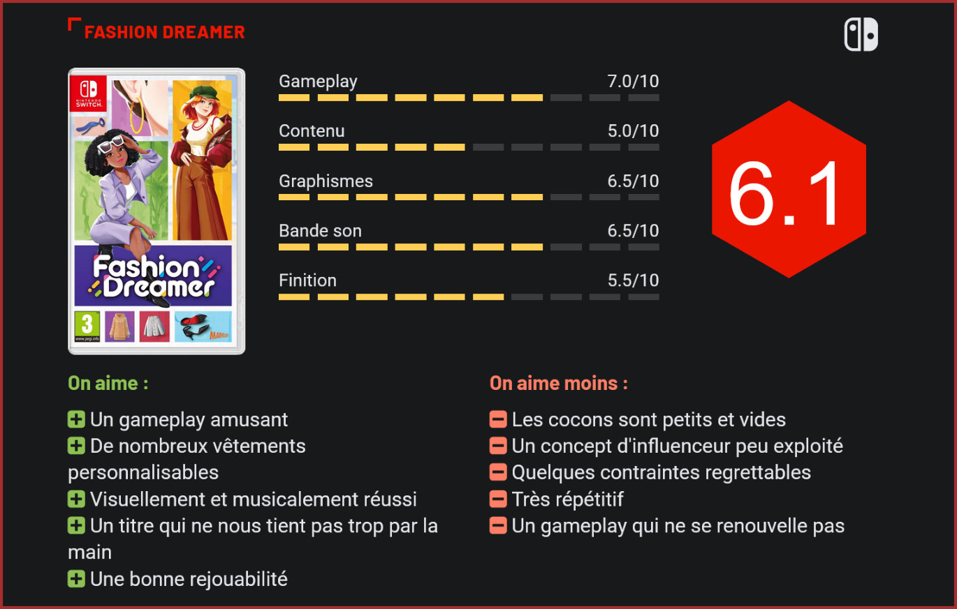 Les développeurs de la série “La Maison du style” reviennent avec un tout nouveau titre pour la première fois depuis 2017. Si la licence n’est pas réellement de retour, la Switch a tout de même droit à un successeur spirituel qui risque, malheureusement, de décevoir les fans de la série. Joli succès durant l’époque des Nintendo DS et 3DS, la licence “La Maison du style” s’est imposée avec des jeux très solides pour celles et ceux qui apprécient l’univers de la mode. Les différents épisodes de la série nous proposaient généralement d’incarner la gérante d’une boutique de mode qui doit organiser son commerce et conseiller au mieux ses clients. La licence était alors une collaboration entre Nintendo et les développeurs japonais de chez Syn Sophia. Ce début novembre a marqué l’arrivée d’une nouvelle production des mêmes développeurs, mais cette fois sans l’édition de Nintendo qui cède sa place à Marvelous. Ce “Fashion Dreamer” n’est donc pas une suite officielle de La Maison du style, mais propose une expérience qui s’en rapproche. Malheureusement, ce nouveau titre se montre beaucoup moins convaincant que ses prédécesseurs. Le monde d’Eve est charmant, mais un peu vide. Dans Fashion Dreamer, nous incarnons une “muse”, un personnage féminin ou masculin que nous allons créer de toute pièce. Ce dernier se retrouve dans le monde d’Eve, un univers virtuel uniquement dédié à la mode et dans lequel les gens peuvent exprimer leur identité à travers leur look. Nous débarquons alors dans l’une des quatre zones, aussi appelés “cocons”, dans le but de créer notre propre marque de vêtements et devenir influenceur sur le réseau social intégré à cet univers. Si certains épisodes de La Maison du style proposaient un scénario et des personnages, Fashion Dreamer ne s’encombre pas de tout cela et ne propose que son gameplay. Le titre débute sur un tutoriel d’une petite heure avant de nous laisser entièrement libres de nos actions. Cette liberté est appréciable, même si un peu plus de contexte n’auraient pas été de trop dans ces quatre mondes visuellement charmants, mais qui manquent aussi beaucoup de vie, en plus d’être ridiculement petits. Si le titre s’en sort plutôt bien graphiquement et même au niveau sonore avec des morceaux sympathiques à écouter, les tâches qui vous attendent se résument à peu de choses. Relooker les personnages reste une activité amusante. Nous commençons l’aventure avec l’inventaire vide, et pour le remplir, il va falloir laisser des “J’aime” aux personnages que l’on peut croiser, nous permettant d’obtenir les mêmes vêtements. D’autres habits peuvent être obtenus de différentes manières comme en participant à des loteries ou gratuitement dans des zones d’affichage. En plus d’habiller notre personnage comme nous le souhaitons, nous pouvons aussi faire un “lookit” aux autres, c’est-à-dire leur choisir des vêtements différents, ce qui rapporte plusieurs sortes de points ainsi que des abonnés puisque le résultat est automatiquement posté sur le réseau social du jeu. Le relooking est une activité sympathique et plutôt réussie dans cet épisode grâce à une interface claire et qui répond bien. Si les interactions avec les personnages s’arrêtent là, le titre propose plusieurs autres activités, comme la possibilité de prendre des photos, mais aussi de développer notre propre marque de vêtements et d’aménager notre showroom avec différentes décorations et nos créations. Fashion Dreamer est jouable en solo ou en ligne, les personnages que l’on croise dans notre cocon sont alors remplacés par les muses de joueuses et joueurs du monde entier. Même si les interactions avec les autres restent limitées, c’est dans ce mode en ligne que l’aventure prend tout son sens. En plus d’admirer les avatars des autres ainsi que leur showroom, il est possible d’obtenir les vêtements de leur marque, qui sont des tenues déjà existantes dans le jeu, mais dont les couleurs et les motifs sont personnalisés. Il faut reconnaître au titre une véritable générosité dans toute la personnalisation qu’il propose. Le catalogue de vêtements est vaste et nous pouvons aisément modifier les couleurs des différents habits pour en faire des pièces uniques. Contrairement aux épisodes de La Maison du style, il est possible de créer des avatars masculins, même si tous les types de muse sont contraints d’avoir une corpulence de mannequin. Il est aussi dommage de voir que les vêtements, même les moins genrés, sont limités aux personnages masculins ou féminins. De nombreux vêtements sont proposés régulièrement dans les zones d’affichage. Le problème, c’est que c’est à peu près tout ce que Fashion Dreamer propose, et que tout cela n’est pas très engageant. Relooker des personnages, prendre des photos, obtenir de nouveaux vêtements, répétez ces opérations ad nauseam, tout cela dans le but de faire grimper un nombre d’abonnés qui ne sert à rien d’autre qu’à vous indiquer votre progression. Le jeu est aussi dénué de tout défi ou difficulté puisque peu importe les vêtements que vous donnez aux avatars des autres, ceux-ci seront comblés de bonheur et impressionnés face à votre talent de styliste. Finalement, tout l’intérêt de cet épisode réside dans la création de personnages, dans la découverte des créations des autres et dans la possibilité d’habiller n’importe qui selon nos préférences. Vu sous cet angle, le jeu est plutôt réussi, mais c’est un peu léger pour un titre proposé à 49,99€. Atteindre le générique de fin ne prend que quelques heures, mais le concept de Fashion Dreamer offre une rejouabilité quasi infinie tant que vous y adhérez. M’est avis que ce ne sera pas le cas de la majorité des personnes s’essayant à cette aventure. Le contenu réel du 