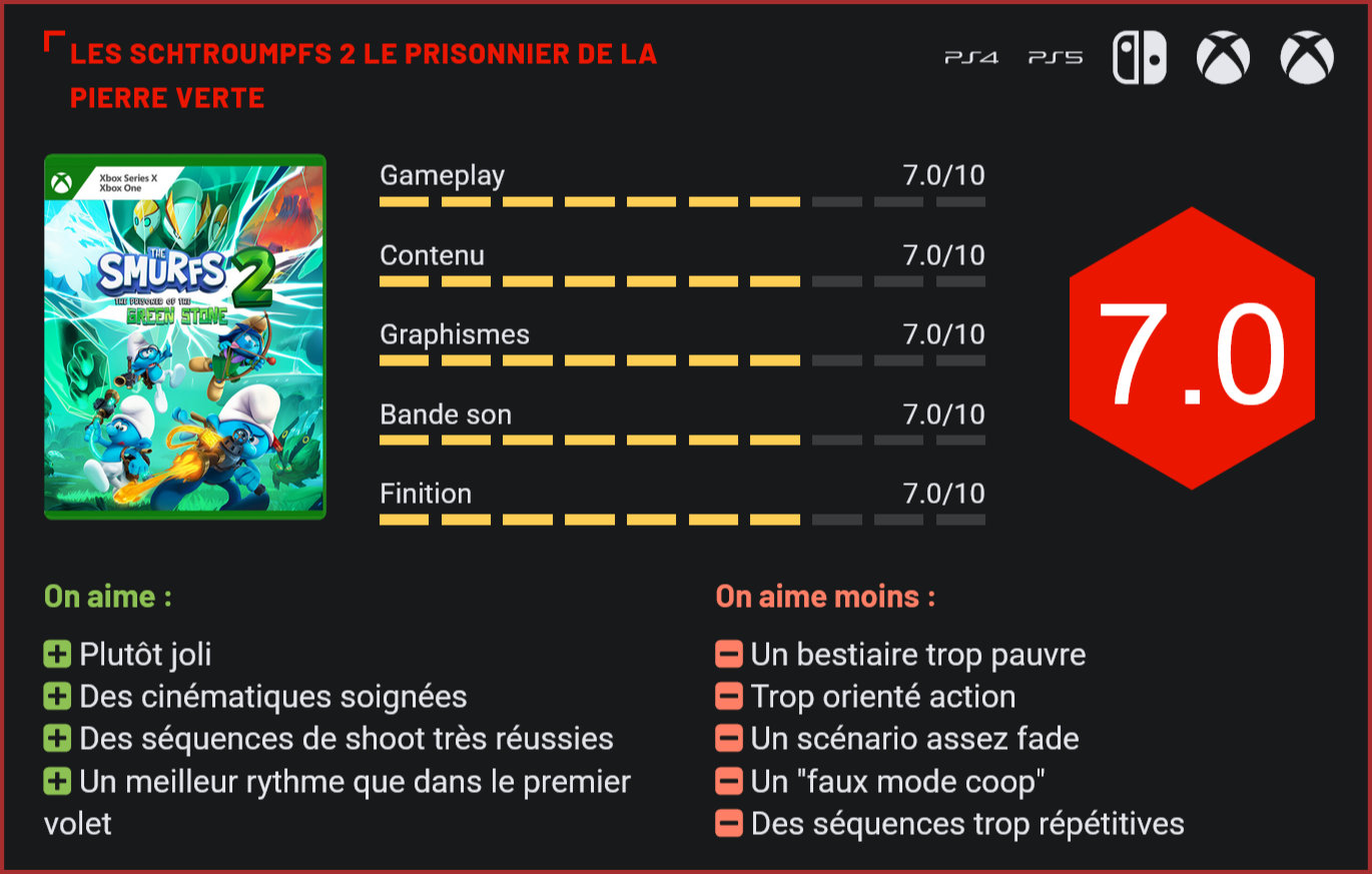 Les Schtroumpfs reviennent dans un nouveau jeu d’action aventure, qui fait suite au sympathique Mission Malfeuille, sorti en 2021 sur consoles. La formule évolue un peu, avec l’abandon de certaines mécaniques agaçantes du premier volet et l’introduction de nombreuses petites nouveautés. Comme beaucoup d’autres joueurs, vous étiez peut-être passé à côté de Mission Malfeuille, un pourtant sympathique jeu d’action / aventure dans l’univers des Schtroumpfs qui nous faisait voyager dans un univers coloré emprunt de la magie de Peyo. Deux ans plus tard, Microids rempile pour un second chapitre. Le Prisonnier de la Pierre Verte est la suite directe de Mission Malfeuille. Il ne faut donc pas s’attendre à de gros changements ni dans le style graphique, ni dans le gameplay. Il se distingue des autres jeux de plates-formes par la présence de nombreuses séquences de shoot à la troisième personne qui dénaturent quelque peu l’univers des Schtroumpfs. Et c’est sans doute le plus gros reproche qu’on lui fera. La présentation est soignée, avec de jolies cinématiques. Car il faut le savoir, tout comme son prédécesseur, Le Prisonnier de la Pierre Verte prend quelques libertés avec l’univers des Schtroumpfs. Il ne s’agit pas de l’adaptation d’un volume en particulier de l’oeuvre de Peyo mais d’un épisode inédit. L’histoire prend place après Mission Malfeuille mais il n’est pas nécessaire d’avoir joué au premier jeu pour se lancer dans l’aventure. Une fête est organisée au village Schtroumpf. Pour préparer des tas de gâteaux, Schtroumpf bricoleur crée une machine, le Schtroumpfomix. Mais pour arriver à ses fins, il a besoin de la Pierre verte, détenue par Gargamel. Nos chers petits Schtroumpfs s’embarquent donc dans une aventure pour dérober cette pierre magique au vilain Gargamel. Sans le savoirent, ils libèrent toutefois une entité baptisée Stolas, et ils vont devoir s’allier à Gargamel pour retrouver Stolas et se débarrasser de cette menace. Si cette intrigue inédite reste fidèle à l’oeuvre de Peyo, il faut bien admettre que sur le plan narratif, le scénario n’est pas des plus passionnants à suivre et c’est bien dommage vu les efforts par le studio OsOme au niveau de la mise en scène. Les cinématiques sont très réussies, la mise en scène est soignée, mais il manque cette petite étincelle typique des œuvres de Peyo. C’est le principal reproche que l’on peut adresser au jeu : il prend beaucoup de libertés avec l’univers de Peyo et côté gameplay également. Car quand on pense aux schtroumpfs, on pense davantage à un petit jeu de plates-formes qu’à un shooter, aussi mignon puisse-t-il être. Or, comme son prédécesseur, Le Prisonnier de la Pierre Verte est bel et bien un jeu de tir à la troisième personne, en plus d’être un jeu de plates-formes. Visuellement, le jeu est soigné. Rassurez-vous, Le Prisonnier de la Pierre Verte n’en reste pas moins un jeu très plaisant à parcourir, mais il convient d’alerter le lecteur sur l’identité du jeu pour éviter une mauvaise surprise… Car en soi, la formule a progressé dans le bon sens. Exit par exemple le Vaporisaschtroumpf si agaçant du premier volet, qu’il fallait continuellement utiliser pour nettoyer la saleté. Celui-ci est remplacé par une autre arme qui offre plus de modes de tir. Ceci étant dit, oui il faudra toujours utiliser l’arme en question, non pas pour nettoyer le sol mais briser des cristaux cette fois. C’est un peu mieux mais sur la longueur, il faut bien avouer que ça reste assez pénible. Car Le Prisonnier de la Pierre Verte n’avait nul besoin de s’encombrer d’une telle mécanique pour être un bon jeu de plates-formes. En-dehors de ces séquences ultra-redondantes et pourtant nécessaires pour progresser (les cristaux seront votre monnaie d’échange pour améliorer votre équipement), on retrouve des séquences de plates-formes parfaitement maîtrisées, des petites énigmes à résoudre et surtout des combats extrêmement funs. Il faudra ici affronter des CristoBêtes, des créatures infectées par les cristaux qui tenteront à tout prix de vous éliminer. Le gameplay est nerveux : notre Schtroumpf est capable de virevolter dans les airs en enchainant un double saut et un dash, tout en canardant ses ennemis. L’arsenal ne se cantonne par ailleurs pas à une seule arme puisque celle-ci est compatible avec quatre types de munitions. On retrouve outre les munitions standards des munitions qui ont un effet collant, des munitions répulsives et magnétiques. Toutes pourront être utilisées contre les ennemis ou pour résoudre des petites énigmes environnementales. Seul petit bémol : il faudra les récupérer manuellement dans les décors, ce qui n’est pas forcément une bonne idée puisqu’il arrive parfois d’être bloqué, par manque de munitions appropriées. Auquel cas il faudra retourner dans le niveau pour tenter de trouver les bonnes munitions, votre Schtroumpfomix ne pouvant transporter que deux types de munitions à la fois. Le Prisonnier de la Pierre Verte a tendance à enchainer plus de séquences d’action et de combat que son prédécesseur et ce n’est pas pour nous déplaire tant le premier volet connaissait quelques gros problèmes de rythme. Les combats en arènes sont beaucoup mieux maîtrisés dans cette suite, les combats de boss sont solides et les séquences de plates-formes ajoutent un peu de diversité au tout. Les affrontements sont beaucoup plus nombreux que dans le premier volet. La formule est donc bien meilleure que dans le premier épisode, même si tout ici est basé sur l’usage d’une seule et unique arme. Le jeu parvient à gagner en profondeur tout au long de son aventure avec des énigmes de plus en plus complexes, un système d’amélioration des armes et attaques, des défis en arènes. Bref, l’aventure se tient, même si on aurait aimé plus de diver