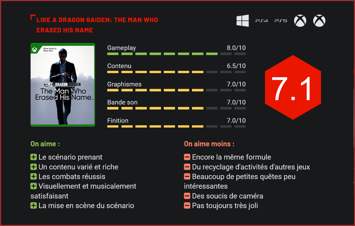 À peine deux mois avant le prochain épisode, Sega nous propose une nouvelle aventure de la licence Like a Dragon qui se concentre sur le protagoniste original. Kazuma Kiryu reprend du service pour un opus plus modeste, mais utilisant tout de même la formule qui a fait les beaux jours des Yakuza. Le Ryu Ga Gotoku Studio est décidément très productif en ce moment. Après avoir proposé un remaster de l’épisode Ishin en début d’année, l’équipe a travaillé sur deux autres épisodes de la licence Like a Dragon. Si le second se trouve être le huitième épisode qui arrivera en janvier prochain, le premier est un titre désormais disponible sur PC, consoles Playstation et Xbox (ainsi que sur le game pass) et qui fait office de prologue pour le second. Intitulé “Like a Dragon Gaiden: The Man Who Erased His Name”, cette aventure spin-off se concentre sur le protagoniste original de la licence, à savoir Kazuma Kiryu. Ce dernier avait vu son histoire se conclure dans le sixième épisode et avait cédé sa place à un nouveau héros pour le septième. Cet épisode “gaiden” plus modeste sert d’introduction au huitième jeu puisqu’on y retrouvera Kiryu qui accompagnera les nouveaux héros de cette saga. Suite aux évènements de l’épisode 6, Kiryu décide de se faire passer pour mort à l’aide de l’organisation Daidoji. Dorénavant appelé Joryu, il devient malgré lui l’homme à tout faire de ce groupe, effectuant plusieurs missions pour leur compte. Son passé va cependant le rattraper puisqu’un nouveau groupe mystérieux va tout faire pour retrouver le Yakuza légendaire. Malgré un scénario qui pose bien le contexte et les enjeux, il est tout de même préférable d’avoir des connaissances concernant les épisodes précédents. Cette aventure peut tout de même s’apprécier sans, mais l’histoire risque d’avoir beaucoup moins d’impact. Le récit est très réussi et prenant, proposant de grands moments mémorables, quelques surprises et aussi des passages un peu moins sérieux. Le légendaire Dragon de Dojima reprend du service. The Man Who Erased His Name en profite pour nous replonger dans l’approche “classique” de la série. Contrairement aux septième et futur huitième épisode qui se sont transformés en RPG au tour par tour, Gaiden reprend à la lettre le fonctionnement des épisodes originaux. Nous sommes plongés dans un jeu d’aventure très narratif, mais qui nous laisse passer du temps dans un quartier japonais, cette fois principalement à Osaka, dans lequel se trouve tout un tas d’activités, de quêtes annexes et de mini-jeux. Comme il s’agit d’un épisode un peu plus modeste, Gaiden propose un peu moins d’activités annexes que d’habitude et plusieurs d’entre elles sont très similaires à celles des précédents épisodes. Plusieurs jeux habituels sont proposés, à l’image des karaokés, du pocket circuit ou encore des salles d’arcade où il est possible de jouer à plusieurs titres de Sega comme Virtual Fighter 2.1, Sonic The Fighters ou encore Daytona USA 2. Le nouveau Colisée permet de se lancer dans des batailles de groupe. En plus des mini-jeux, cet épisode propose tout un tas de petites quêtes, dont la majorité sont malheureusement peu intéressantes, mais bien justifiées par l’introduction du personnage de Akame et de son système d’entraide dans le quartier. Il faut aussi mentionner la présence d’une arène de combat qui propose plusieurs mécaniques originales puisqu’il est possible de réaliser différents affrontements, de créer notre équipe de combattants pour faire des bagarres de groupe et même de recruter des personnages familiers. Les combats du titre sont de nouveau en temps réel et proposent plus ou moins la même approche qu’avant, mais avec de nouvelles idées qui les rendent encore plus sympathiques. Notre personnage possède plusieurs styles de combat, dont un nouveau spécialement appris par Kiryu durant cette période, le style “Agent”, qui nous permet de réaliser des coups plus rapides et d’utiliser de nouveaux gadgets comme des drones ou l’araignée qui permet d’attraper les ennemis avec des fils pour les empêcher d’agir. On débloque très rapidement un style de combat bien plus classique pour Kiryu qui se révèle plus puissant, mais aussi plus lent. Deux approches avec lesquelles il est tout à fait possible de jongler en plein combat, et qu’il est préférable d’améliorer en échange d’argent. Certains affrontements restent assez exigeants, il faut donc utiliser tous nos outils avec soin, même si plusieurs options de difficultés permettent de simplifier les choses. L’approche de cet épisode reste la même que d’habitude et le gameplay reste tout aussi bon qu’avant, malgré quelques petits soucis comme des problèmes de caméra. Les quartiers sont toujours aussi agréables à parcourir. C’est aussi réussi du côté des visuels, malgré quelques imperfections. Évidemment, les Like a Dragon ne sont pas des jeux réalisés avec un budget extensible, de très nombreux éléments des décors sont peu détaillés, et il ne faut pas toujours regarder certains endroits de trop près. Pourtant, le jeu reste généralement assez plaisant à regarder, et en particulier lors des passages scénarisés. La mise en scène des cinématiques importantes impressionne, mais les scènes moins grandiloquentes du titre sont beaucoup plus plates. Un bilan en dents de scie qui est fidèle à la qualité des précédents épisodes et qui n’est donc pas très étonnant. La bande-son, elle, s’en sort plutôt bien et est habilement utilisée durant les grands moments du jeu. Like a Dragon Gaiden c’est un nouvel épisode toujours très efficace d’une formule qu’on ne connait désormais que trop bien. Les différents titres de la licence se ressemblent tout de même beaucoup au niveau de leur fonctionnement et la redondance commence à se fai