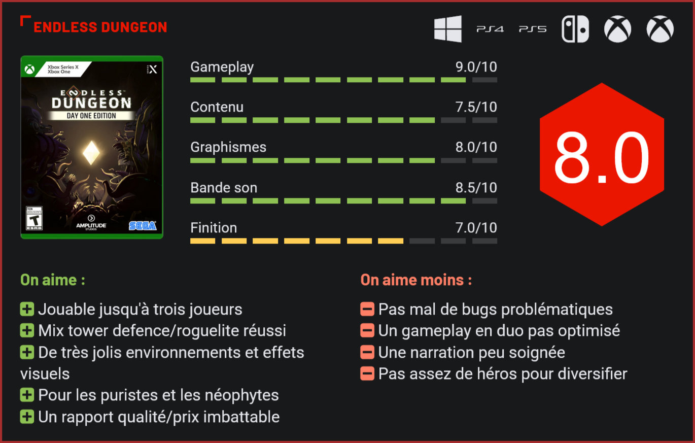 Endless Dungeon, ça vous dit quelque chose ? C’est normal, car après Endless Space, Endless Legend et Dungeon of the Endless, Sega et Amplitude s’attaquent au roguelite avec ce nouvel opus. Le genre du roguelite est tout particulièrement en vogue depuis quelques années. Après un excellentissime Hades sorti il y a trois ans, difficile de trouver autre titre indépendant tirant autant son épingle du jeu. Et pourtant, en cette fin d’année 2023, Amplitude et Sega y sont parvenus, avec ce très surprenant Endless Dungeon. Papa du récent Humankind, Amplitude Studio s’est avant tout fait connaître par son jeu de stratégie au tour par tour sur PC Endless Space. C’était il y a 11 ans et, depuis lors, le studio a créé une sorte d’univers autour de la franchise “Endless”. Suivront Endless Legend, première incursion des Français dans le domaine du 4X, puis Dungeon of the Endless, prédécesseur spirituel de ce Endless Dungeon. C’est donc dans le même univers que se situe ce nouveau titre, avec un gameplay totalement différent de ce qui était auparavant proposé. Avant toute chose, il est important de savoir à quoi vous vous frottez. Endless Dungeon est un mélange de roguelite, puisque la mort est punitive et vous renvoie (presque) au début de l’aventure, et de tower defence. Concrètement, vous vous retrouvez dans des donjons dans lesquels vous devez progresser et faire face à des ennemis grâce à vos sorts mais, également, des tours que vous parsèmerez ici-et-là. Un concept plutôt original, qui remet sur le devant de la scène un genre (celui du tower defence donc) tombé en désuétude au fil des années. La coopération est ultra importante pour protéger le robot-cristal. Pour cela, les tours vous aideront. Endless Dungeon mise quant à lui sur une aventure jouable intégralement en coopération. Tout seul, en duo ou à trois, vous traverserez une douzaine de salles générées procéduralement après vous être équipé au hub, ou saloon dans ce cas-ci. L’objectif ? Il est très simple : permettre à un “robot-cristal” d’atteindre le cœur du réacteur de la station, vous permettant ainsi de vous en échapper. Mais ce robot est unique. le sauver est une priorité, et sa destruction vous ramènera instantanément au saloon d’où vous devrez reprendre. La coopération sera alors la clé de votre réussite, vous poussant à travailler avec vos amis pour empêcher la destruction du robot. Plus vous ouvrirez de salles afin d’explorer les environs, plus nombreux seront les ennemis qui tenteront de détruire votre seule échappatoire. Comme expliqué ci-dessus, Endless Dungeon vous permet de résister aux vagues ennemies en coopération ou seul. Dans la deuxième configuration, vous vous retrouverez accompagné de deux personnages gérés par l’IA. C’est en revanche la coopération qui coince. Si tout se passe pour le meilleur des mondes accompagné de deux amis, la coop en duo est quant à elle plus punitive, puisque vous vous retrouvez dans une équipe de deux seulement, face aux mêmes vagues d’ennemis. La difficulté est donc rehaussée, impossible en effet de collaborer à trois avec un ami et un personnage IA. Il y a donc là un réel manque d’équilibrage. Au total, le titre propose jusqu’à huit personnages à débloquer. Un poil maigre si on décide de jouer à trois. Mélange de roguelite donc, et de tower defence, le jeu est une de ces rares productions qui parvient à allier habilement les genres. Parce qu’au-delà de devoir tout faire pour éviter la mort ou la destruction de votre robot-cristal, c’est de stratégie que vous allez devoir faire preuve pour idéalement placer vos tours. Les ressources, qui permettent de déployer de nouvelles tourelles, sont communes à l’ensemble de l’équipe. Il faut ainsi discuter pour les placer avec parcimonie, ne pas en abuser et choisir les bons modèles de tourelles. Car oui, différents types de tours existent, comme des rayons plasma, des boucliers ou tourelles mitrailleuses. Plusieurs types de tours, certes, mais un contenu légèrement décevant sur certains points. On ne retrouvera par exemple “que” huit héros différents. Lorsque l’on joue en solo, on peut concevoir que c’est suffisant, mais à trois ça devient assez maigre. D’autant que l’intérêt d’un roguelite réside partiellement dans sa rejouabilité quasi infinie, vous poussant à chercher des objets que vous pourrez débloquer ici-et-là. Mais avec seulement huit personnages, l’envie de se replonger dans le jeu n’est pas assurée. Sur ce point, les développeurs ont d’ores-et-déjà annoncé que des mises à jour seraient proposées dans un futur plus ou moins proche. Mais les huit personnages ne sont pas disponibles dès le début de votre aventure. Pour pouvoir tous les essayer, vous devrez débloquer les différentes niveaux du jeu que vous aurez explorez chacun au moins une fois. Au total, sur les trois étages de la station spatiale, on dénombre 10 zones, dont le Noyau, soit la zone finale. Chaque partie ne vous donnant accès qu’à une seule zone d’un étage, vous devrez habilement penser la façon dont vous comptez explorer le titre. Au-delà de l’aspect exploration, sachez que le Saloon, soit le hub central de votre aventure, regorge de secrets. Vous y rencontrerez des PNJ avec lesquels vous pourrez échanger, mais aurez également la possibilité de modifier votre équipement pour attaquer une nouvelle salle. Visuellement, Endless Dungeon est super propre. Autant les effets de lumière que les effets spéciaux sont réussis. Au-delà de la quête principale du robot-cristal à protéger, vous aurez également la possibilité d’accomplir une quête annexe propre à chacun des huit personnages. En l’accomplissant, le personnage s’en trouve amélioré, et vous en apprenez un peu plus sur son histoire … au moyen d’un paragraphe. Une maigre récompense donc, qui tém