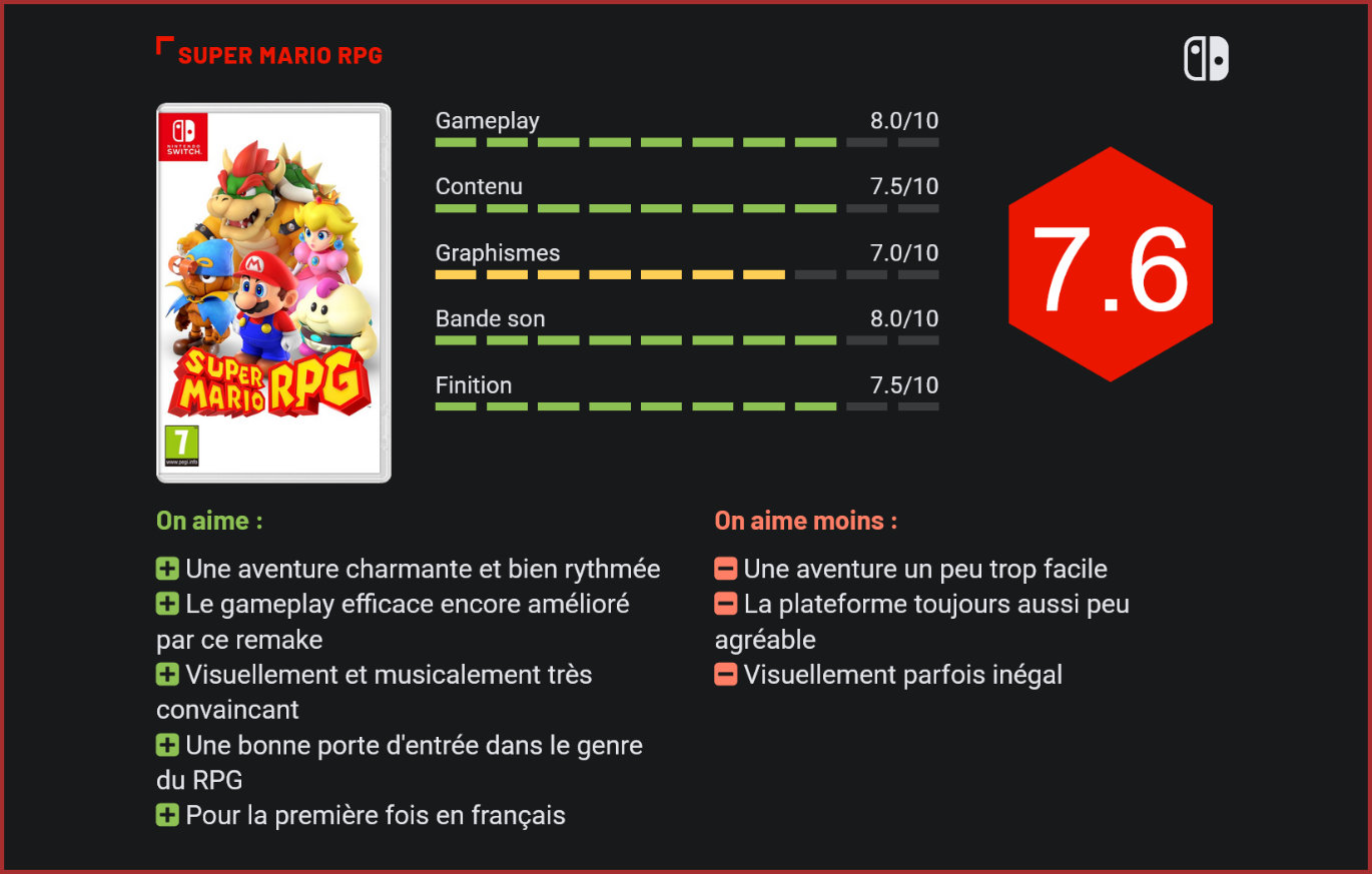 Alors que le titre original manque toujours à l’appel dans le catalogue du Nintendo Switch Online, c’est un véritable remake de Super Mario RPG qui débarque durant ce mois de novembre. Ce tout premier RPG de la licence Mario n’avait pas été distribué en Europe lors de sa sortie originale, la faute est désormais réparée. Revenons en 1996. Alors que la Super Nintendo s’apprête à laisser sa place à la Nintendo 64, le constructeur propose une dernière aventure de son plombier en collaboration avec un gros développeur japonais. C’est un Square alors responsable de Chrono Trigger et Final Fantasy VI les quelques années précédentes qui s’allie au géant du jeu vidéo pour développer un jeu Mario qui se joue comme l’un des RPG du développeur. Un épisode à la fois précurseur des “Mario et Luigi” et des “Paper Mario” qui, eux, seront réalisés sans l’aide de la maison de Final Fantasy. Alors resté exclusif au Japon et à l’Amérique du Nord, ce nouveau remake permet au titre d’être disponible pour la première fois en Europe et en français. La princesse Peach a de nouveau été enlevée par Bowser. Le jeu débute lorsque Mario se rend dans le château de l’antagoniste habituel de la série. Alors que Mario et Bowser s’affrontent, l’épée géante Exor tombe du ciel et s’abat sur le château, ce qui détruit le chemin qui y mène et projette Mario au loin. Pire encore, cette épée a détruit la route des étoiles, un endroit dont l’existence permet aux vœux d’être exaucés. Accompagné de nouveaux personnages, Mario va faire le tour du royaume pour retrouver les sept étoiles qui composent cette route des étoiles. Un scénario qui n’est pas exceptionnel, mais qui propose une bonne dose d’humour et des personnages attachants qui nous permettent de passer un très bon moment. Super Mario RPG est un jeu de rôle plutôt classique, mais qui allie habilement quelques éléments de la série Mario à cette formule. Le titre peut être considéré comme une bonne porte d’entrée vers les RPG puisqu’il se montre très accessible pour ceux qui ne connaissent pas le genre. Une expérience de jeu de rôle qui se veut alors plus légère que les gros noms du genre puisque la gestion de l’équipement et des statistiques est on ne peut plus simple ici. Une accessibilité qui passe aussi par sa difficulté relativement basse, le remake ajoutant d’ailleurs un mode facile pour ceux qui ne s’en sortiraient pas malgré tout. Si on peut lui reprocher son manque de challenge durant l’aventure principale, cette refonte propose aussi des combats bien plus corsés après la fin du jeu. Les décors du jeu original sont fidèlement retranscrits en HD. Le titre se divise en différentes zones explorables réparties sur une carte du monde à la Super Mario World. Ces zones sont parfois des villages ou des donjons dans lesquels se cachent tout un tas d’ennemis, des coffres et même des mini-jeux. Le titre y propose même quelques petits passages de plateforme qui, comme à l’époque, se montrent fort peu précis et parfois pénibles, mais ceux-ci ne constituent qu’une partie très minime du jeu. Dans Super Mario RPG, on passe la plupart de notre temps à faire des combats au tour par tour. Son système de combat se montre aussi très classique, mais avec quelques idées qui seront reprises dans les RPG Mario suivants, ainsi que dans d’autres productions du genre. Les combats se déroulent avec une équipe de trois personnages de notre côté. La grande particularité des combats réside dans l’envie de nous garder actif, il est plus que bénéfique d’appuyer sur le bouton A au moment où notre personnage attaque. Avec le bon timing, notre personnage inflige plus de dégâts. La même chose est valable pour la défense puisque appuyer sur A avec un timing parfait permet d’annuler complètement les dommages d’une attaque ennemie. Chacun des cinq personnages jouables possède ses propres capacités puisant dans nos Points Fleur, une réserve de magie commune. Ces coups spéciaux demandent aussi de réaliser diverses actions pour en augmenter l’efficacité. Le système de combat est simple et efficace. Si, sur le papier, ces bonus paraissent très puissants, ce n’est pas toujours très facile à utiliser. Les timings sont généralement exigeants et parfois difficiles à comprendre. Le remake propose également quelques nouveautés comme une jauge d’action qui augmente à chaque fois que nous réussissons à appuyer au bon moment lors de nos attaques ou de nos défenses. Une fois celle-ci à 100%, il est possible de lancer une super attaque qui va varier dépendant des personnages qui composent l’équipe. Le système de combat n’est pas le plus complexe ni le plus poussé qu’aient pu imaginer les équipes de Square, mais le résultat est plus que convaincant et bien en accord avec l’esprit de la licence de Nintendo. Il faut compter une petite douzaine d’heures pour voir le bout du scénario, quelques heures supplémentaires sont nécessaires pour faire le tour du contenu. Une durée de vie qui paraît plutôt courte pour un RPG, mais qui témoigne aussi d’une véritable envie de ne pas nous ennuyer. De très nombreux moments du scénario sont ponctués par des mini-jeux et des phases qui viennent briser la monotonie d’un jeu au gameplay traditionnel comme ce Super Mario RPG. Les jeux du genre ont souvent tendance à tirer en longueur, ce qui n’est pas le cas ici puisque le titre se contente d’aller à l’essentiel. Jamais redondant, jamais ennuyant, le rythme du jeu était déjà presque parfait à l’époque, et l’est toujours aujourd’hui. Les super attaques ont droit à des cinématiques mettant en scène les trois personnages du groupe. Le titre est tout aussi convaincant visuellement. L’épisode original utilisait des décors réalisés en 3D et convertis en 2D, comme ont pu le faire les Donkey 