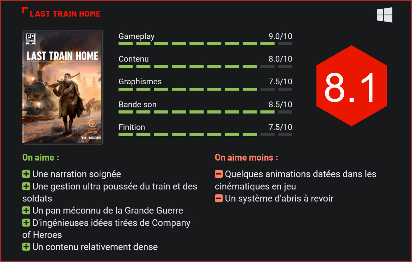Connaissiez-vous l’épopée des Légions tchécoslovaques ? Ce pan méconnu de l’histoire de la Première Guerre mondiale nous est sublimement conté par THQ Nordic dans Last Train Home. Explications. Ces dernières années, la Première Guerre mondiale a connu un regain d’intérêt auprès des développeurs de jeu vidéo et des différents studios avec, il faut bien l’admettre, des productions très réussies. On pourrait ainsi mentionner le touchant “Soldats inconnus : mémoires de la Grande Guerre” d’Ubisoft, “Verdun” ou la superproduction “Battlefield 1”, apportant une touche cinématographique aux champs de bataille très réussie. Dernièrement, c’est THQ Nordic qui s’est frotté à la Grande Guerre et à ses tranchées. L’angle ici raconté est relativement méconnu, puisqu’il s’agit de l’histoire des Légions tchécoslovaques. Durant la Première Guerre mondiale, des volontaires tchèques et slovaques, prisonniers de guerre, combattirent aux côtés des forces russes, françaises et italiennes. Après la Révolution russe de 1917 et le retrait du pays de la guerre, il fut décidé que la Légion tchécoslovaque présente en Russie soit envoyée vers la France pour poursuivre les combats. Une évacuation qui devrait alors s’opérer via le Transsibérien, et ce, depuis Vladivostok. Un récit qui prend place durant la guerre, mais qui, paradoxalement, est terriblement poignant. Ces unités, qui ont donné leur vie pour les forces russes, se voient du jour au lendemain abandonnées à leur propre sort, devant se frayer un chemin à travers les plaines hostiles de la Russie bolchevique. Avec un train comme seul moyen de transport, ces soldats doivent batailler pour leur survie, cherchant du charbon pour faire fonctionner le train, de la nourriture pour se sustenter ou encore de la poudre pour créer des munitions. Dans son gameplay, Last Train Home s’apparente énormément à Company of Heroes, mais avec la gestion du train en plus. Vous l’aurez compris, votre devoir, en tant que Major en charge de la sécurité de ce convoi, sera de guider vos hommes vers la liberté et les terres du futur état tchécoslovaque. Bien évidemment, cela ne sera pas simple. La Russie a basculé dans un régime communiste totalitaire très hostile à la présence de la Légion sur ses terres. Ceux aux côtés de qui vous combattiez pendant la Grande Guerre sont désormais vos ennemis. Avec Last Train Home, les développeurs ont eu la malice d’allier habilement différents genres. On retrouve ainsi un aspect stratégie, sur les champs de bataille. À l’instar d’un Company of Heroes (le gameplay est très proche), on se retrouve avec un certain nombre de soldats que l’on doit mener sur le terrain face à des ennemis. Il faudra alors utiliser leurs propres compétences pour progresser, mais également l’environnement afin de se protéger. Concrètement, si vous avez déjà joué à Company of Heroes, vous ne serez absolument pas dépaysés. Quelques éléments diffèrent toutefois. Là où on peut contrôler des unités motorisées dans CoH, Last Train Home ne vous met aux commandes que de fantassins. Chaque escouade peut comporter jusqu’à huit soldats, chacun aux compétences bien particulières : mitrailleur, grenadier, éclaireur… Chaque spécialité permet bien évidemment de se sortir de l’une ou l’autre situation tendue. Un autre aspect qui change par rapport à Company of Heroes est la gestion des différents abris. L’environnement de vos hommes sera leur meilleure protection, et il est important de s’abriter pour éviter des blessures mortelles. Là où le système d’abri est ultra bien calibré dans Company of Heroes, il l’est bien moins dans Last Train Home. Des abris qui semblent pourtant ultra efficaces, comme un véhicule ou l’angle d’une maison sont totalement inutilisables. Vos hommes peuvent s’y abriter, mais ne pourront pas tirer à couvert. Ils devront se déplacer, et donc être plus vulnérables. Vous traversez les champs verts de la Russie en direction de Vladivostok, seule porte de sortie vers le nouvel état tchécoslovaque. Là où la stratégie revêt toute son importance, c’est dans la gestion des hommes et de leurs besoins. Impossible d’assigner toujours la même escouade à des missions sans la fatiguer ou saper son moral. Il faudra ainsi alterner de manière subtile afin de satisfaire les besoins de vos hommes tout en leur permettant de se reposer. Ils auront besoin de repos, mais pas que. Ils devront manger (se contenter d’une demi-ration lorsque la nourriture se fait rare), avoir chaud, être distraits… Autant de facteurs à prendre en compte, mais attention à ne pas sombrer dans l’abus. Offrez de la vodka à vos hommes et ceux-ci deviendront alcooliques, et donc maladroits. Ils se blesseront alors plus souvent, iront plus souvent à l’infirmerie et seront ainsi indisponibles. Mais assigner des hommes à une mission, c’est également leur permettre d’engranger de l’expérience. Tous simples soldats au départ, l’expérience leur permettra de monter en grade, et vous pourrez même les décorer avec une médaille à l’issue d’une mission. Ils pourront ainsi gagner en rapidité, intelligence ou encore charisme, mais également acquérir de nouvelles compétences. Ainsi, un soldat défini comme mitrailleur peut aussi être éclaireur, mais ce n’est pas tout. Au-delà des fonctions combattantes, on retrouve les fonctions du quotidien. C’est là que l’aspect gestion du titre se distingue. Le champ de bataille, c’est une chose, mais le quotidien de vos hommes en est une autre qui est, probablement, bien plus importante. Nous parlions plus haut des différentes ressources. Celles-ci sont cruciales à bien des niveaux. Pour le bon fonctionnement du train notamment. On expliquait ainsi que le charbon permettait au train d’avancer, mais le bois ou le métal vous aideront à amélio