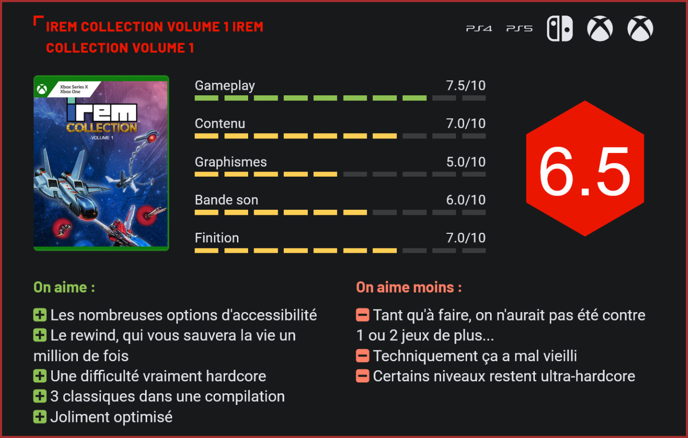 Rassemblant trois épisodes de la série Image Flight, l’Irem Collection Volume 1 fera verser une larme de nostalgie aux amateurs de shoot them up. Relativement méconnue sous nos latitudes, la série des Image Flight a pourtant marqué toute une génération de joueurs. Sorti en 1998, Image Flight est rapidement devenu un classique du shoot them up. Le titre se démarquait en effet des autres jeux du genre par son niveau de difficulté mais aussi sa réalisation, impressionnante pour l’époque. Les combats de boss sont particulièrement intenses. Alors bien sûr, visuellement, ça a vieilli, mais pour les amateurs du genre, le gameplay très caractéristique des Image Flight en font des jeux uniques qui méritent aujourd’hui encore le détour. Car en terme de difficulté c’est une expérience absolument hardcore qui vous attend. Les tirs des ennemis ne suivent pas ici un pattern particulier puisqu’ils vous ciblent directement. La vitesse de jeu est lente mais l’écran est régulièrement saturé de tirs et le joueur est régulièrement surpris par des ennemis qui apparaissent derrière lui. Ce sont pourtant bien les combats de boss qui resteront le plus dans les mémoires vu leur intense difficulté. C’est bien simple, il y a de quoi se ronger les ongles jusqu’au sang quand on échoue lamentablement pour la quarantième fois devant un ennemi. La bonne nouvelle, c’est qu’heureusement, le jeu intègre une fonction rewind qu’on n’hésitera d’ailleurs pas à utiliser… Fonction hyper pratique. Notons toutefois que même avec ça, le jeu reste difficile pour un débutant. X Mutiply est un spin off de la série, qui prend une direction très différente. Pour les vétérans qui se sont acharnés à l’époque sur Image Flight, cette compilation sera l’occasion de découvrir pour la première fois le second volet, qui n’était pas sorti sous nos latitudes. Sorti en 1992, le jeu reprend la formule du premier mais est sensiblement plus joli et plus long également. Le spin-off X Multiply est également très intéressant dans la mesure où il propose une expérience très différente, avec un défilement non plus vertical mais horizontal. L’autre particularité du jeu, c’est le fait ici que l’on dirige outre son vaisseau les deux bras articulés, qui permettent de couvrir une zone beaucoup plus grande. Le titre se démarque aussi des autres épisodes puisqu’il prend place dans un corps humain, le joueur y affrontant des microorganismes dans des environnements pour le moins atypiques… Dans les menus, on retrouve de nombreuses options de customisation. Alors oui, visuellement, tout ça a très mal vieilli, oui, tant qu’à faire on aurait aimé retrouver plus de jeux dans cette compilation au vu du prix auquel elle est vendue (25€ tout de même), mais pour les passionnés de shoot them up voici une compilation absolument incontournable vu la qualité de ces trois classiques relativement méconnus, l’optimisation globale de ces portages et les nombreuses options de customisation qui permettent de rendre ces jeux beaucoup plus accessibles. On notera au passage que l’éditeur Inin Games ne s’arrête pas à cette seule compilation puisqu’il propose depuis ce 8 décembre 2023 une poignée d’autres jeux rétro sur Xbox, dans sa gamme “IninVasion”, avec notamment Pocky & Rocky Reshrined, ULTRACORE, Clockwork Aquario, Panorama Cotton et Cotton 100%. Conclusion Relativement méconnue du grand public, la série des Image Flight a pourtant marqué son époque. Ces shoot them up hardcore se caractérisaient outre par leur niveau de difficulté extrêmement élevé, par leur univers glauque et leurs boss excessivement originaux. ININ Games propose avec cette compilation de 3 jeux une collection incontournable pour les amateurs de shoot them up. Les nombreuses options d’accessibilité permettront même aux débutants de s’y frotter. Mais attention, ça pique ! Alors certes, visuellement, ça a vieilli, mais quel plaisir de retrouver des titres aussi originaux, qu’on pensait à toujours disparus ! A 25€, cette compilation mérite donc largement le détour pour les amateurs de shoot them up.