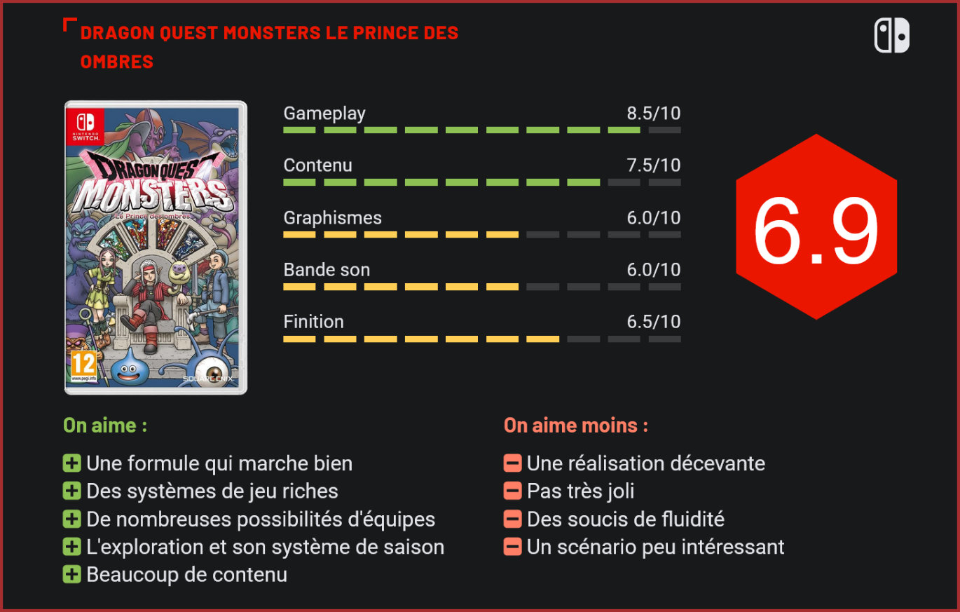 Bien des années après les derniers jeux “Monsters” (en particulier si on ne prend en compte que les sorties occidentales), la licence Dragon Quest nous livre un nouvel épisode en revenant aux sources. Exclusif à la Switch, “Le Prince des ombres” est un opus sympathique, mais bien trop modeste. Déjà derrière le Dragon Quest Treasures sorti à la même période l’année dernière, le studio Tose Software nous fournit cette fois un Dragon Quest Monsters, un nouvel épisode de la série de spin-offs basée sur la licence historique de JRPG. Véritablement nommé “Dragon Quest Monsters 3” au Japon (un titre numéroté qui n’a pas beaucoup de sens par chez nous puisque cette série a toujours eu du mal à s’exporter), ce nouveau jeu marque donc le vrai retour des spin-offs “Monsters” depuis le début des années 2000. Une série débutée sur Game Boy et qui était, à l’époque, une réponse au succès massif de Pokémon. Les épisodes “Monsters” nous invitent généralement à partir à l’aventure en recrutant des monstres pour former une équipe. Cet épisode se déroule dans l’univers de Dragon Quest IV puisqu’on y incarne Psaro, un antagoniste de cet épisode. Nul besoin d’avoir fait l’opus en question pour comprendre l’intrigue puisque celle-ci est une histoire alternative, nous racontant la jeunesse du prince des ombres. Enfant du roi des monstres et d’une humaine, Psaro est frappé par une malédiction l’empêchant de combattre des monstres par lui-même. Notre protagoniste va alors apprendre à devenir un meneur de monstres pour pouvoir s’attaquer à son paternel. Le jeu propose beaucoup de phases d’explorations. Si son scénario prend du temps à se lancer, il nous fait tout de même vite comprendre qu’il va surtout servir de moteur à cette aventure. Si quelques personnages récurrents vont accompagner le prince, l’intrigue préfère généralement se concentrer sur son gameplay. Ce qui n’est peut-être pas plus mal quand on voit à quel point le budget du jeu semble serré. La mise en scène des cinématiques est loin d’être convaincante et le reste de la présentation laisse aussi à désirer. Ce n’est pas très beau, ni très vivant, et le jeu peine parfois à afficher un framerate stable malgré tout. L’ambiance sonore est cependant plus sympathique, mais réutilise de nombreuses musiques d’autres jeux de la série. Ce Dragon Quest Monsters se rattrape cependant par son gameplay. Le système de combat est classique, mais aussi très automatique. Très proche de Pokémon dans son concept, nous pouvons apprivoiser environ 500 créatures uniques qui possèdent différents types, sorts et capacités passives, ainsi que des résistances et faiblesses à d’autres types de monstres. Le but est de créer une équipe assez compétente pour nous permettre de monter les échelons des arènes de combat. Pour ce faire, il va falloir recruter les différentes créatures en les affrontant directement dans des zones ouvertes à explorer librement. Ces dernières sont assez grandes et proposent un système de saison qui change après plusieurs minutes de balade et qui change plusieurs paramètres. En plus des créatures trouvables qui varient selon le climat, certaines parties des zones seront explorables uniquement durant certaines saisons. L’hiver gèle les points d’eau, le printemps fait pousser des lierres sur certains murs… Si le jeu propose un gameplay au tour par tour comparable à ceux des épisodes principaux de la série, les monstres sont ici bien plus autonomes. S’il est tout de même possible de le faire, le jeu ne demande pas nécessairement de choisir quelles actions feront chaque monstre à chaque tour comme dans un Pokémon, les créatures peuvent agir par elles-mêmes de manière assez intelligente. Le titre nous propose plutôt de paramétrer plus généralement leur comportement (être agressif, servir de soutien, économiser les points de magie…). Les combats en arènes nous confrontent à d’autres meneurs de monstres. Les combats d’arène nous empêchent complètement de donner des ordres directement à notre équipe. Le titre nous encourage bien plus à la planification et à la création d’une équipe de monstres complémentaires que dans d’autres jeux du genre. Cet aspect se révèle vite très riche, en ajoutant par exemple un système de fusion de monstres qui héritent alors des capacités des créatures d’origines. Découvrir les différentes créatures et leurs compétences devient vite addictif et apporte de très nombreuses possibilités, ainsi que de la profondeur à l’expérience. Si le scénario en lui-même n’est pas très passionnant, l’aventure prend tout de même plusieurs dizaines d’heures et la durée de vie s’avère particulièrement grande si on accroche à son concept. En plus des 500 créatures, ce Dragon Quest Monsters propose aussi des combats en ligne contre d’autres joueurs, mais aussi des donjons générés aléatoirement qui rapportent différentes récompenses. Dragon Quest Monsters : Le Prince des ombres est un jeu avec une formule simple, mais efficace. Un Pokémon-like qui se révèle riche et profond si l’on est prêt à passer outre ses nombreux soucis techniques. Conclusion Cela commence à faire pas mal d’années que nous n’avons pas vu de jeu Dragon Quest Monsters par chez nous. Cette série de spin-offs de Dragon Quest s’inspire de Pokémon en utilisant les nombreuses créatures de la licence. Dragon Quest Monsters : Le Prince des ombres est un retour aux sources sympathique, mais qui n’a sans doute bénéficié que d’un budget limité. Cette aventure nous montre la jeunesse de Psaro, un antagoniste de Dragon Quest IV. Victime d’une malédiction l’empêchant de combattre, il est forcé de devenir un meneur de monstres. Le scénario est malheureusement décevant, de même que la présentation du jeu. Ce n’est pas tr