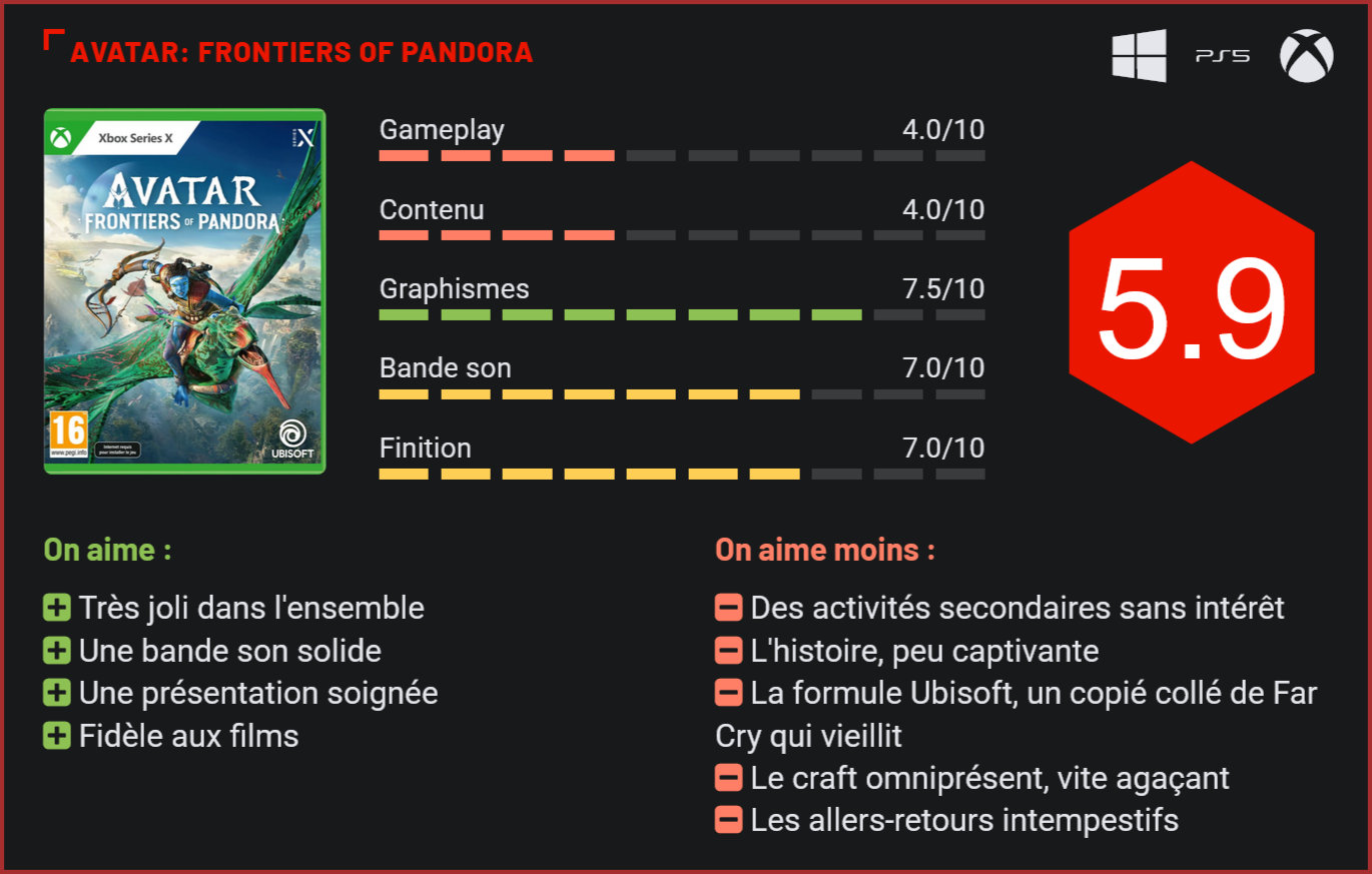 Entre des licenciements, restructurations et flops en série, l’année 2023 aura été particulièrement compliquée pour Ubisoft. C’est un fait, le géant français du jeu vidéo Ubisoft ne se porte pas bien. L’entreprise a connu une année 2023 particulièrement compliquée entre les licenciements et annulations de projets. Malgré une année difficile, l’entreprise est parvenue à sortir quelques nouveautés. Son titre le plus attendu était sans nul doute la nouvelle production de Massive Entertainment (The Division) – Avatar: Frontiers of Pandora. Visuellement, Les Frontières de Pandora est plutôt réussi. Vous vous souviendrez sans doute qu’Ubisoft s’était déjà risqué à l’exercice d’adapter Avatar en jeu vidéo, à la sortie du tout premier Avatar. Le jeu sorti à l’époque n’était toutefois pas franchement parvenu à laisser une emprunte derrière lui, se classant parmi les adaptations de films en jeux sans grande prétention. Frontiers of Pandora s’en démarque par son ambition démesurée. Tout d’abord, parce qu’il s’agit d’un jeu triple-A au budget démesuré. Ensuite, parce que les développeurs ne se sont pas contentés ici d’adapter l’intrigue des deux premiers films mais nous proposent une intrigue inédite qui nous fait davantage explorer l’univers d’Avatar. Enfin, parce qu’en terme de construction, Frontiers of Pandora est un jeu beaucoup plus ambitieux puisqu’il s’agit d’un FPS en open world, de surcroit un titre qui exploite pleinement le potentiel des consoles new-gen puisqu’il ne tourne que sur Xbox Series et PS5. Le jeu se joue entièrement à la première personne. Sur le papier, Frontiers of Pandora avait tout pour séduire. Un monde gigantesque à explorer selon ses envies, un système de craft évolué, un scénario ambitieux dans l’univers d’Avatar, et surtout un paquet de nouveaux éléments à découvrir par rapport aux films. Et de facto, il faudra bien lui reconnaitre une qualité indéniable : son immense fidélité au matériau d’origine. Car Frontiers of Pandora n’est non seulement un jeu qui nous permet d’explorer tout l’univers de Pandora, mais aussi un titre canon avec l’univers des films. Dans la peau d’un jeune Na’vi recueilli par la RDA, puis libéré par la Résistance, le joueur explorera librement le monde de Pandora en partant à la recherche des différentes tribus qui le peuplent dans le but de les fédérer à votre cause et de repousser au-delà des frontières de Pandora les envahisseurs. Vous pourrez aussi utiliser des armes humaines. Il faut toutefois bien l’avouer : si le monde d’Avatar est fascinant et admirablement construit, et si la présentation du jeu est soignée avec de nombreux dialogues et cinématiques, le récit n’est guère vraiment passionnant. Et pour une bonne raison. Frontiers of Pandora est comme la plupart des autres productions Ubisoft un jeu trop ambitieux, qui part dans toutes les directions et oublie de se concentrer sur une aventure captivante. Vous aurez ainsi tôt fait de remarquer l’abondance des quêtes qui vous sont proposées aux quatre coins de Pandora. Tantôt, c’est un Na’vi qui a disparu, qu’il faudra tenter de retrouver en partant à sa poursuite. Tantôt, une quête pour rechercher des matériaux en vue de construire une nouvelle sacoche… Les quêtes sont nombreuses, longues, et ont tendance à vous faire parcourir des distances excessivement longues pour rallonger artificiellement la durée de vie du jeu. Le syndrome Fedex est bien là, plus encore que dans les autres jeux open world d’Ubisoft. Et c’est bien dommage car le rythme de l’aventure est complètement morcelé. Ajoutez à cela le fait qu’on a l’impression de devoir sans cesse reparcourir les mêmes quêtes et que le loot et le craft sont fortement mis en avant dans le jeu et vous comprendrez vite que Frontiers of Pandora n’est pas un FPS comme les autres. Avant d’être un FPS, Avatar est un jeu de craft en open world, dans lequel les interactions avec les Na’vi prennent beaucoup plus de place que les combats ou l’exploration. Et il faut bien l’avouer, on s’ennuie souvent ferme dans cette aventure qui tire atrocement en longueur et manque cruellement d’inspiration. On notera d’ailleurs que même au niveau du bestiaire, on a l’impression d’affronter tout le temps les mêmes ennemis : quelques méchas et hélicoptères, ainsi que quelques créatures sauvages… Et c’est à peu près tout. N’espérez pas être surpris dans cette aventure, cela ne sera jamais le cas. Ubisoft a pourtant redoublé ses efforts pour proposer de la diversité dans son gameplay entre les phases d’enquête qui vous demanderont d’associer divers éléments pour découvrir de nouveaux indices, les mini-puzzles à résoudre ou encore les nombreuses quêtes de crafting qui vous obligeront à partir à la chasse ou à la cueillette dans le monde de Pandora pour trouver les éléments qui vous permettront de fabriquer les bons outils, armes et équipements… Dompter sa monture, un grand moment. Clairement, Ubisoft est parti dans toutes les directions et nous livre un jeu open world très vaste. Les différentes contrées de Pandora sont un régal à explorer. L’ennui, c’est que l’intrigue principale et les quêtes annexes ne sont pas franchement captivantes et qu’on finit vite par se perdre dans nos quêtes… Des quêtes qui tournent en rond, se répètent inlassablement et ne font jamais que montrer une toute petite partie du potentiel du jeu. Si le jeu part de très bonnes intentions, il faut bien admettre que le concept a beaucoup de mal à séduire, la faute à des choix parfois douteux. On pense par exemple au système de progression, qui ne repose pas sur de l’expérience mais un système de niveaux basé sur le nombre de compétences débloquées et l’équipement. Avatar laisse donc de côté son aspect RPG pour adopter un styl