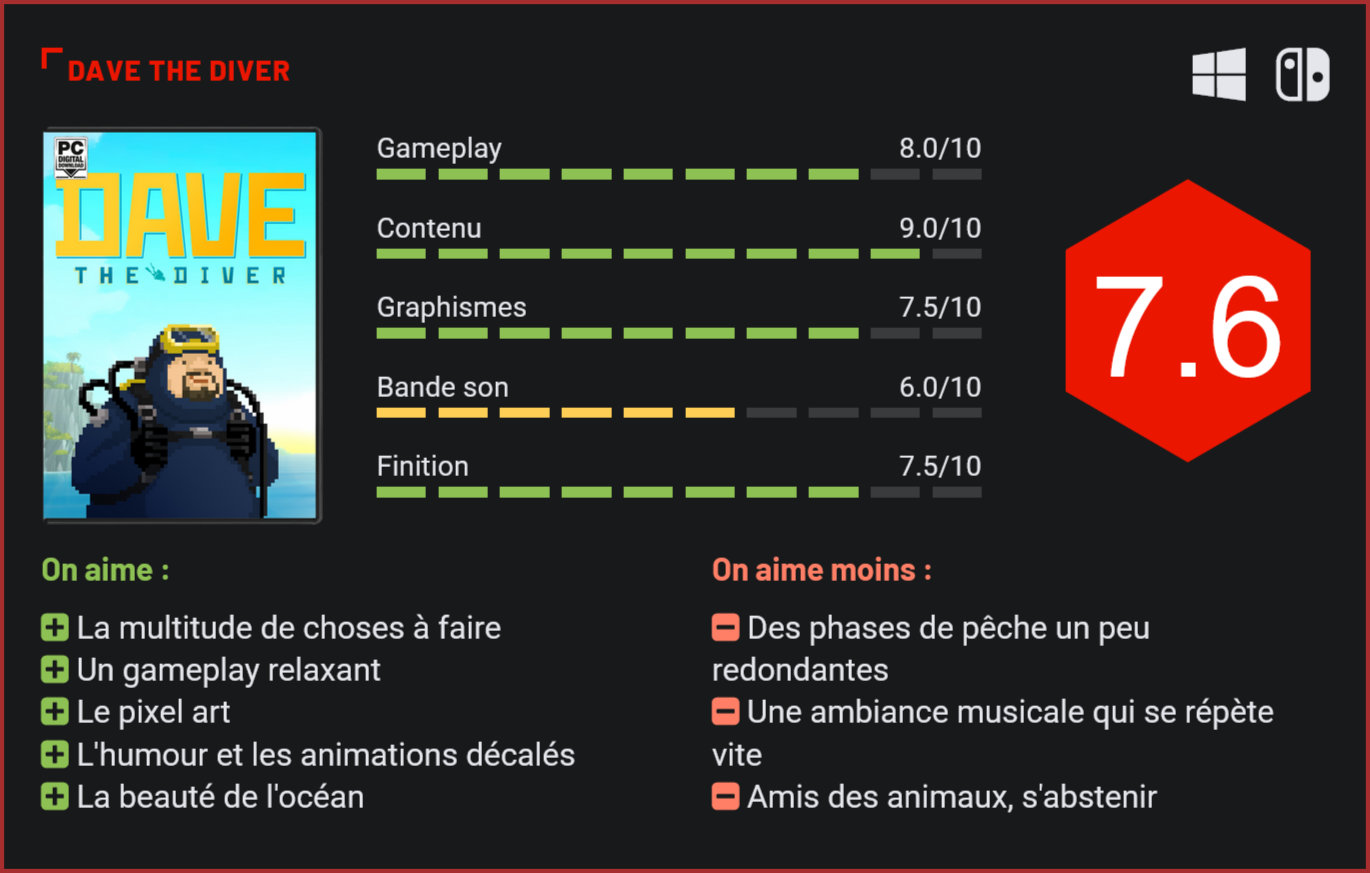 Entre pêche en plongée, gestion de restaurant, et mini-jeux en veux-tu en voilà, le jeu du studio Mintrocket propose un gameplay très diversifié et complet. Ajoutez un second degré un peu décalé et du pixel art bien léché, et voilà ! Une recette bien pensée à se mettre sous la dent. Si le jeu que nous avons testé pour vous, ne fait pas partie des nouveautés de ce début d’année, (il est sorti en juin 2023), il est revenu sur le devant de la scène récemment en dépassant la barre de 3 millions d’exemplaires vendus dans le monde. Ne vous laissez pas trompez par le pixel art et sa nomination de “Meilleur jeu indépendant” aux Game Awards, Dave The Diver est développé par le studio Mintrocket, une filiale du géant coréen Nexon, propriétaire de MapleStory and Dungeon & Fighter. On voit mal comment un projet soutenu par une entreprise à plus de 1,5 milliards d’euros de chiffres d’affaires en 2021 pourrait être considéré comme “indépendant”. Dans ce jeu, on incarne Dave, un pêcheur plongeur (jusque là, ça colle au titre), dont le vieil ami, Cobra, qui a toujours plus d’un tour dans son sac, lui demande d’écourter ses vacances pour venir l’aider à lancer son nouveau restaurant de sushis. Au fourneaux, Bancho, un chef taciturne et bourru, mais possédant un talent fou, concocte à la tombée de la nuit des plats savoureux avec la pêche de la journée de Dave. En dehors de faire tourner le restaurant, Dave va rencontrer de nombreux personnages, avec leurs histoires propres et quêtes à suivre. Tous plus clichés les uns que les autres, mais ça marche. Entre les cinématiques stylisées et exagérées, rappelant un peu Ace Attorney, et des dialogues remplis de second degré, le jeu se moque de Dave, de ses amis, et d’à peu près tout le monde dans cet univers. Bansho maitrise l’art du sushi Le gameplay s’articule autour de ces deux temps : plongée et pêche en journée, gestion d’un restaurant de sushi au soir. Il peut paraître simple de premier abord, mais Dave The Diver est extrêmement riche. On passe de la gestion de son oxygène sous l’eau, de son inventaire, de son équipement et des batailles avec des créatures sous-marines, à la gestion du personnel, du stock, des améliorations des recettes et de la décoration au restaurant. Chaque environnement apporte son lot de mini-jeux, parfois amusants, vite redondants, mais quasi tous évitables, ouf. Visuellement, le mix entre pixel art et 3D rend le jeu très nostalgique, avec une touche de modernité bienvenue. C’est parti pour le rush de 21h ! Pour ceux qui aime les jeux avec une routine, c’est pour vous ! Pas de panique pour les autres, il y a constamment des évènements, des quêtes et des morceaux d’histoire qui viennent ponctuer cette routine (donc on ne s’ennuie pas trop vite). On navigue dans cet univers via un téléphone portable avec de multiples applications : un équivalent d’Instagram, “Cooksta”, pour ramener des clients; un système de cartes à collectionner pour chaque poisson de la baie, comme des Pokémons; des succès journaliers pour aider les activistes écologistes du coin, et bien d’autres fonctionnalités. Dave s’inventera même archéologue des profondeurs, en explorant les vestiges d’un ancien peuple marin qui, d’après la légende, aurait vécu dans les tréfonds de la baie il y a bien longtemps… Mais que leur est-il arrivé ? Et ont-ils réellement disparu ? Oh, la jolie mosaïque ! Petit bémol pour la musique. Si certaines sont agréables de prime abord, elles deviennent (très) vite redondantes et finissent par agacer. Tout particulièrement le thème du bateau de Cobra, qui fait penser à une musique d’ascenseur et devient rapidement insupportable. Un bon trigger warning, également, pour les amis des animaux : la pêche au harpon peut être assez dérangeante. Les poissons se débattent et des nuages de sang viennent colorer la mer à chaque touche. Les sushis végétariens ne sont pas vraiment au programme, et Dave abat requins, murènes, méduses, poissons-clown et calamars sans aucune gêne. Il pille algues, coquillages, coraux, épaves et temples mystérieux du peuple des profondeurs. Pour le respect des fonds marins, on reviendra. Par ici, petit petit ! Heureusement, la mécanique du jeu vient alléger notre conscience quelque peu : nous sommes dans le Trou Bleu, un lagon magique où chaque jour la faune, la flore et même l’environnement tout entier, changent et se réinitialisent. En plus, Dave se bat contre les méchants pécheurs industriels, donc pas d’états d’âme à avoir : nous sommes du côté des gentils ! Enfin… si on oublie que Cobra semble tremper dans des affaires louches et que Bancho refuse de parler de son passé… D’après le site How Long to Beat de IGN, qui ressence le temps nécessaire pour terminer un jeu, la quête principale de Dave The Diver dure un peu plus de 23 heures. Les plus complétistes mettront jusqu’à 46 heures pour tout finir. On est donc sur un jeu de moyenne haleine, pour un prix très honnête de 19,99€, parfait pour ceux qui ne souhaitent pas passer des mois devant leur PC, mais qui s’attendent tout de même à une durée de vie correcte. Conclusion Avec un gameplay très diversifié et complet, Dave The Diver du studio Mintrocket propose une expérience de jeu extrêmement riche. On adore le côté relaxant de la routine, entre pêche en journée et gestion de restaurant de sushi le soir. Tout cela contrebalancé par des évènements et des quêtes qui apportent constamment de la nouveauté. Attention, cependant, ce jeu n’est pas l’ami des animaux, et Dave va pêcher au harpon et piller sans vergogne le Trou Bleu, un lagon où toute la faune et la flore réapparait magiquement chaque nuit. Mais l’humour décalé et le visuel nostalgique et moderne, alliant pixel art et 3D, viennent atténuer l’impact des actions du plongeur. Dave The Diver est
