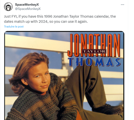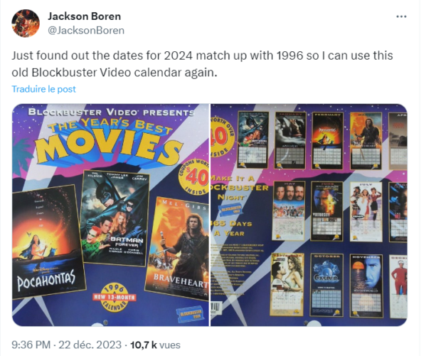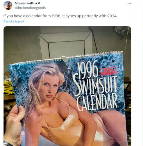 Depuis quelques jours, un engouement a vu le jour autour de calendriers de l’année 1996. Un calendrier Pamela Anderson s’est ainsi revendu à 150 euros sur un site de commerce en ligne. Depuis quelques jours, des calendriers de l’année 1996 sont revendus à des prix exorbitants sur les sites de revente en ligne. La cause ? Un point commun entre l’année 1996 et l’année 2024. En effet, ces deux années sont bissextiles avec un lundi comme premier jour, comme le souligne le site Time and Date. Par conséquent, un calendrier de 1996 peut tout à fait être utilisé pour l’année en cours. À titre d’exemple, un utilisateur de X explique à propos d’un calendrier mettant en avant l’acteur Jonathan Taylor Thomas (Papa bricole) : « Pour votre information si vous avez ce calendrier de 1996 avec Jonathan Taylor Thomas, les dates correspondent à celles de 2024, donc vous pouvez le réutiliser ». Un autre utilisateur de X a quant à lui retrouvé un calendrier d’une entreprise de location de VHS. Ce calendrier met ainsi en avant : Braveheart, Batman Forever, Pocahontas ou encore Casper. Si certains de ces calendriers de 1996 sont revendus une vingtaine d’euros, d’autres sont revendus à plus de 100 euros. C’est notamment le cas d’un calendrier Pamela Anderson (Alerte à Malibu) revendu à 150 euros. À noter également que 1996 et 2024 présentent deux autres similarités : les Jeux olympiques (1996 à Atlanta et 2024 à Paris) et une élection présidentielle aux États-Unis. Par ailleurs, il faudra attendre 2052 pour pouvoir à nouveau utiliser les calendriers de 1996 et 2024. En tous cas, si vous possédez un calendrier de l’année 1996, vous pourriez effectuer une bonne affaire…