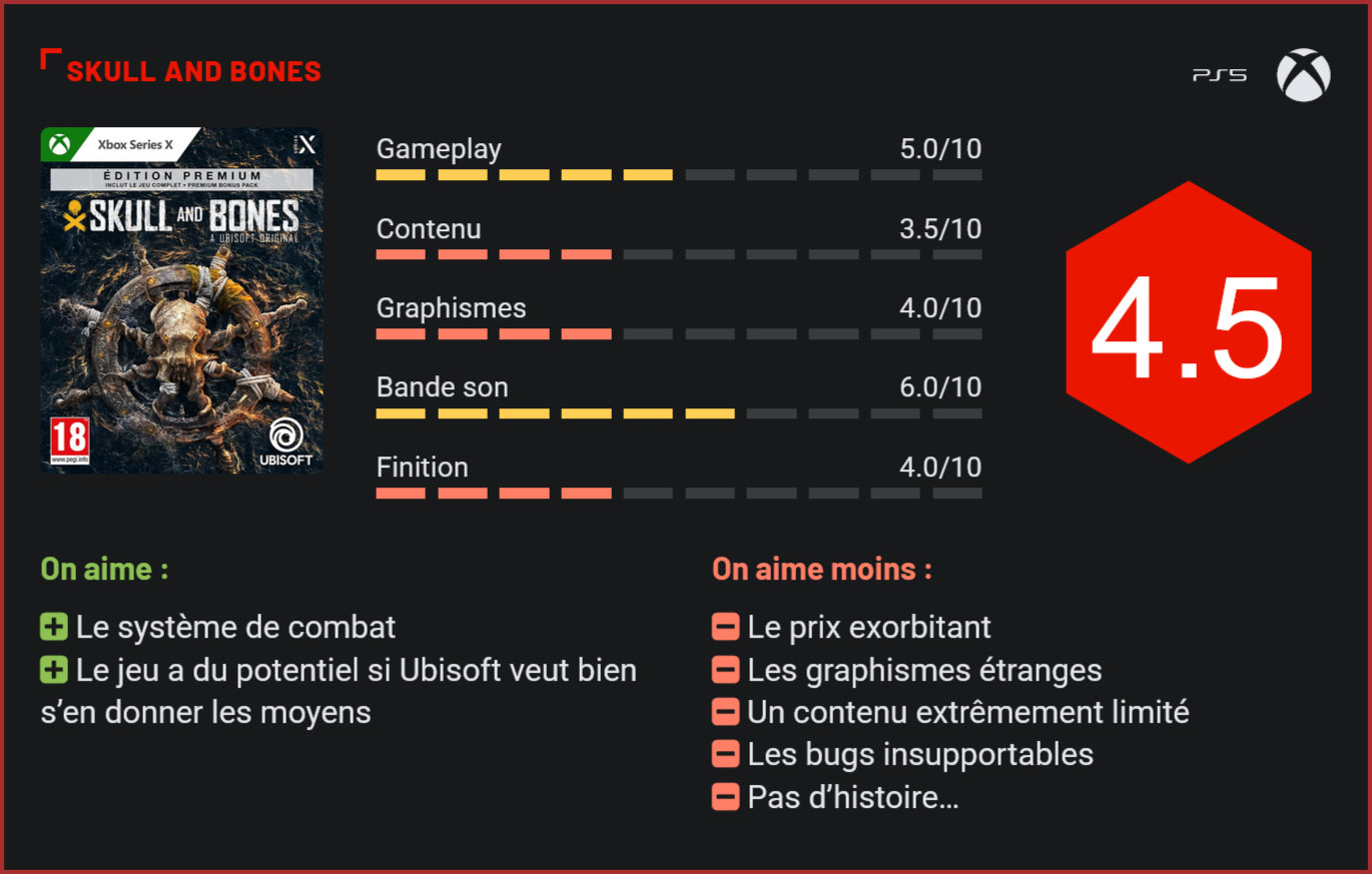 Après six ans d’un développement houleux, Skull and Bones débarque enfin sur nos plateformes, mais il faut l’avouer, le jeu peine à convaincre… Dans les années 2000 et au début des années 2010, Ubisoft était un studio admiré pour son ambition avec les débuts de la licence Assassin’s Creed qui avaient établi une nouvelle manière de penser l’Open World. De cette période, on retiendra particulièrement deux titres mythiques : Assassin’s Creed 2 et le quatrième volet, Assassin’s Creed Black Flag. De nos jours, il faut avouer que le studio franco-québécois a beaucoup perdu de sa superbe, et qu’on lui reproche souvent une absence de prise de risque, des jeux expédiés et des mondes ouverts vides et répétitifs. Ubisoft nous avait habitué à mieux niveau graphismes… Mais c’est un jeu en multijoueur. Aussi peut-on comprendre le désir d’Ubisoft de renouer avec ses anciens succès. Si ça a plutôt été une réussite avec Assassin’s Creed Mirage, qui était un clin d’œil assumé au tout premier opus de la franchise, un autre jeu devait quant à lui renouer avec le succès de Black Flag. Véritable arlésienne des studios, Skull and Bones était un projet épique. Imaginez plutôt : parcourir tout l’océan Indien au dix-huitième siècle dans un véritable MMORPG des mers façon Sea of Thieves, saborder les bateaux d’autres joueurs dans des combats dignes de Black Flag en multijoueur, et devenir la terreur des Sept Mers ! Le jeu a pourtant eu bien du mal à sortir, étant repoussé et repartant complètement de zéro à plusieurs reprises pendant pas moins de six ans après son annonce, rarissime pour Ubisoft à qui on reproche souvent l’inverse : bâcler ses jeux pour les sortir au plus vite. Le problème avec tout projet longuement anticipé (film, jeu, voire livre), c’est qu’il amasse beaucoup de hype de la part des fans. Et quand l’œuvre sort finalement, sa qualité est comparée à des attentes particulièrement fortes. C’est pourquoi ce genre d’œuvre tend généralement à décevoir plus que de raison. Dans la réalité, les requins ne vous ferons rien si vous les laissez tranquille. Mais dans Skull and Bones… Alors quand on a entendu les premiers retours sur Skull and Bones, la déception a été palpable. Et maintenant que nous avons pu mettre les mains sur le produit fini, il faut reconnaître qu’effectivement, même en faisant abstraction de toutes les attentes, le jeu peine à convaincre. Ce qui n’est pas aidé par les déclarations grandiloquentes d’Yves Guillemot qui en parle carrément comme d’un jeu AAAA. Vous avez bien lu, pas AAA, mais bien AAAA ! Non content d’inventer une toute nouvelle catégorie du jeu vidéo pour Skull and Bones, le studio décidé également de le vendre au prix fort : 80 euros, le justifiant par la masse de contenu. On comprend que ça ait de quoi faire grincer les dents… Mais concrètement, ça donne quoi, Skull and Bones ? Après une cinématique pour vous plonger dans l’ambiance, vous êtes directement placés au cœur d’une bataille navale épique contre toute la marine anglaise. (TOUTE, le jeu ne fait pas dans la dentelle). Après une défaite inévitable, vous êtes invités à créer votre personnage, et c’est là que vous prenez le défaut en pleine figure : les graphismes. Explorer une épave : un rare moment d’intérêt Skull and Bones est graphiquement… bizarre. Pas vraiment laid, mais étrange. Tout semble huileux, dégoulinant, moite. On est loin du réalisme des derniers Assassin’s Creed qui étaient, il faut le reconnaître, visuellement impeccables. On est à mi-chemin entre le réalisme et le cartoonesque sans vraiment sembler vouloir se décider, et ça crée un style entre-deux et dérangeant. Vous êtes ensuite recueilli par deux pirates qui semblent tellement apprécier votre présence qu’ils font de vous immédiatement leur capitaine, et ce sans trop de raison. Les personnages ne sont pas non plus très crédibles dans Skull and Bones… Les combats sont assez fluides, mais pas vraiment représentatifs de ceux de Black Flag, ou de la série Assassin’s Creed en général. C’est une version simplifiée à mi-chemin entre ceux-ci et un shooter, mais qui n’est en réalité pas désagréable. Pour tous les reproches que l’on peut faire au jeu, ce ne sont pas ses combats qui posent problèmes. Manier le navire est en revanche une autre paire de manche. Mais c’est souvent le cas dans les jeux vidéo dès qu’il y a un bateau, donc est-ce qu’on peut vraiment le reprocher à Skull and Bones ? Non. Le vrai problème de Skull and Bones, c’est qu’on a vite fait le tour : couler des navires, piller des navires, récolter des ressources, ne pas se faire attaquer par des requins… On se demande bien où se trouve la « masse de contenu » promise par Ubisoft. La preuve : certains joueurs ont déjà atteint la « fin » du jeu, et le jeu n’est même pas encore sorti ! Ce qui, quand on parle d’un jeu de type MMO, laisse un peu à désirer… Ce qui manque à Skull and Bones, c’est une histoire. Skull and Bones n’a pas vraiment de scénario, si ce n’est : je veux devenir le plus grand capitaine de l’Océan Indien, et c’est bien malheureux… Ce monde est tellement vide… Certains ont aussi noté un gros déséquilibre entre terre et mer, où les passages à terre semblent presque totalement inutiles. Peut-être… Ce qui est sûr, c’est qu’il est impossible de quitter le navire, ni même de nager. Pas d’homme à la mer dans Skull and Bones. La bande-son, en revanche, est plutôt sympathique, du moins pour ceux qui apprécient le style « synthétiseur intimidant » typique des derniers Assassin’s Creed. Un peu moins pertinent ici, étant donné qu’il n’y a pas le côté science-fictionnel de l’Animus et (Spoiler pour Assassin’s Creed Odyssey, et pour la série en général) qu’on ne découvre pas les secrets d