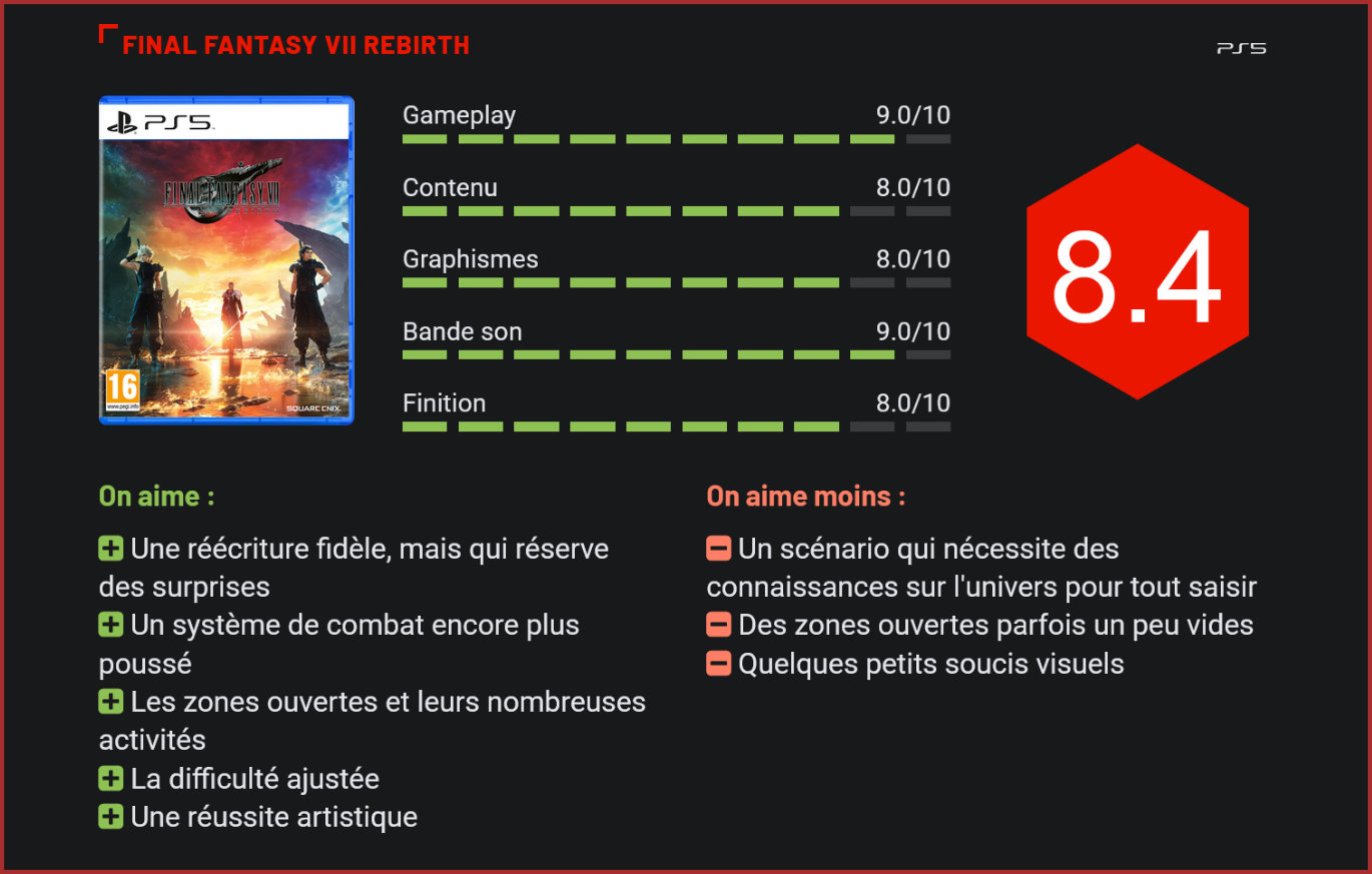 Quatre ans après le premier épisode de cette trilogie, le projet de remake de Final Fantasy VII est de retour avec une première suite intitulée “Rebirth”. Cet opus continue les aventures de Cloud en adaptant la suite du jeu original, et se permet même de renverser la formule installée par le précédent. Très attendu par les fans de Final Fantasy VII, Rebirth débarquera dans quelques jours en exclusivité sur Playstation 5. Faisant suite à Final Fantasy VII Remake, ce nouvel épisode est le second opus d’une trilogie consacrée à la refonte de l’épisode culte de la licence. Le but de Square Enix est de reproduire les événements du jeu original tout en approfondissant drastiquement l’univers. Un projet ambitieux qui avait su charmer une grande partie du public suite à la sortie du premier, et qui en avait aussi déçu beaucoup à cause de son aspect épisodique et des nombreuses différences avec l’original. Rebirth continue dans la direction empruntée par Remake tout en répondant à quelques critiques. Le premier épisode racontait les aventures de Cloud Strife, un mercenaire anciennement SOLDAT de la Shinra, une entreprise gérant l’apport d’énergie à travers toute la planète et en particulier dans le terrain de jeu de ce premier épisode : la ville de Midgar. Engagé par le groupe écoterroriste ”Avalanche”, Cloud découvre que la Shinra cache de sombres secrets et qu’elle participe activement à la destruction de la planète en y pompant des ressources à outrance. Démarre alors une aventure dans laquelle le sort du monde est en jeu, impliquant également l’antagoniste culte qu’est Sephiroth, le SOLDAT légendaire qui partage un passé commun avec le héros. De nouveaux éléments venaient aussi complexifier les choses et insinuer que cette trilogie n’allait pas nécessairement être une reproduction identique de Final Fantasy VII. En témoigne l’importance des filers, des entités mystérieuses jamais apparues auparavant et vaincues à la fin de Remake. Rebirth, lui, reprend directement après la fin de son prédécesseur. Cloud, Tifa, Barret, Aerith et Red XIII arrivent dans la ville de Kalm après une longue route. Le héros en profite pour raconter son histoire en commun avec Sephiroth et comment ce dernier est devenu l’antagoniste que l’on connaît. Ce flashback bien connu des fans sert de tutoriel à ce deuxième jeu, permettant d’ailleurs de brièvement contrôler le soldat légendaire. Suite à cela, le jeu s’ouvre en nous laissant vagabonder dans la ville de Kalm complètement ré-imaginée. De nouveaux événements se produisent cependant très vite et celles et ceux qui détestaient les changements apportés par Remake risquent d’être un peu déçus. Le scénario est pourtant palpitant et approfondit de nombreux moments de l’original en ajoutant beaucoup de contexte. Les fans de Final Fantasy VII savent à quoi s’attendre, mais le titre réserve aussi de nombreuses surprises et se permet également de prendre le temps d’aborder en profondeur les relations entre les personnages principaux. Tout comme Remake savait si bien le faire, Rebirth capture l’ambiance de l’épisode original à merveille, n’hésitant pas à alterner entre des moments très sérieux et des passages beaucoup plus légers et absurdes. Le titre démarre par le flashback culte de Final Fantasy VII. Abordons tout de suite la question épineuse de l’accessibilité de ce Final Fantasy VII Rebirth. Si le projet se vend comme un “Remake” de Final Fantasy VII en trois parties, il en est aussi une réécriture qui ajoute de nouvelles choses et qui prend en compte de nombreux éléments installés dans l’univers étendu développé après la sortie du jeu original. Le scénario de Rebirth reste compréhensible sans trop de contexte (une vidéo résumant Final Fantasy VII Remake est d’ailleurs disponible dans le menu principal du jeu, même si elle manque clairement de détails), mais il est probablement plus sage de connaître l’univers de Final Fantasy VII, le scénario du jeu original ainsi que les nombreux spin-offs pour saisir toutes les subtilités du scénario de Rebirth qui vient ajouter de nombreuses choses. La structure de Final Fantasy VII Rebirth se veut très différente de son prédécesseur. Là où Remake était un jeu qui nous forçait à rester sur les rails du scénario durant la majorité de l’aventure, le nouvel épisode propose bien plus de liberté. Pour la première fois, nos protagonistes ne sont plus cloisonnés dans la ville de Midgar mais vont cette fois explorer le monde extérieur. Le titre va alors alterner entre des passages scénarisés très dirigistes et la possibilité de se perdre dans de très grandes zones ouvertes. Si elles sont parfois un peu vides, ces dernières offrent de nombreuses activités annexes déblocables en activant des tours dans plusieurs zones. Un procédé peu original, mais bien justifié par l’univers présenté ici et qui offre un rythme très différent de Final Fantasy VII Remake. L’exploration est ici encouragée par un nouveau système de craft ou par certaines mécaniques de combats, et traverser l’univers de Final Fantasy VII a dos de Chocobo est très agréable. Nous avons aussi l’occasion de prendre part à de très nombreux mini-jeux dispersés dans ces zones ouvertes ou dans les villes. Les zones ouvertes offrent forcément plus de liberté et un rythme tout à fait différent de celui de Remake. Côté gameplay, Final Fantasy VII Rebirth reprend la majorité de ce qui faisait le charme de son prédécesseur, mais apporte des changements plus que bienvenus. Le titre propose un système de combat mélangeant des éléments de jeu d’action avec une couche de stratégie. Nos attaques, esquives et gardes sont utilisées en temps réel, mais ce ne sera généralement pas suffisant pour venir à bout des gros ennemis qui nécessitent un peu plus de réflexi