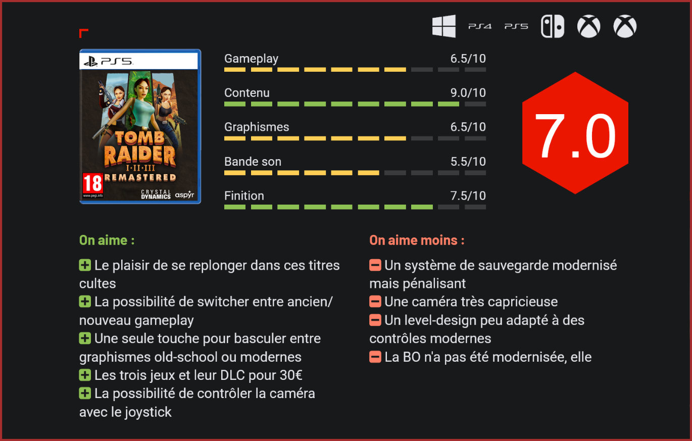 Vous rêviez de vous replonger dans les Tomb Raider d’origine, mais n’avez plus les jeux Playstation ? Ça tombe bien, Crystal Dynamics et Aspyr ont exaucé votre rêve. Un rêve qui aurait pu davantage s’adresser à tous les joueurs… Plus de 27 ans après la sortie des toutes premières aventures de Lara Croft, la franchise Tomb Raider reste l’une des plus marquantes de l’industrie du jeu vidéo. En onze épisodes, la saga s’est vendue à quelque 85 millions d’exemplaires, démontrant que Lara Croft fait partie des figures incontournables de la pop culture. Pourtant, certains oublient que cette aventurière a fait ses lettres de noblesse à la fin des années 1990, sur Sega Saturn et PlayStation. En 1996, Tomb Raider débarque sur Saturn et PlayStation, marquant un véritable tournant dans le monde du jeu de plates-formes et d’aventure. Sorti près d’un mois après Super Mario 64, Tomb Raider devient très vite incontournable et une référence dans l’industrie. Son héroïne ultra charismatique, ses environnements variés et son action perpétuelle ont permis à la franchise d’Eidos (l’éditeur de l’époque) de s’inscrire au panthéon au jeu vidéo. Après Tomb Raider: Anniversary qui, il y a 17 ans, servait de remake au tout premier épisode, c’est un remaster des trois premiers opus qui est servi aux fans. La différence est très importante, puisque le remaster se veut extrêmement fidèle au matériau d’origine, en proposant un level design presque identique à celui de l’époque et un gameplay légèrement modernisé sans être trop éloigné. Bien évidemment, certains passages emblématiques sont de retour. Abordons d’abord l’aspect gameplay de ce remaster. Deux types de contrôles distincts sont proposés, à savoir des contrôles originaux et des contrôles modernisés. Les premiers sont exactement les mêmes que dans les premiers Tomb Raider. Il faut être extrêmement précis dans le calcul des trajectoires lors des sauts, les déplacements sont très robotisés… Vous devrez ainsi vous y reprendre à deux fois (si pas plus) lorsque vous devrez atteindre une corniche, sauter sur une autre plateforme ou éviter un ennemi pour qu’il ne vous inflige pas des dégâts. Si, à l’époque, ce type de gameplay était moderne, quoique parfois critiqué pour sa rigidité, il n’est vraiment plus d’actualité en 2024. Pour pallier à ce détail qui pourrait rebuter plus d’un joueur, les développeurs ont mis au point des mécaniques de gameplay “modernes”. Entendez par là qu’il suffit désormais de viser avec L2 et de tirer avec R2, que le joystick vous permet de vous déplacer, vous et la caméra, à 360° et que les sauts ne sont plus aussi compliqués à réaliser qu’auparavant. Malheureusement, si on salue l’effort consenti par les équipes américaines d’Aspyr, on se rend très vite compte qu’un gameplay de ce type n’est absolument pas adapté à un level design de 1996. En effet, si la caméra peut désormais être contrôlée grâce au joystick droit, celle-ci part dans tous les sens dès que l’on se retrouve dans des espaces exigus. Les sauts peuvent être exécutés plus aisément, mais les environnements ayant été pensés pour un gameplay dirigiste et rigide, sauter sur une plateforme ou s’agripper au bord d’une falaise devient vite un véritable calvaire. Alors, gameplay moderne, pourquoi pas, mais pas dans un level design aussi vieillot. Privilégiez le gameplay classique qui, même s’il vous demandera quelques heures d’adaptation pour vous acclimater, est bien plus adapté à l’univers des premiers Tomb Raider. Le manoir Croft et son parkour permettent de se familiariser au gameplay exigeant de l’époque… Dans les nouveautés que l’on pourra noter du côté du gameplay, il y a donc cette caméra qui peut être facilement contrôlée, mais également un système de sauvegarde amélioré. Auparavant, il fallait trouver une espèce de cristal bleu pour sauvegarder, là où la sauvegarde manuelle est aujourd’hui proposée. Bien plus pratique, elle est toutefois pénalisante dans le sens où si vous n’avez pas ce réflexe de sauvegarder, vous serez parfois obligé de revenir très loin en arrière dans le niveau. Une sauvegarde automatique aurait été bien plus pratique, mais on ne peut pas avoir le beurre et l’argent du beurre. L’autre nouveauté marquante de cette compilation est bien évidemment la modernisation des graphismes. N’espérez pas de l’Unreal Engine 5 ici, ce sont les mêmes décors cubiques qui ont été embellis. L’eau est désormais plus réaliste et les jeux de lumière plus poussés, mais les murs restent de très simplistes cubes aux textures répétitives. Ça a un certain charme, même si les plus jeunes n’y verront que des graphismes old-school assez vilains. Pour les plus anciens, c’est un moyen de se replonger dans des graphismes améliorés, vieux de près de trente ans, et très rapidement. L’avantage, c’est qu’en appuyant sur une seule touche, et ce, à n’importe quel moment, vous pouvez basculer entre les graphismes “modernes” et les graphismes old-school. Même Lara a bénéficié d’un joli ravalement de façade, avec une modélisation extrêmement proche de celle des Legend, Anniversary et autres Underworld. On regrettera toutefois que la bande sonore soit complètement identique à celle de l’époque, assez désuète et vieillotte, et qu’elle n’ait pas, à la limite, été retravaillée. Il est possible, à tout moment, de revenir aux graphismes d’origine en pressant une seule touche. Pour bénéficier de cette compilation, Aspyr et Crystal Dynamics vous demandent de débourser 30€. Un prix de vente qui est clairement raisonnable quand on sait que les trois jeux, auxquels viennent se greffer trois niveaux inédits supplémentaires, dépassent les 65 heures de durée de vie. Toutefois, les développeurs auraient pu y aj