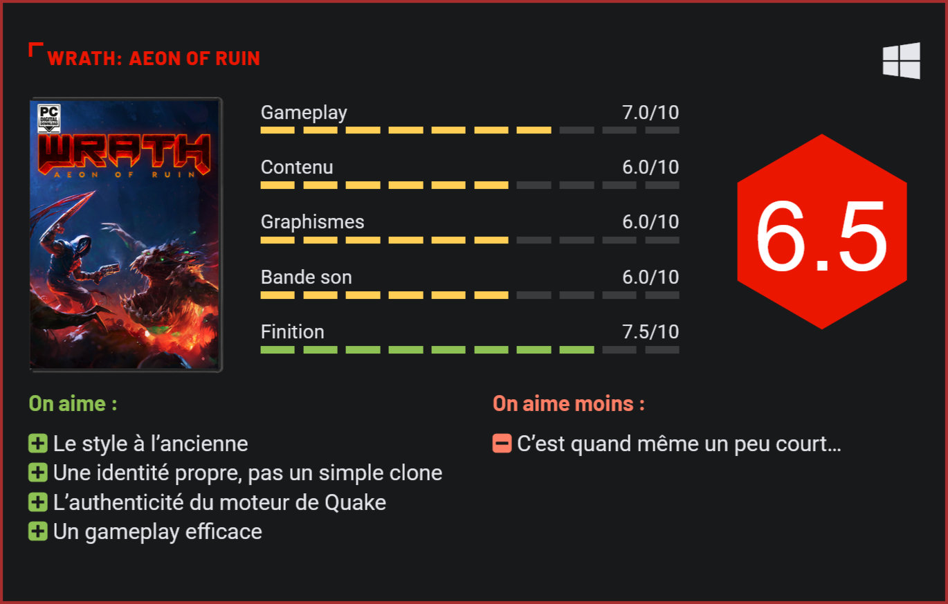 L’esthétique “retro” est un bel argument de vente, mais ne doit pas faire figure de cache-misère. Heureusement, ce ne semble pas être le cas de Wrath : Aeons of Ruin. Quand le tout premier Doom sort en 1993, c’est une petite révolution du jeu vidéo. On peut aisément le comprendre : c’est alors l’un des tous premiers jeux à proposer des graphismes en 3D, des graphismes qui n’ont, qui plus est, pas si mal vieilli quand on considère la primitivité du moteur de jeu. Mais au fil des années, un inévitable phénomène s’est produit : ce qui était alors apprécié comme étant la pointe de la technologie est au contraire devenu synonyme de jeux rétros. Et depuis quelques temps maintenant, on voit fleurir tout un tas de jeux qui ne semblent avoir qu’un seul objectif : reproduire à l’identique le tout premier jeu de la série. Parmi ceux-ci : Wrath : Aeon of Ruin est loin d’être le dernier. Néanmoins, son approche est un peu différente des autres rétro-clones de DOOM, car il ne se contente pas de copier la recette du premier jeu, mais essaie bien d’inventer la sienne propre, un effort louable qui donne à ce jeu une patte un brin différente. Affronter des ennemis dans des donjons : un gameplay classique mais sympa C’est à l’épée (accrochée au bras) que vous allez tout d’abord combattre les ennemis dans Wrath, avant de pouvoir obtenir votre premier pistolet, puis fusil, afin de dégommer des monstres de plus en plus importants, somme toute très classique, mais pourquoi changer une équipe qui gagne ? Niveau ambiance, en revanche, on n’est pas vraiment dans le style Doom. On se croirait presque plus dans un Daggerfall ou un Hexen (le deuxième étant d’ailleurs une inspiration pour Wrath : Aeon of Ruin). L’ambiance est beaucoup plus médiévale que sci-fi, et cela se manifeste particulièrement dans son premier hub : un cimetière enneigé et polaire, on se croirait presque dans une espèce de proto-Skyrim. Les premiers niveaux ressemblent d’ailleurs à des donjons qui sont surtout remplis de squelettes mais aussi de quelques… aliens ? démons ? Des monstres à l’ancienne quoiqu’il en soit… Une ambiance plus RPG que FPS… C’est en effet autour des hubs que s’organise le gameplay. À partir de ceux-ci, vous êtes envoyé dans des niveaux à la difficulté de plus en plus complexe où, à la manière des jeux à l’ancienne, vous ne pouvez pas sauver à chaque fois que vous le voulez ! Vous devez en effet accéder à un artéfact que vous pourrez utiliser à n’importe quel moment pour sauver, avec le petit challenge supplémentaire que vous ne pourrez récupérer que la santé que vous aviez au moment de la sauvegarde. Ou alors, vous pourrez retourner au hub, bien entendu… Dans certains niveaux, l’ambiance redevient plus similaire à DOOM tout de même… Un gameplay facile et efficace, mais plutôt sans pitié. Même si les munitions sont assez faciles à trouver, il vous faudra beaucoup d’adresse afin de progresser assez loin. Pas mal d’adresse dis-je, et une logique de « try and fail » où vous finirez assez vite par apprendre la géographie des niveaux afin de pouvoir vous préparer à affronter les ennemis. On est sur un jeu à l’ancienne, Il est assez logique que le niveau de difficulté soit élevé, et Wrath : Aeon of Ruin ne verse pas non plus dans l’excès inverse et reste battable. Wrath : Aeon of Ruin n’est pas qu’un simple FPS, et inclut quelques (très légers) éléments de RPG, à savoir que l’on peut faire progresser son personnage au cours de l’aventure en récoltant des artéfacts, et qu’on dispose d’un journal de bords bien pratique… S’il y a un élément des jeux à l’ancienne qui est souvent utilisé par les développeurs de « rétro-clones », ce sont en effet les bonus flottant dans les airs. Un héritage des jeux en 2D dont Il est vrai qu’on le voyait beaucoup dans les tous premiers jeux 3D, et qui crée donc un effet « à l’ancienne ». Mais d’un autre côté, ce n’est pas du plus élégant, et cela tend à casser toute forme d’immersion. De ce point de vue, Wrath : Aeon of Ruin a choisi la modération : les seuls objets que l’on voit flotter dans les airs sans raison sont les points de sauvegarde (mais ceux-ci peuvent facilement s’expliquer comme des manifestations spirituelles du personnage) et les armes, qui forment donc le gros élément qui va à l’encontre de l’immersion. Une caractéristique qui est tout à l’honneur de Wrath : Aeon of Ruin, c’est la manière dont il a été développé. Il fonctionne en effet sur le moteur de jeu de Quake, qui date de 1996, dans une version à peine mise à jour. C’est par ailleurs le premier jeu à sortir sur ce moteur depuis 20 ans ! Car c’est de la communauté modding de Quake qu’a émergé le projet… Non content de reproduire l’apparence des jeux à l’ancienne, Wrath : Aeon of Ruin fonctionne donc également techniquement comme un jeu de l’époque, une attention toute particulière de la part des développeurs pour s’assurer que les sensations d’époque soient respectées. Qui plus est, pas de bugs en vue pour ce jeu à l’ancienne qui utilise donc un moteur « bien rôdé » grâce à un temps de développement particulièrement long si on le compare à celui des jeux de l’époque, et un early access qui a commencé dès 2019 (un peu à la manière de Baldur’s Gate 3). Et c’est sans doute là le côté le plus intéressant de ce jeu : la sincérité. Loin de se contenter de faire un jeu qui n’a que vaguement la saveur des jeux rétros sans en avoir la profondeur, Wrath : Aeon of Ruin est profondément honnête dans sa volonté de reproduire la sensation d’un jeu rétro. Alors bien sûr, il ne pourra jamais reproduire à l’identique le plaisir qu’il y avait à jouer à un tel jeu à l’époque des « pionniers du gaming en 3D », mais ça reste un bel hommage, le to