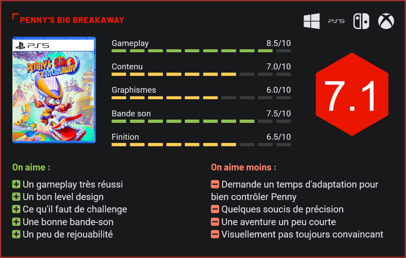 Si les jeux de plateforme en 3D ne sont plus autant en vogue qu’à une autre époque, certains continuent de proposer de nouvelles expériences originales. C’est notamment le cas du studio Evening Star dont certains membres sont bien connus des fans de Sonic. Sorti par surprise à la fin de ce mois de février, Penny’s Big Breakaway est la toute première production d’un studio indépendant nommé Evening Star. Si le nom de cette équipe ne vous évoque peut-être rien, il est sans doute nécessaire de préciser qu’une partie des développeurs de ce studio sont à l’origine d’un certain Sonic Mania, le glorieux et acclamé retour à la 2D du hérisson bleu paru en 2017. Nous pouvons par exemple y retrouver Christian Whitehead, figure emblématique de la communauté Sonic. Cette équipe s’est, cette fois, lancée dans la création d’un jeu de plateforme en 3D qui continue tout de même à s’inspirer de la mascotte de Sega. Dans Penny’s Big Breakaway, nous incarnons l’artiste de rue Penny et son yo-yo vivant qui vont participer à une audition auprès de l’empereur Eddie. Par erreur, Yo-Yo humilie l’empereur et Penny devient l’ennemie public numéro un. Forcée de fuir, elle va devoir traverser tout un tas d’environnement en évitant les gardes d’Eddie et trouver une solution pour calmer la situation. Si le scénario n’est pas renversant, il donne un contexte suffisant pour lancer cette suite de niveaux de plateforme. De petites cinématiques permettent de faire avancer cette courte histoire entre les différents mondes. Si le gameplay peut rebuter dans un premier temps, il cache une grande richesse. Cette aventure se concentre avant tout sur son gameplay au demeurant très réussi. Ce dernier demande tout de même un certain temps d’adaptation puisque Penny se révèle peu maniable et un peu rigide au premier abord. Si cet aspect peut représenter un frein, il est aussi un bon moteur pour apprendre à utiliser les différentes capacités de Penny et de son yo-yo. Un peu à la manière des premiers Sonic, Penny’s Big Breakaway utilise beaucoup sa physique et nous demande de l’exploiter pour jouer vite et bien. L’héroïne peut attaquer les ennemis en lançant son yo-yo, mais peut aussi se propulser en avant, se balancer en plein air, faire un double saut, s’accrocher au bord des plateformes et surtout rouler sur son yo-yo afin de prendre de l’élan en dévalant des pentes. Derrière ses contrôles parfois peu conventionnels se cache un gameplay très réussi, Penny’s Big Breakaway se montre particulièrement riche et offre des sensations de jeu très satisfaisantes lorsqu’on maîtrise ses systèmes. Un peu à la manière d’un Super Mario Odyssey, Penny peut enchaîner ses différentes acrobaties dans le but de nous faire aller plus haut, plus loin et plus vite. Ces techniques permettent aussi de réaliser des combos qui augmentent notre score. Le jeu souffre tout de même de quelques soucis de précision. Il est parfois difficile de bien comprendre la profondeur des environnements malgré une caméra qui est entièrement gérée par le jeu. La visée automatique du yo-yo se montre aussi un peu capricieuse à certains moments. Certains passages en tyrolienne permettent d’admirer les niveaux très colorés. Le titre propose tout de même un level design très agréable. Les niveaux sont linéaires, mais proposent plusieurs petits chemins différents, ces derniers cachent souvent quelques objets à collecter. Chaque niveau propose également trois missions secondaires et optionnelles qui permettent d’aider des personnages en réalisant des petits défis de plateforme. Ces personnages viennent ensuite voir la courte représentation que Penny donne à la fin de chaque niveau, un mini-jeu qui permet de booster notre score afin de pouvoir peut-être débloquer des illustrations dans la galerie. S’il ne nous a fallu qu’environ cinq heures pour voir le bout du scénario, la durée de vie est bien plus élevée en prenant le temps de réaliser toutes les missions et en trouvant tout ce que les stages réservent. Les collectables présents dans les niveaux servent aussi à débloquer de petits parcours très corsés, de quoi apporter du challenge supplémentaire à une aventure qui en propose déjà un peu. Penny’s Big Breakaway est pourtant un titre qui ne punit pas trop nos erreurs puisque nos vies sont infinies et que de nombreux points de contrôles sont disséminés dans les niveaux. Seul notre score est influencé par nos erreurs. Les niveaux proposent de petits défis supplémentaires. La première production de Evening Star s’en sort aussi très bien musicalement en proposant une bande-son très entraînante signée Tee Lopes (Sonic Mania, TMNT Shredder’s Revenge…). Le titre est visuellement un peu plus modeste, en proposant des graphismes en 3D très colorés, mais parfois peu détaillés et des arrière-plans qui se pixelisent en s’éloignant, un rendu qui déplaira sans doute aux personnes allergiques au rétro. Loin d’être parfait, Penny’s Big Breakaway est un platformer 3D qui a du charme et de la personnalité, tant dans son univers que dans son gameplay. Un titre que nous conseillons surtout aux mordus de jeux de plateforme, point bonus si vous aimez Sonic et le speedrun. Conclusion Penny’s Big Breakaway est la première production d’un studio nommé Evening Star. Composée de plusieurs personnalités importantes ayant réalisé Sonic Mania, cette équipe livre cette fois un tout nouveau jeu de plateforme 3D original. Nous y incarnons Penny, une artiste de rue qui devient une criminelle par erreur. Nous devons alors traverser de nombreuses zones en essayant de trouver une solution. Se concentrant sur son gameplay, le titre nous plonge dans des niveaux linéaires au level design très convaincant. La prise en main se révèle complexe au départ, mais montre toute sa richesse une fois le gameplay maîtrisé