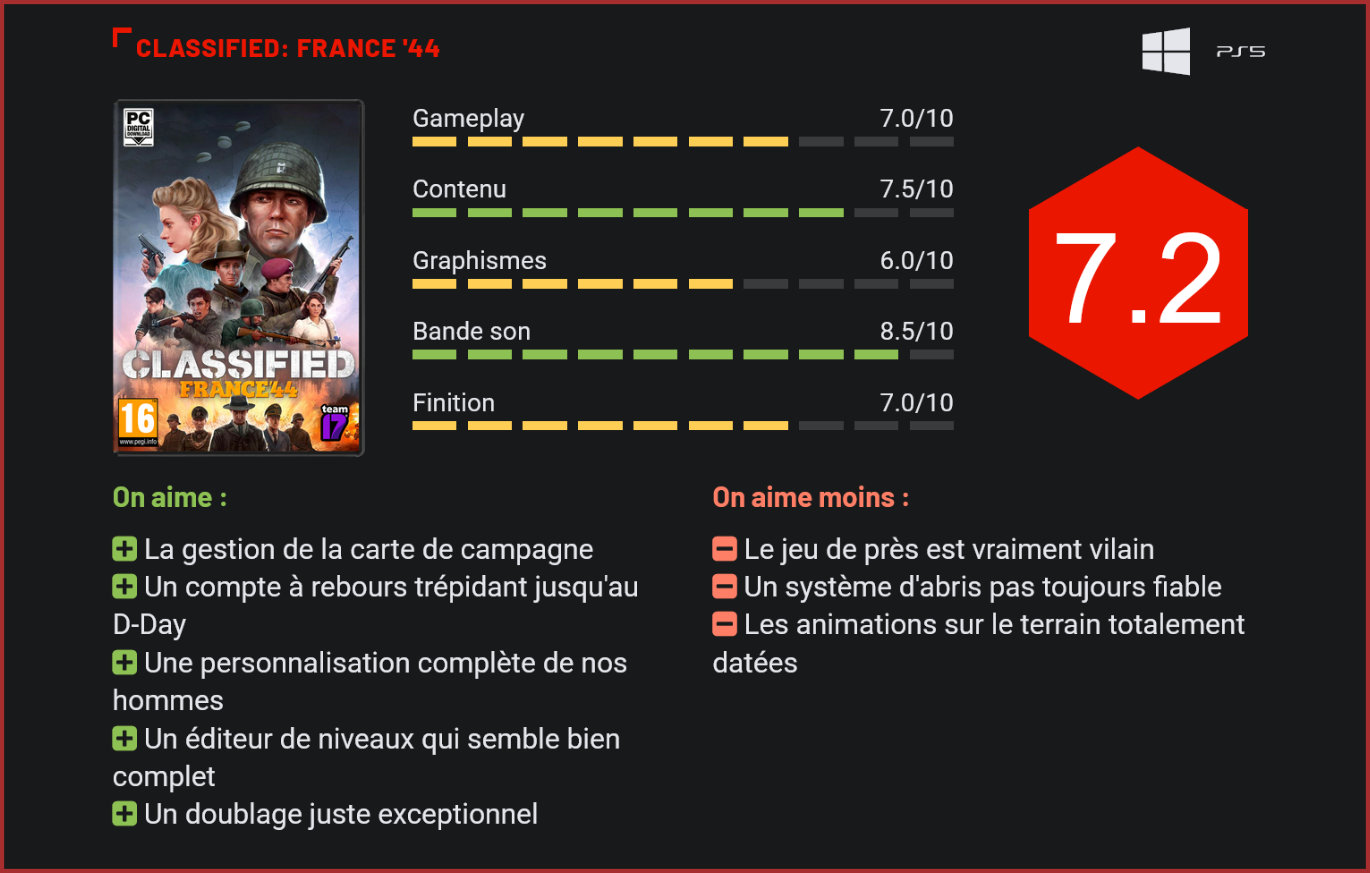Dans l’industrie du jeu vidéo, le Débarquement est généralement l’événement de la Seconde Guerre mondiale le plus mis en lumière. Avec Classified: France ’44, ce sont les 50 jours précédant le D-Day qui sont contés. Rarement, dans le jeu vidéo, nous avons l’occasion de mesurer l’impact de la Résistance française sur le Débarquement de Normandie. Avec Classified: France ’44, les Britanniques de Team17 et Absolutely Games ont souhaité rendre hommage à ces hommes et femmes qui, quatre années durant, ont combattu dans l’ombre pour permettre aux forces alliées de réussir leur arrivée sur le sol européen. Classified: France ’44 nous permet donc de découvrir ce pan bien souvent méconnu de l’histoire. Du 17 mai jusqu’au 6 juin, date du D-Day, le jeu nous met dans la peau de résistants qui ont réalisé du sabotage, ont tué des officiers ou ont retardé l’avancée d’un peloton complet de soldats nazis. Sur le terrain, dans des manches au tour par tour, vous avez ainsi l’occasion de tuer du boche pour permettre la Libération prochaine. Le jeu s’articule autour de deux axes principaux dans sa campagne, à savoir la carte de la moitié nord du territoire français, allant du Pas-de-Calais au Centre en passant par la Bretagne ou les Pays de la Loire, et les niveaux sur terrain. La carte de campagne, représentant la moitié nord de la France, est ultra riche. La carte de campagne est assez complète. Différents objectifs nous sont donnés sur la gauche de l’écran, nous demandant ainsi de remplir l’une ou l’autre tâche (que l’on abordera un peu plus loin), d’exécuter une mission ou de libérer un territoire. Parce qu’en effet, les Allemands contrôlent la majorité du nord de la France et, aux côtés des gaullistes, des radicaux et des criminels, vous devrez augmenter votre influence sur les différents territoires en accomplissant les diverses missions proposées. Chaque région française “appartient” à une faction et est divisée en trois zones. Plus vous reconquerrez une région au profit d’une faction, plus vous augmenterez votre influence auprès de celle-ci pour l’une ou l’autre transaction (achat d’armes, de cosmétiques…). Un compte à rebours de 50 jours vient également vous mettre la pression pour accélérer la reconquête du territoire et, pour vous empêcher de prendre trop vite l’ascendant sur l’ennemi, les forces spéciales allemandes feront le tour des zones qui leur ont été reprises et promettent des représailles tous les trois tours. Vous l’aurez compris, vous ne vous ennuierez jamais avec cet aspect du jeu, ni même avec aucun autre. Au-delà de cette gestion de la France, vous devrez gérer correctement votre escouade de résistants et commandos. Garder leur moral au beau fixe sera primordial pour que vos hommes soient performants sur le champ de bataille. Pour cela, les tâches permettent de les soigner ou d’améliorer leurs compétences, mais les empêchent durant plusieurs tours d’aller se battre pour vous sur le terrain. Par moment, vous aurez le choix d’écouter ou non une conversation très instructive entre vos hommes pour en apprendre sur leur quotidien et améliorer leur moral. Enfin, tous vos soldats sont intégralement personnalisables, que ce soit au niveau de leur équipement militaire que de leur tenue. Au fil des missions qu’ils accompliront (avec plus ou moins de succès), ils engrangeront également de l’expérience leur permettant de débloquer des compétences actives ou passives améliorant par la même occasion leurs performances sur le terrain. Le titre se joue au tour par tour dans des niveaux de taille modeste, mais suffisante. C’est toutefois sur le terrain que les fans de stratégie au tour par tour trouveront leur compte. Identique en tous points à un XCOM, un Gears Tactics ou un Marvel Midnight Suns, cet aspect du titre est, ici aussi, assez bien réalisé et complet. Sur la carte de campagne, vous aurez généralement le choix entre deux voire trois missions. Choisir c’est renoncer, les autres missions qui vous étaient proposées disparaissent alors et vous devez choisir de composer votre escouade de quatre hommes en fonction de ce qui vous attend. Vous avez généralement quelques indices à ce propos, c’est donc à vous de faire les choix qui s’imposent pour mener à bien l’objectif. Sur le terrain, c’est du déjà-vu si vous aviez déjà fait l’un des trois jeux sus-cités. Chacun à son tour, le joueur et l’ordinateur déplacent leurs unités sur le terrain pour prendre l’ascendant sur l’autre. Il faut alors profiter des différents abris, des tirs réflexes et des points d’action pour éliminer les escouades de soldats allemands. Vous disposez d’un certain nombre de points d’action (PA) à dépenser lors de votre tour pour tirer ou encore recharger et, une fois que vous les avez épuisés, devez attendre le tour suivant pour en refaire le plein. Rien de vraiment révolutionnaire à ce niveau, c’est du déjà-vu, et les développeurs ont bien raison de ne pas réinventer l’eau chaude en prenant une formule qui marche et qui a fait ses preuves. Là où le titre se démarque, c’est dans la gestion de la furtivité, puisque l’on peut en effet accomplir une mission en ne se faisant jamais remarquer jusqu’à ce que l’on tende l’embuscade à l’ennemi. Tuez autant de soldats adverses vous octroiera un bonus, restaurant la totalité des PA de vos hommes et donnant un avantage moral certain sur l’ennemi. Le concept est plutôt sympa et est bien fichu. Bon, visuellement, le jeu est sympa sans être waouh. En revanche, contrairement à ses illustres modèles précédemment cités, Classified pâtit d’une gestion des abris pas toujours exemplaire. Alors que l’on pense avoir un ennemi en ligne de mire parfaite pour l’éliminer, on se retrouve avec un pourcentage de précision proche du néant. Lorsque l’