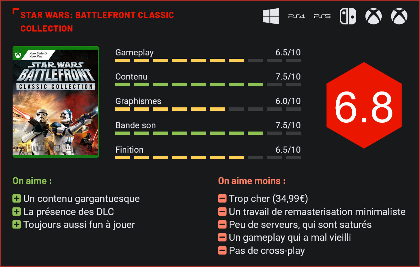 Après Star Wars Episode 1 : Racer et Republic Commando, c’est au tour d’un autre classique Star Wars d’avoir droit à un remaster, ou plutôt deux classiques… Calqué sur le modèle Battlefield, Star Wars: Battlefront avait en son temps remporté un énorme succès. A un tel point que le studio Pandemic livrera quelques années plus tard un second volet. Si EA a poursuivi l’aventure en nous livrant un reboot sur Xbox One et PS4, les fans de la franchise considèrent les deux premiers volets de la série comme des titres beaucoup plus marquants que les deux revivals plus récents. C’est sans doute ce qui a poussé le studio Aspyr à nous livrer des remasters de ces deux volets. Graphiquement, ça a forcément beaucoup vieilli… Pour ceux qui ne connaitraient pas la série, Battlefront est avant tout un jeu multijoueur, même s’il est tout à fait possible d’y jouer en solo que ce soit à travers son mode scénarisé (qui se boucle en moins de 2h) dans lequel on enchaine les batailles, qui sont entrecoupées de séquences des films, ou son mode conquête galactique, qui ajoute une touche de stratégie en vous poussant à conquérir une carte. Le jeu est jouable à deux en local en écran splitté, ou en ligne, jusqu’à 64 joueurs. Assez étonnamment le mode quatre joueurs en local a disparu. Contre des bots, le jeu reste fun, mais ne vous attendez à aucune créativité de leur part. C’est bien en ligne qu’il montre tout son potentiel avec des batailles épiques, des assauts de masse, des stratégies complexes, des actes héroïques… L’objectif ici est simple : deux factions s’affrontent sur une carte. Leur but est d’épuiser le stock de renforts de l’ennemi. Pour ce faire, il faudra éliminer un max d’ennemis en perdant un minimum d’hommes et surtout s’emparer de points clés sur la carte. Plus vous en contrôlerez, plus vous ferez baisser les renforts de l’adversaire. On peut contrôler différents véhicules sur le champ de bataille. Les niveaux sont bien sûr inspirés des grandes batailles des 6 premiers films. En plus des niveaux présents dans les deux jeux de base, on a droit à quelques cartes additionnelles, proposées sous la forme de DLC à l’époque. Jabba’s Palace pour le premier volet, Bespin: Cloud City, Rhen Var: Harbor, Rhen Var: Citadel, et Yavin 4: Arena pour le second. Le contenu est donc assez généreux. Battlefront vaut surtout le détour pour ses batailles épiques, sa fidélité à l’univers de Star Wars, ses vaisseaux et véhicules qui ajoutent de la profondeur aux combats et ses diverses classes de fantassins. L’ennui, c’est qu’en solo, le titre est toujours aussi peu intéressant qu’à l’époque, l’IA n’a pas eu droit au moindre upgrade. Le multijoueurs est quant à lui victime d’un manque d’ambition d’Aspyr : les serveurs sont peu nombreux et pleins, le jeu n’est pas cross-platform, le système de visée déjà très douteux à l’époque n’a eu droit à aucune amélioration et on retrouve quelques bugs ça et là. Ce n’est pas la catastrophe, mais clairement ces deux classiques auraient mérité mieux. Surtout que sur le plan technique si quelques textures ont été retravaillées, globalement l’évolution est très timide par rapport aux deux épisodes originaux. Sachant que cette compilation est vendue 34,99€ il y a donc de quoi être déçu… Il est toujours possible d’incarner des héros de la saga. Faut-il dès lors craquer ? Clairement vous serez déçu, mais si vous êtes un fan absolu, vous y trouverez néanmoins votre bonheur. Le jeu risque de surcroit de s’améliorer si Aspyr prend la peine de proposer quelques updates. Alors globalement on aurait plutôt tendance à dire oui malgré les très nombreux défauts de la version actuelle. En revanche, ça vaut sans doute la peine d’attendre une baisse de prix… Conclusion Aspyr nous livre un remaster très pauvre des deux premiers Star Wars: Battelfront. Si les deux FPS restent des classiques incontournables pour les fans de l’univers de George Lucas, le travail de remasterisation est très léger tant au niveau du contenu que de la technique. Oui c’est un véritable plaisir d’y rejouer : les batailles sont épiques, le contenu généreux et le titre fun, mais il conserve tous ses défauts de l’époque et surtout n’est pas à la hauteur des attentes à son lancement avec des serveurs trop peu nombreux et saturés, pas de cross-play, des bugs… A 34,99€, l’addition est donc salée pour cette compilation minimaliste, qui aurait sans doute mérité un meilleur traitement.