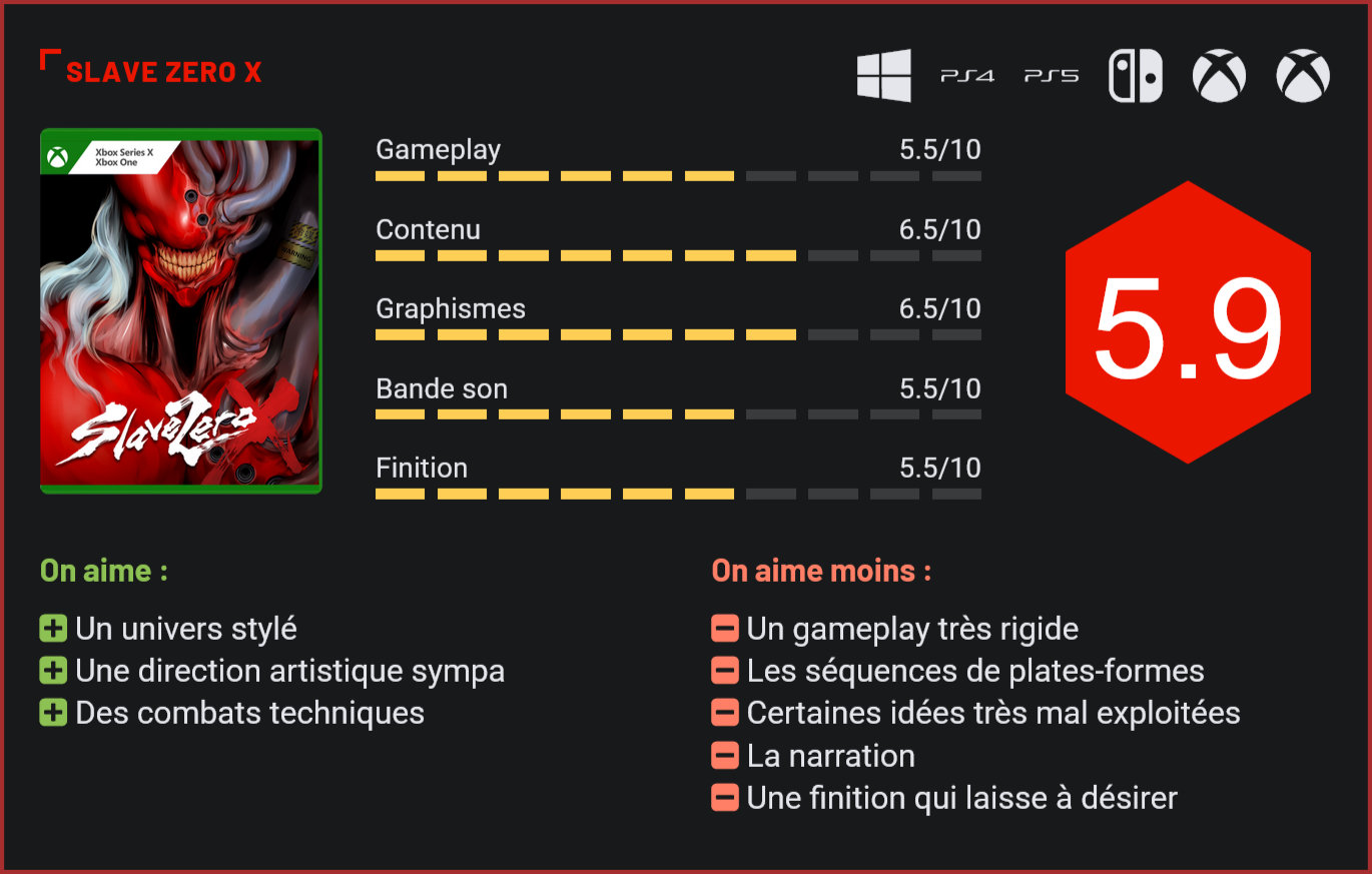 Sorti sur Dreamcast et PC en 1999, Slave Zero n’a pas laissé un souvenir impérissable aux quelques joueurs qui l’ont essayé à l’époque. A la surprise générale, Ziggurat a pourtant décidé de mettre en production une “suite” – ou plutôt une préquelle – 24 ans après sa sortie. Jeu de méchas assez moyen, Slave Zero n’a pas franchement marqué les esprits sur PC et Dreamcast. Cela n’a toutefois pas empêché Ziggurat de récupérer les droits de la licence pour nous livrer 24 ans après sa sortie une préquelle que personne ne semblait désirer… Il faut dire que le studio a fait des revivals de séries méconnues sa grande spécialité. On lui doit notamment l’excellent réédition de BloodRayne Betrayal. Slave Zero X suit toutefois une route très différente puisqu’il s’agit non pas d’un portage mais d’une nouvelle production et plus particulièrement d’une préquelle. Le jeu a volontairement une esthétique très rétro. On change radicalement de style niveau gameplay aussi, puisqu’on est ici face à un beat them up en 2D et non plus un jeu de méchas en 3D… Un choix audacieux de la part du studio, qui n’est finalement qu’une façon différente d’explorer l’univers et le lore de Slave Zero. Car il faut l’avouer, l’univers un peu cyberpunk du jeu a son charme. Dommage que le scénario de cette préquelle ne l’explore que si maladroitement avec des dialogues assez plats et une mise en scène minimaliste… Mais que vaut exactement ce beat them up ? Il faut bien l’avouer, le jeu souffle le chaud et le froid, avec d’excellentes idées qui sont parfois très mal intégrées au titre. Globalement, les combats sont nerveux et plutôt techniques. Il ne sera pas rare de devoir recommencer plusieurs fois une portion de niveau en raison d’une difficulté élevée. L’ennui, c’est que si notre personnage se déplace facilement de droite à gauche et de gauche à droite à l’écran, en enchainant les combos, le système pour parer les coups des adversaires exige un timing parfait et n’est vraiment pas très accessible… Le plus souvent vous parerez un coup par erreur en matraquant les boutons d’attaque… La difficulté a également tendance à varier de façon maladroite. Un segment vous semblera parfois extrêmement compliqué, puis se transformera en une véritable promenade de santé. C’est lié au fait qu’on se retrouve parfois bloqué dans un coin par des ennemis ou pris entre deux feux… Le lieu où vous vous positionnerez aura toute son importance dans ce jeu. La mort est partout. Slave Zero X se distingue des autres beat them up par son univers cyberpunk, son niveau élevé de violence et de gore et son système d’amélioration du personnage. S’il a une touche véritablement unique, il faut bien avouer que son gameplay très rétro et souvent très maladroit en font un jeu moyennement intéressant à jouer. On finit souvent par pester contre notre malchance dans les combats, ou le système de saut extrêmement rigide qui rend la moindre séquence de plates-formes très difficile à digérer. Il ne sera pas rare de devoir enchainer quelques séquences de plates-formes pour progresser dans l’aventure, et tout cela est le plus souvent très pénible. Comme on l’a dit plus haut, Slave Zero X avait un véritable potentiel. Pad en main toutefois, on voit vite ses erreurs. Avec sa difficulté mal dosée, ses séquences de plates-formes éprouvantes et son gameplay qui manque de précision, le jeu de Ziggurat peine à marquer les esprits et c’est bien dommage tant le titre avait de quoi se distinguer des autres productions du genre. Les séquences de plates-formes sont un véritable calvaire. Sur le plan esthétique, le jeu fait d’ailleurs son petit effet avec ses décors en 3D et ses personnages en 2D, délicieusement rétro. Conclusion Préquelle inattendue d’un jeu qui n’avait pas franchement marqué les esprits en son temps, Slave Zero X est pourtant un beat them up très honnête, qui a le mérite de proposer un univers radicalement différent de ce qu’on a l’habitude de voir dans ce type de production. Plutôt joli et stylé, le titre souffre toutefois d’une prise en main très rigide, de séquences de plates-formes mal maitrisées et d’une difficulté mal dosée. Les combats sont nerveux et intenses, mais le jeu ne parvient jamais à montrer son véritable potentiel et c’est bien dommage tant il en avait justement, du potentiel.