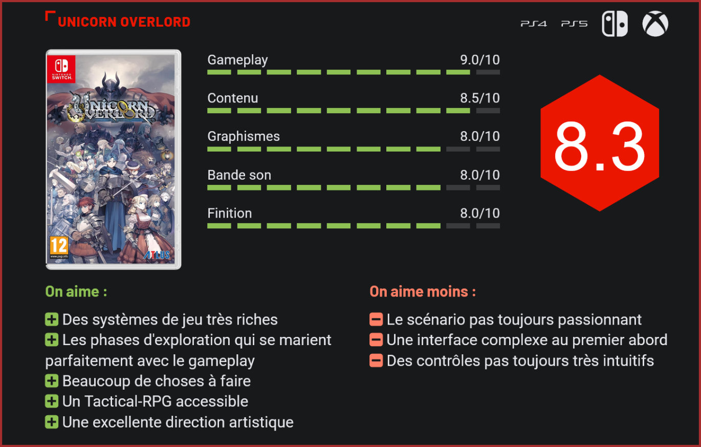 Disponible depuis quelques jours, Unicorn Overlord est la nouvelle production du studio japonais Vanillaware. Les précédents jeux du studio étant de grande qualité, il n’est pas très surprenant de constater que c’est également le cas de ce nouveau titre qui est un Tactical-RPG très réussi. Si les jeux du studio ne sont pas de grands succès commerciaux, Vanillaware bénéficie tout de même d’une très bonne renommée auprès du public et de la presse grâce à la qualité de leurs productions précédentes. Très lié à Atlus depuis sa conception, Vanillaware et son partenaire de toujours proposent Unicorn Overlord depuis quelques jours. Ce nouveau Tactical-RPG disponible sur les consoles Nintendo, Playstation, et sur Xbox Series s’inspire de nombreux jeux du même genre paru durant les années 90. Véritable hommage, Unicorn Overlord n’en reste pas moins une expérience très moderne qui fait honneur au genre auquel il appartient. Dans Unicorn Overlord, nous incarnons Alain, un prince forcé de fuir ses terres durant son enfance. Dix ans avant les événements du jeu, le royaume de Cornia est envahi par le général Valmore qui s’auto-proclame héritier de l’empire perdu de Zénoïra. Ce nouvel empire en a ensuite profité pour étendre son influence à travers le monde. Désormais âgé de 17 ans, Alain s’embarque dans une aventure pour libérer plusieurs royaumes du joug de l’empire. Sa quête de liberté l’amène évidemment à croiser de très nombreux personnages qui rejoignent son armée grandissante au fil du jeu. Le scénario de ce Unicorn Overlord n’est pas le plus profond ni le plus intéressant créé par le studio, mais les différents personnages et leurs interactions apportent un peu de corps à l’ensemble. Le jeu propose de très nombreuses batailles. Ce nouveau titre se divise en deux types de phases de jeu. Il y a tout d’abord les batailles tactiques en temps réel qui nous demandent de gérer le déplacement et les actions de plusieurs unités, de progresser sur la carte et de prendre les bases ennemies. Les combats se déroulent automatiquement lorsque deux unités se rencontrent. Si le principe est plutôt simple, la complexité est amenée par les situations variées dans lesquelles nous placent les différentes batailles du titre. Nos unités sont formées d’un ou plusieurs personnages (jusqu’à six, trois placés sur une ligne de front et trois en arrière) et chaque personnage possède une classe qui propose différentes utilités, affinités et faiblesse en face d’autres classes. Le titre propose également des points de “bravoure” gagnés en réalisant différentes actions durant une bataille. Ces derniers peuvent être dépensés pour appeler d’autres unités, mais aussi pour déclencher des capacités spéciales de nos personnages. En dehors des batailles, nous prenons le contrôle de Alain pour explorer les différents royaumes. Ces derniers sont représentés de la même manière que les batailles, mais ces moments nous permettent de nous déplacer librement sur une carte ouverte en nous laissant le choix d’explorer ou non les différents points d’intérêts. Nous y trouvons des villes, des forts, tout un tas d’activités annexes ainsi que l’accès à de nombreuses batailles qui nous permettent de recruter de nouveaux personnages. Beaucoup d’entre elles sont tout à fait optionnelles et le titre nous laisse libres de progresser dans le scénario avant d’avoir tout exploré, à nos risques et périls. L’exploration et la gestion de nos unités se révèle très vite addictive grâce à un bon sentiment de progression. Comme d’habitude avec Vanillaware, les visuels sont très soignés. Ces deux types de phases de jeu se marient parfaitement et amènent une très grande profondeur dans le gameplay. Il est primordial de bien se préparer durant les phases d’exploration avant de partir en mission, et le titre laisse une belle liberté concernant notre manière de jouer. Il est, par exemple, possible d’opter pour des stratégies différentes en disposant nos personnages comme nous l’entendons au sein de nos unités. Chaque personnage possède aussi des capacités propres qui peuvent être programmés dépendant de certaines situations, à la manière du gameplay de Final Fantasy XII. Notre armée possède aussi un niveau de renommée, de même que les personnages qui ont un niveau d’affinité entre eux… Unicorn Overlord est un titre aux systèmes riches. Il se révèle aussi très pratique à jouer en offrant plusieurs options pour ajuster de nombreux paramètres à tout moment ou simplement sauvegarder n’importe quand. Explorer la carte du monde est gratifiant et addictif. S’il y a bien une chose que l’on remarque en jouant au jeu, c’est bien la patte artistique si chère à Vanillaware qui est toujours présente. Le titre propose de très beaux visuels réalisés quasi entièrement en 2D. On retrouve les décors et les personnages détaillés et bien animés durant les moments scénarisés ainsi que les combats entre les unités, un savoir-faire visuel que cultive le studio depuis ses débuts. La représentation des batailles ou de l’exploration de la carte se montre un peu plus minimaliste avec des décors moins fournis, un mal pour un bien puisque cela permet à l’action d’être plus lisible aussi. Le titre n’est pas en reste musicalement non plus puisque la bande-son propose des morceaux très mémorables. Le scénario de Unicorn Overlord est aussi accompagné de doublage en anglais et en japonais, de quoi donner encore plus de vie à l’ensemble. Avec ses quatre niveaux de difficultés, dont un qui permet de se concentrer sur l’histoire, Unicorn Overlord s’ouvre à tous les publics. Le titre souffre un peu de ses contrôles peu conventionnels lors des batailles ainsi que de son interface qui est un peu intimidante au départ, mais l’habitude arrive très vite. L