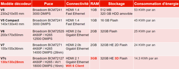La semaine dernière, Proximus annonçait l’arrivée de sa nouvelle TV Box qui viendrait remplacer l’ancienne à partir du 15 mars. Mais quelles sont les différences entre cette nouvelle box et les anciennes ? On sait que Proximus a pris en compte l’aspect environnemental lors du développement de sa nouvelle box, par exemple, en utilisant du plastique recyclé. Avec des dimensions réduites, la V7c (“c” pour compacte) consomme également moins d’énergie que ses prédécesseurs. Mais quels sont les différences avec les anciennes box sur le papier ? Nous avons pu récupérer les fiches techniques des anciennes box auprès de Proximus, ainsi que la consommation en énergie des différents modèles, pour en faire le tableau suivant. On remarque que la taille du nouveau décodeur V7c est très proche de celle du V5c. Les utilisateurs ayant déjà cette box ne verront donc pas une grande différence de volume entre les deux. En ce qui concerne la baisse de consommation d’énergie, le nouveau modèle n’est pas si peu gourmand comparé à la V7 mais la différence devient beaucoup plus importante dès qu’on compare avec la V5 et la V5c. Fin 2023, le parc de décodeurs de l’entreprise se composait de 1,7 million de TV Box. Essentiellement des V7 et V5c pour Proximus, et des V5 et V5c pour Scarlet. L’arrivée progressive de la nouvelle box devrait donc largement moderniser l’ensemble du parc décodeurs et réduire la consommation de nombreux foyers. Si vous êtes intéressés par la nouvelle TV Box de Proximus, vous avez trois façons de procéder en fonction de votre profil. Vous retrouverez toutes le informations nécessaires dans notre article explicatif sur le sujet.