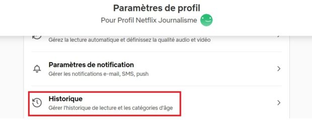 Les recommandations de votre compte Netflix sont, par définition, contrôlées par une chose en particulier : ce que vous avez vu avant. Alors, pour éviter que ce film qui vous a déçu n’influence les suggestions de la plateforme, il va falloir le supprimer de votre historique ! Pour accéder à votre historique Netflix, rendez-vous sur la plateforme depuis votre ordinateur, et passez votre souris sur l’icône représentant votre profil, en haut à droite de l’écran. Cliquez sur « compte » dans le menu qui apparait en dessous de votre souris. Une fois sur la nouvelle page, cliquez sur « profils » en bas de la liste d’option sur la gauche. Puis, dans « paramètres de profil », cliquez sur votre profil. Dans la nouvelle page, cliquez ensuite sur « Historique ». Vous y voilà : vous n’avez qu’à supprimer les titres en cliquant sur l’icône à droite de signaler un problème, celle représentant une sorte de petit panneau de signalisation d’interdiction en forme de cercle barré en diagonale. Notez toutefois qu’il faudra 24 heures pour que le titre soit supprimé de votre historique. Ceci afin de s’assurer que vous ne changiez pas d’avis !