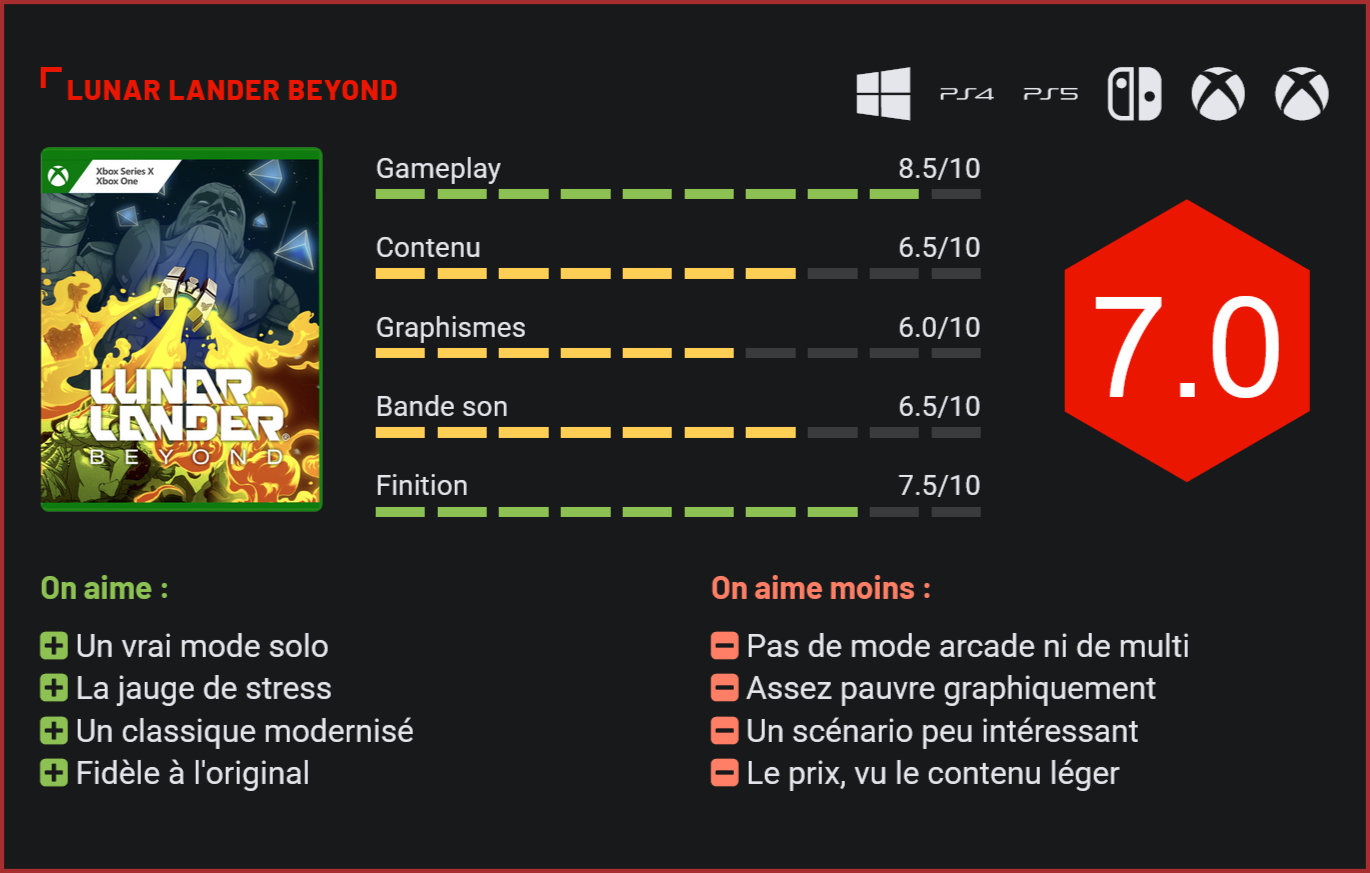 Après avoir exploré son catalogue historique de jeux avec sa série Recharged, Atari propose avec Lunar Lander Beyond un projet beaucoup plus ambitieux de revival de l’une de ses plus vieilles franchises… Si les nombreux remakes minimalistes de ses classiques nous avaient moyennement convaincus, souvent faute de moyens, Atari tente avec Lunar Lander Beyond un sacré coup de poker. Facturé 29,99€, ce nouvel épisode de la série n’est pas un remake mais un revival complet, qui repart d’une feuille blanche et propose un véritable mode solo. Pour ceux qui ne connaîtraient pas Lunar Lander, il s’agit d’une série historique d’Atari. Le titre est sorti en 1979. Dans ce jeu, il fallait diriger une navette en apesanteur et parvenir à la poser au sol sans égratignures. Le jeu tirait sa complexité de sa physique et de la précision de ses commandes. Le jeu parvient à alterner les challenges dans son aventure solo. Lunar Lander Beyond reprend le concept de l’original tout en le remettant à sa sauce. Concrètement, il s’agira toujours de déplacer une navette en apesanteur, mais divers éléments viennent complexifier le gameplay avec un système de stabilisation, toujours le même système de propulseurs, mais également des boosts qui permettront d’accélérer sa vitesse, etc etc. Le jeu gagné en complexité car en plus de la direction, il est possible d’ajouter jusqu’à quatre boutons raccourcis pour les différentes commandes. Vous pourrez notamment utiliser un système qui attirera vers votre vaisseau crédits et bonus à récupérer dans chaque niveau, ce qui vous permettra de ne plus devoir passer au millimètre près sur ces crédits et objets pour les récupérer. Le mode solo est également divisé en de multiples niveaux qui proposent tous des défis différents. Dans certains, ce sont vos capacités de pilote qui seront mises à rude épreuve en vous demandant de parcourir un tracé prédéfini le plus vite possible, dans d’autres, il faudra sauver des vies en récupérant des survivants et en les amenant à bon port. Le jeu offre pas mal de diversité dans ses niveaux et parvient à garder ainsi notre intérêt. Mieux, Atari ajoute un petit côté rogue lite en permettant d’upgrader son vaisseau et de sélectionner un pilote différent. Une jauge de ‘stress’ fait également son apparition, laquelle se remplira à chaque choc et rendra la situation plus complexe avec l’apparition d’hallucinations. De retour au bercail, il faudra les envoyer chez le psychologue avant qu’ils soient à nouveau opérationnels, et donc jongler avec les pilotes. La difficulté est souvent au rendez-vous, avec quantité de passages étroits. Comme dans l’original, il faut être précis dans ses déplacements, et utiliser judicieusement la physique et ses propulseurs pour se déplacer dans les niveaux en 2D. Fidèle au classique, ce revival parvient donc à en conserver l’ADN tout en modernisant la formule. Là où on éprouvé des regrets c’est au niveau de la présentation. Techniquement, le jeu reste très simple, avec une direction artistique qui manque de personnalité, des cut scènes extrêmement cheap, des dialogues creux et une intrigue peu intéressante… Côté modes de jeu aussi, on est un peu déçu. Certes le mode solo est très réussi, mais l’absence de mode ‘arcade’ classique surprend. Le titre ne propose également aucun mode multijoueur, alors qu’il s’y prêtait assez bien… Conclusion Lunar Lander Beyond s’impose comme un très bon revival d’une série culte d’Atari. Tout en restant fidèle à l’ADN de la franchise, ce reboot ose l’innovation avec un tas de nouveautés qui viennent enrichir le gameplay, dont un système d’upgrader, des capacités uniques, différents pilotes et une jauge de stress. Le mode solo du jeu est une vraie réussite. Côté contenu en revanche on est assez déçu par l’absence de mode arcade ou de multijoueur. L’addition est assez salée à 29,99€, d’autant plus que techniquement le titre peine à impressionner. Que les fans de l’original se rassurent toutefois : ce nouvel épisode est globalement une belle réussite, qui mérite le coup d’œil si vous aviez passé quelques heures sur l’original…