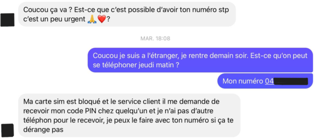 Certains arnaqueurs se font passer pour un opérateur téléphonique ou piratent le compte Facebook de l’un de vos proches pour prendre le contrôle de votre carte SIM. Une fois la carte SIM dérobée, l’arnaqueur pourra ensuite passer des appels surtaxés ou effectuer des doubles vérifications lors de payement en ligne. Relativement peu connu, le ”SIM swapping” constitue pourtant une arnaque particulièrement dangereuse. Concrètement, au travers de cette pratique, les arnaqueurs ont comme objectif de voler la carte SIM de leur victime. Et si la finalité est toujours la même (voler une carte SIM), les moyens pour y parvenir peuvent varier. C’est ce que nous allons voir dans cet article au travers d’une tentative de ”SIM swapping” dont a été récemment la cible une Belge. Dans la majorité des cas, l’arnaqueur se fait passer pour un opérateur téléphonique. La victime reçoit un SMS d’un soi-disant opérateur (l’arnaqueur) lui annonçant que sa nouvelle carte SIM est bien arrivée. Le SMS est accompagné d’un lien qui permettrait d’annuler la réception de cette carte SIM non désirée. Ne comprenant pas la situation, la potentielle victime va alors chercher à annuler la réception de cette carte SIM non désirée en cliquant sur le lien d’annulation. Nous sommes donc clairement ici face à la pratique frauduleuse du SMS phishing. Et c’est là que le piège se referme. En voulant annuler la réception de cette carte SIM, la potentielle victime va être redirigée vers un site qui copie en tous points un opérateur téléphonique connu. La fausse page va ensuite inviter la victime à fournir ses identifiants et son mot de passe. Et bien entendu, le faux site va enregistrer ces informations. À noter qu’il n’est pas ici question de fournir des données bancaires, le faux site demande uniquement d’indiquer les identifiants et le mot de passe. Enfin, dernière étape de l’arnaque, l’arnaqueur va se faire passer pour sa victime auprès d’un véritable opérateur téléphonique et demander une nouvelle carte SIM grâce aux identifiants et au mot de passe récoltés. Quelques jours plus tard, la victime verra sa carte SIM bloquée, et l’arnaqueur bénéficiera d’une nouvelle carte SIM qu’il pourra utiliser à sa guise. Ce dernier pourra donc effectuer des appels surtaxés ou effectuer des doubles vérifications lors de payement en ligne (numéro de sécurité envoyé par SMS), et c’est sa victime qui payera tous les frais! Mais cette pratique peut se révéler encore plus pernicieuse étant donné que l’arnaqueur peut se faire passer pour l’un de vos proches (et non pas pour un opérateur téléphonique). Dans un premier temps, l’arnaqueur pirate le compte Facebook de l’un de vos proches. Dans un second temps, il vous contacte, sous couvert de l’identité Facebook d’une connaissance, en vous expliquant qu’il a un grave problème et qu’il a absolument besoin d’une nouvelle carte SIM. Petit problème : sa carte SIM est bloquée, et il a donc besoin de votre téléphone pour résoudre le problème. L’arnaque rejoint ici le mécanisme que nous avons développé précédemment. La victime, qui veut tout simplement aider son ami, va alors recevoir un SMS l’invitant à confirmer la réception d’une nouvelle carte SIM. Et en voulant rendre service, la victime fournira ses identifiants et son mot de passe sur un faux site recopiant un opérateur. L’arnaqueur pourra donc commander une carte SIM au nom du bon samaritain et passer des appels surtaxés ou effectuer des doubles vérifications lors de payement en ligne. Mais comment éviter ce type d’arnaque ? Tout d’abord, il est préférable de ne jamais cliquer sur un lien présent dans un SMS. Si un message vous annonce une quelconque modification de votre carte SIM, rendez-vous directement sur le site web de votre opérateur ou passez un appel à l’un de leurs bureaux. Si vous recevez un message d’un proche qui vous demande un service concernant une carte SIM, appelez-le directement, et ne cédez jamais aux coups de pression. Prenez le temps nécessaire pour éclaircir une situation, peu importe les invectives. Concernant le message reçu, accordez de l’attention à la syntaxe et à l’orthographe. À titre d’exemple, dans la capture d’écran présente ci-dessus, les fautes sont innombrables (c’est par ailleurs ce qui a permis à la potentielle victime de ne pas tomber dans le piège, son amie étant capable d’écrire sans faute). Demandez-vous également si la personne qui vous contacte ferait appel à votre aide en cas de problème. En théorie, une simple connaissance ne devrait pas vous demander de résoudre un problème. Cette arnaque n’est pas à prendre à la légère étant donné que certaines des victimes ont perdu plusieurs milliers d’euros. La prudence est donc hautement de mise concernant les soi-disant problèmes de carte SIM.