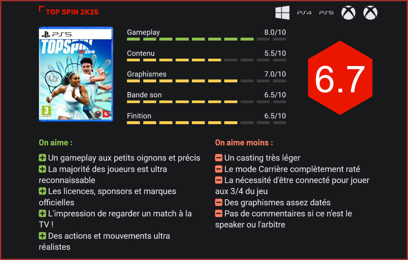 13 ans après le dernier épisode, Top Spin fait son grand retour avec un rythme de sortie qui semble annuel, à l’instar de WWE2K et de NBA2K. Que vaut ce Top Spin 2K25 ? Cela faisait plus d’une décennie que les amateurs de tennis n’avaient plus eu de jeu potable à se mettre sous la dent. Malgré quelques propositions intéressantes, comme AO Tennis ou Tennis World Tour 2, aucun n’est parvenu à se hisser au niveau de la cultissime licence Top Spin. Créée par 2K Games en 2003, la franchise s’est rapidement imposée comme une référence en la matière, avec un gameplay très exigeant et un nombre impressionnant de licences officielles. Qu’à cela ne tienne, 2K Games s’est enfin résolu à remettre sur le devant de la scène l’une de ses licences phares enterrées. Avec Top Spin 2K25, ce n’est pas simplement un jeu qui sort. C’est une marque, une nostalgie, un sentiment inexplicable qui renaît, que seuls les fans de la balle jaune peuvent ressentir. Les attentes sont ainsi immenses sur cette sortie, encore faut-il que les promesses soient tenues. Contrairement à bon nombre de ses concurrents, Top Spin veut proposer des parties les plus réalistes possibles, tout en permettant aux joueurs de s’amuser. C’était le cas dans les précédents épisodes, et c’est à nouveau le cas ici avec ce nouvel opus. Dès le début, on ressent l’envie des développeurs de proposer aux puristes une expérience qui soit la plus fidèle possible à ce que l’on voit à la télévision, tout en permettant aux néophytes de découvrir un titre accessible mais exigeant. Le gameplay est très simple mais extrêmement précis. Quatre touches permettent de faire des coups différents, et une jauge de timing permet d’apporter puissance et précision au tir. Niveau contenu, on sent que Hangar 13 et 2K ont voulu proposer un titre qui soit le plus complet possible. Excepté la quantité de joueurs disponibles (nous y reviendrons plus loin), on retrouve un très grand nombre de sponsors et équipementiers, allant de BOSS à Perrier en passant par BNP Paribas ou Lacoste. Au niveau des licences, également, on sent qu’il y a eu du travail réalisé en amont. Si l’on retrouve bien évidemment les quatre tournois du Grand Chelem, sont également proposés le Madrid Open, le Miami Open, l’Internazionali BNL d’Italia ou encore le Rolex Monte-Carlo Masters. Des tournois de l’ATP Masters 1000 et d’autres moins connus mais tout autant intéressants à découvrir et très fidèlement reproduits comme à la tv. En revanche, l’un des plus gros problèmes de cet épisode, et non des moindres, est l’absence de grands noms de la raquette et de sa balle jaune. Rafael Nadal, Novak Djokovic, Stan Wawrinka, Juan Martin Del Potro, Simona Halep ou encore Venus Williams sont autant de très grands noms qui pointent aux abonnés absents. Et leur absence fait terriblement tache, puisqu’un match Federer-Nadal ou Serena-Venus Williams aurait été un must-have dans ce TopSpin. L’offre des légendes aurait également pu être plus généreuse. Si l’on retrouve les Steffi Graff, Andre Agassi et autres John McEnroe, il reste fort désolant de constater l’absence de grand(e)s champion(ne)s comme Kim Clijsters, Justine Henin, Bjorn Borg, Boris Becker. Il n’y a également aucun joueur français actuel ou ancien comme Noah ou Amélie Mauresmo… La plupart des grands joueurs et légendes sont présents, malgré quelques absents de marque. Une offre de joueurs famélique donc, qui se limite à 25 noms, mais qui devrait s’étoffer gratuitement dans les semaines à venir nous annonce 2K. En attendant, les noms déjà présents, même s’ils sont peu nombreux, promettent de très intéressants échanges de balles. Avec un moteur de jeu propre à la franchise, les développeurs de Hangar 13 sont parvenus à nous proposer un titre ultra réaliste avec des détails qui ressemblent comme deux gouttes d’eau à ce que l’on peut voir à la télévision. Si les graphismes sont mitigés avec des joueurs pas toujours reconnaissables (dédicace spéciale à Andy Murray qui a pris cher) et un public totalement raté, c’est en revanche par les animations des joueurs et la réaction du court à leurs mouvements que nous avons été agréablement surpris. Les joueurs réagissent particulièrement bien à la position de la balle par rapport à leur corps et s’adaptent plutôt bien pour effectuer un revers, un smash ou un amorti. De plus, le joueur se met parfois à glisser pour chercher à frapper la balle et, sur de la terre battue, provoque alors un petit nuage de poussière qui ajoute un peu en immersion. Sur un terrain dur, en revanche, on entend le couinement des semelles sur le sol. L’Académie TopSpin, gérée par la légende John McEnroe, vous permet de vous familiariser avec toutes les commandes. Un détail important, puisque si l’on s’attarde sur le public, l’ambiance sonore en match ou les graphismes, ce n’est guère folichon. Le public, d’une part, est totalement daté et ressemble à celui d’un vieux jeu de sport du milieu des années 2000. Très vilain visuellement, il réagit de manière aléatoire aux coups et n’apporte pas beaucoup de relief aux matchs. Il ne faut pas non plus espérer des commentateurs lors des parties. Excepté le speaker qui présente les joueurs au début du match et l’arbitre qui annonce les fautes ou les points, il faudra se contenter des coups de raquette et du cri des joueurs in-game. Niveau immersion, 2K nous avait déjà habitué à mieux dans les WWE 2K et les NBA 2K. Comme dans ces jeux, on aurait par exemple aimé faire une célébration à l’aide des touches de la croix directionnelle après un échange de balles pour haranguer la foule ou jeter sa raquette sur le sol à l’image d’un certain McEnroe. John McEnroe, qui gère de son côté d’une main de maître l’Académie TopSpin. Grâce à une pléthore de “chapitres”, 