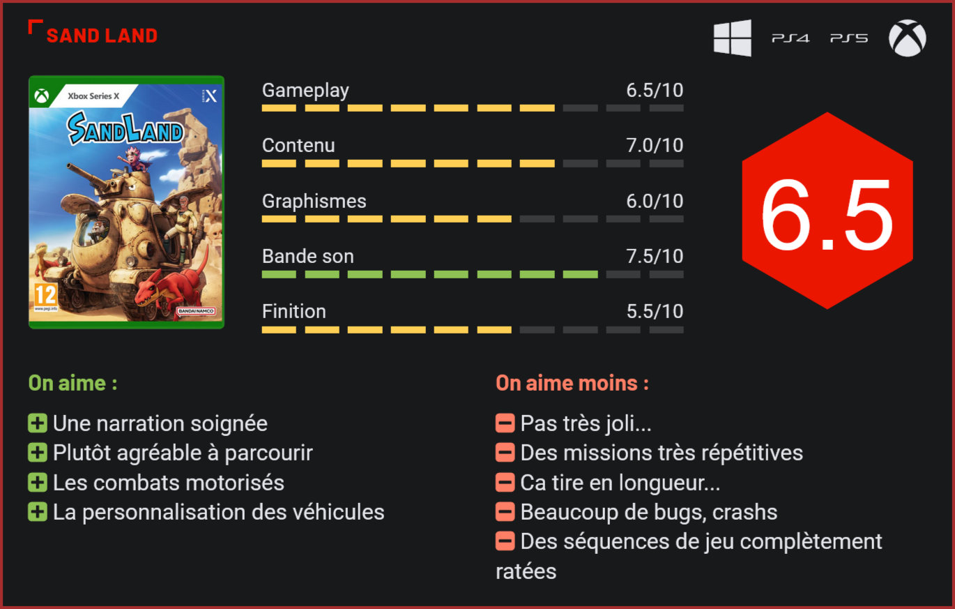 Nouveau jeu du studio ILCA – auteur du tout aussi ambitieux One Piece Odyssey -, Sand Land est l’adaptation de la nouvelle série d’animation du très grand Akira Toriyama. Quand on parle d’Akira Toriyama, on pense bien entendu avant tout à Dragon Ball Z. L’auteur à succès a pourtant débuté sa carrière avec une saga moins connue, Dr. Slump, et a également signé d’autres œuvres. Décédé le 1er mars dernier, l’artiste signe avec Sand Land son ultime travail. Diffusée sur Disney+, la série animée remporte toutefois un succès critique modéré. La narration est plutôt soignée. Mais Sand Land, c’est quoi au juste ? Cette nouvelle série animée prend place dans un univers post-apocalyptique dans lequel la planète est devenue un vaste wasteland, un terme que l’on peut traduire en français par “terres désolées”, où l’eau est devenue la ressource la plus précieuse. La série suit les aventures d’un sheriff qui va s’allier à un groupe de démons, dont le fils du roi des démons, Beelzebub, pour tenter de retrouver une source légendaire d’eau. Un scénario très intéressant sur le papier, qui a toutefois tendance à vite tourner en rond. Mais là n’est pas le principal défaut de Sand Land. Si Toriyama est reconnu comme un character designer de génie, il faut bien admettre que sa dernière création divise. Car d’une part, l’univers post-apocalyptique de Sand Land exerce un réel charme. De l’autre toutefois, les héros que l’on accompagne dans cette histoire soutiennent assez mal la comparaison avec les personnages cultes de Dragon Ball, Dragon Ball Z et même Dragon Ball GT… Le casting principal est même la plus grosse faiblesse de la série. Et malheureusement, le jeu en paye les frais lui aussi. Le jeu propose de multiples séquences différentes, dont de l’infiltration. Comme One Piece Odyssey, Sand Land est un projet très ambitieux pour le petit studio ILCA. Et comme son prédécesseur, le titre rate malheureusement le coche, la faute à un manque de réalisme de la part des développeurs. On le sent, le studio a voulu nous délivrer un jeu triple-A ambitieux, vaste et qui mélange surtout plusieurs styles de jeu très différent. Sand Land se présente ainsi comme un RPG en open world intégrant des séquences de combat à bord de véhicules, des séquences de course, courses-poursuites, combats au corps à corps, plates-formes et infiltration… Rien que ça. Et la moitié de ces séquences sont totalement ratées. Commençons donc par ce qui marche le mieux : la partie combat à bord de divers véhicules. Pour schématiser, l’essentiel du gameplay repose sur des combats de tanks, qui sont très réussis. Le jeu est fun, offre un gameplay assez tactique pour être intéressant, et permet surtout de personnaliser ses véhicules en les équipant de différents modules et en améliorant leurs statistiques. Les combats de tanks sont ainsi nerveux, rapides et intenses, malgré l’IA maladroite et souvent très bugée des ennemis. Il n’est en effet guère difficile de “hacker” le jeu en s’éloignant des ennemis pour les faire respawner plus loin en cas de difficultés, et pouvoir ainsi reprendre des forces. La partie RPG/exploration est également plutôt réussie avec l’évolution du personnage et de sa bande avec des compétences à acquérir, des tas de missions annexes et un vaste open world à explorer. Sand Land souffre toutefois du syndrome Ubisoft, avec des tas de quêtes Fedex relativement peu intéressantes, qui viennent artificiellement gonfler la durée de vie du jeu, et des missions qui ont vite tendance à se répéter. Le titre parvient, malgré sa répétitivité, à tenir le joueur scotché grâce au déblocage progressif de nombreux véhicules qui vont du tank au robot en passant par la moto, le buggy ou l’hovercraft. Les combats à bord du tank sont globalement très réussis. Passons maintenant à ce qui va moins bien… Les combats au corps à corps sont une vraie catastrophe, avec des ennemis bêtes à manger du foin, un système d’esquive ultrabasique et un manque d’options dans les coups. On se contentera la plupart du temps de matraquer un seul bouton (l’attaque rapide, l’attaque puissante étant trop lente) et à esquiver le coup de son adversaire toutes les x secondes. Les autres séquences de jeu “à pied” sont également un désastre : qu’il s’agisse des séquences de plates-formes, atrocement longues et répétitives ou de l’infiltration, face à des ennemis d’une stupidité à nouveau abyssale. Les développeurs ont clairement voulu en faire beaucoup trop et ça se ressent. D’ailleurs, l’open world est très vaste – il comprend même plusieurs cartes. L’ennui, c’est que le level-design est souvent pauvre avec une construction très fade et linéaire de l’aventure. On aurait clairement préféré “moins de contenu” et “plus de qualité.” La personnalisation des véhicules est l’une des forces du jeu. Globalement, on le ressent assez vite d’ailleurs, la finition n’est pas le fort de Sand Land : plusieurs fois nous avons été confrontés à des crashs et des bugs bloquants. Visuellement, le titre n’impressionne pas vraiment non plus sur les consoles new-gen. Les modèles 3D sont très réussis mais les décors sont atrocement vides, répétitifs et manquent cruellement de détails, avec des animations extrêmement lentes à l’horizon. En dépit de ses nombreux défauts, Sand Land reste toutefois l’une des meilleures adaptations récentes d’animé en jeu vidéo. Il faut dire que la barre n’est pas très haute non plus. Le titre reste plaisant à parcourir, et est limite plus intéressant à découvrir en jeu qu’en série animée grâce à sa narration soignée (les cut scenes sont nombreuses et plutôt réussies). Bref, Namco Bandai n’a pas fait du si mauvais travail que ça. Conclusion Présenté comme un RPG en open-worl