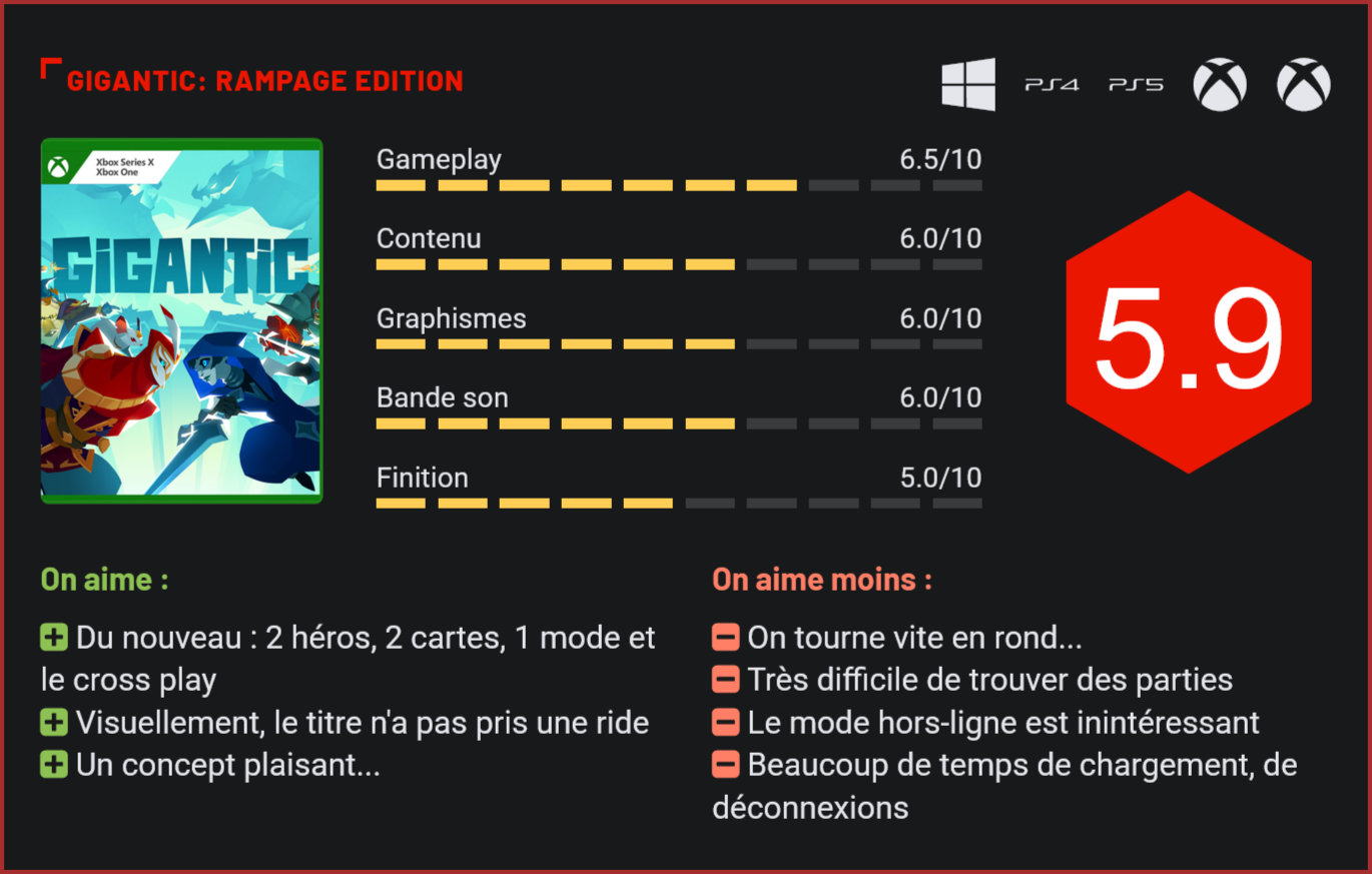 Sorti en 2017 sur PC et consoles, Gigantic avait reçu un accueil plutôt mitigé. Malgré sa gratuité, le titre du studio Motiga avait relativement rapidement dû tirer sa révérence. A la surprise générale, le voici de retour en 2024 dans une version payante. On ne va pas vous mentir, il est plutôt rare de voir un jeu retiré de la vente revenir quelques années plus tard. De surcroit, les quelques rares exceptions ont plutôt suivi le trajet inverse, passant d’une formule payante à une formule free-to-play. Gigantic: Rampage Edition nage donc à contre-courant. Et ce n’est pas peu dire. Déjà au moment de sa sortie, en 2017, le titre de Motiga avait moyennement enthousiasmé le public. Le jeu se démarquait des autres MOBA par son concept sensiblement différent puisque le joueur devait ici marquer des points pour permettre à son gardien d’attaquer la gardien de l’équipe ennemie. Il fonctionnait ainsi sur un système d’offensive, contre-offensive et de contrôle d’objectifs. Le style graphique de Gigantic lui donne une certaine personnalité. Mais concrètement, ça marche comment ? Deux équipes de 5 joueurs s’affrontent sur une carte de taille réduite. Leur objectif est simple : garder le contrôle de zones quelques secondes pour marquer des points, qui, en additionnant, vont permettre de “lâcher” leur gardien, une gigantesque créature, sur le camp adverse. Bien sûr ce n’est pas si facile puisque l’autre équipe lutte pour contrôler les mêmes points stratégiques. Une fois que la créature est lâchée, l’équipe qui a remporté le bras de fer attaque le gardien ennemi et tente de lui enlever le plus de points de vie pendant que l’ennemi tente d’enrayer l’attaque. Et ainsi de suite jusqu’à ce que l’un des deux gardiens soit anéanti. Pour gagner la partie, il faudra contrôler ces points. Le concept est sympathique et met l’accent sur la coopération entre les joueurs. Pour remporter la partie, il faudra être efficaces dans le travail d’équipes. Les différentes classes sont ainsi très complémentaires. L’ennui, c’est que malgré le casting élargi (25 héros dont 2 nouveaux), on tourne vite en rond dans ce jeu, au concept extrêmement répétitif. Passé le cap des 20 parties, on a même franchement l’impression d’en avoir fait le tour. Autre défaut majeur du jeu : sa communauté. Le modèle payant ne lui réussit pas beaucoup car il nous a été très difficile de jouer une partie en ligne… En-dehors de certains créneaux horaires, ça semble même impossible, et ce même si le jeu est cross-play. Certes, il est possible d’y jouer seul contre des bots, mais l’IA est catastrophique et le jeu pas franchement plaisant… Les temps de chargement sont très longs. Et puis, il y a la question de la finition. Les temps de chargement sont nombreux et surtout très longs. Pire, il nous est arrivé deux fois d’être déconnecté. D’un autre côté, le studio a pris soin de livrer une version intégrale avec du contenu inédit (2 héros et 2 cartes), quelques nouveautés dont le cross play, un nouveau mode de jeu “Rush” simplifié et la promesse de quelques nouveautés gratuites dont des skins et un mode de jeu dans quelques semaines. On sent donc une réelle volonté des développeurs de soigner la sortie du jeu. Techniquement, Gigantic n’a également pas trop mal vieilli grâce à son style animé. Le jeu reste “joli” et stylé, avec sa patte graphique. Les mécanismes ont en revanche pas mal vieilli… Pas sûr que le jeune public craquera pour cette formule assez rétro donc et ce modèle économique qui était pourtant une vraie bonne idée. Conclusion Sorti en 2017, Gigantic n’était pas parvenu à rencontrer le succès. Ce MOBA free-to-play nous revient aujourd’hui dans une version “premium” payante. L’idée est bonne, surtout que les développeurs ont ajouté quelques nouveautés dont 2 nouveaux héros, 2 nouvelles cartes, 1 mode de jeu inédit et le cross-play, mais dans la pratique, il est bien difficile d’y jouer tant la communauté est petite… Autrement dit, vous risquez d’acheter ce jeu et de ne jamais y jouer… Le concept du titre a également vieilli, malgré l’introduction d’un mode de jeu “simplifié”. Pas sûr que le public sera réceptif à cette proposition.