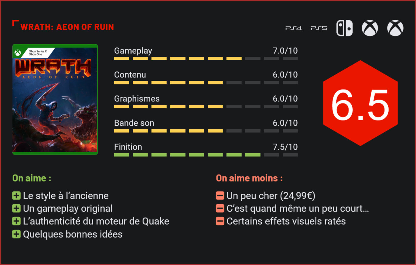 Sorti en février dernier sur PC, le très sympathique Wrath: Aeon of Ruin a déjà droit à son portage sur consoles de salon. Parmi les bonnes surprises de ce début d’année, Wrath: Aeon of Ruin est sans l’ombre d’un doute l’un des FPS rétro les plus réussis de ces derniers mois. Edité par le légendaire 3D Realms, le titre débarque cette semaine sur consoles. Et le portage est une belle réussite. S’inspirant assez ouvertement de Doom et Quake, Wrath se veut un FPS résolument rétro, tant dans sa construction que son gameplay ou sa réalisation. Il se distingue toutefois de ses modèles par la construction de son univers qui s’apparente à une sorte de mini open-world qui permet d’accéder à différents niveaux qui ressemblent bien entendu à des labyrinthes et reprennent les canons du genre : des secrets à découvrir, des tas d’objets à collecter, des portes bloquées, des clés qui permettent de les ouvrir. Certains effets visuels sont franchement ratés. Il ne s’agit pas de la seule originalité du titre, qui lorgne davantage du côté d’Hexen au niveau de son univers, médiéval-fantastique, et joue aussi davantage la carte des combats au corps à corps avec une arme blanche en plus des traditionnelles armes à feu. Comme on l’a dit plus haut, le gameplay tourne autour des hubs. À partir de ceux-ci, vous êtes lancé dans des niveaux de difficulté croissante, suivant une approche similaire aux jeux classiques où la sauvegarde n’est pas toujours à portée de main ! Vous devez obtenir un artefact que vous pourrez utiliser pour sauvegarder à tout moment, avec le petit défi supplémentaire de ne pouvoir récupérer que la santé que vous aviez au moment de la sauvegarde. Sinon, bien sûr, vous pouvez toujours retourner au hub… Les combats sont assez intenses. Le gameplay de Wrath : Aeon of Ruin est à la fois accessible et impitoyable. Bien que les munitions soient abondantes, il faut une grande habileté pour avancer loin dans le jeu. Vous aurez besoin de maîtrise et d’une mentalité de “essayer et échouer” pour apprendre rapidement la disposition des niveaux et vous préparer à affronter les ennemis. Dans la lignée des jeux classiques, la difficulté est élevée, mais Wrath : Aeon of Ruin trouve un équilibre qui le rend toujours surmontable. Ce FPS ne se contente pas de suivre la formule habituelle ; il intègre quelques éléments légers de RPG. Vous pouvez améliorer votre personnage en collectant des artefacts tout au long de l’aventure, et un journal de bord est disponible pour vous guider. Les jeux rétro utilisent souvent des bonus flottants, un vestige des premiers jeux en 2D. Bien que cela crée une atmosphère nostalgique, cela peut briser l’immersion. Wrath : Aeon of Ruin adopte une approche plus modérée : seuls les points de sauvegarde et les armes sont visibles en suspension, mais ces éléments peuvent être justifiés dans le contexte du jeu. L’univers du jeu lorgne vers l’heroic fantasy. S’il se jouait agréablement au clavier/souris, le jeu est également très agréable à jouer à la manette mais attention à la précision, la difficulté n’en est que rehaussée ! Côté technique, le titre n’impressionne bien sûr pas vraiment puisqu’il tourne sur le même moteur que Quake, qui date de 1996. C’est par ailleurs le premier jeu à sortir sur ce moteur depuis 20 ans ! Ca a son charme mais aussi ses inconvénients : certains rendus sont immondes, à l’image de l’eau. Le feeling des armes n’est également pas fantastique pour un titre sorti en 2024. A 24,99€, l’addition est certes un poil salée, mais le jeu en vaut la chandelle croyez nous. Côté contenu, le titre est généreux avec des tas de niveaux de boss et d’ennemis. La progression est plaisante, même si on aurait aimé plus de diversité dans les environnements et quelques surprises de plus au niveau des modes de jeu… Conclusion Sorti sur PC en février dernier, Wrath: Aeon of Ruin a droit à une sortie en bonne et due forme sur consoles. A 24,99€, l’addition peut paraître salée pour un petit FPS indé qui réutilise le moteur de Quake. Mais le titre parvient à agréablement nous surprendre avec son univers heroic-fantasy, ses combats intenses et ses quelques petites originalités au niveau du gameplay. Ce n’est sans doute pas le meilleur FPS rétro auquel on a joué, mais les amateurs du genre y trouveront largement leur compte !