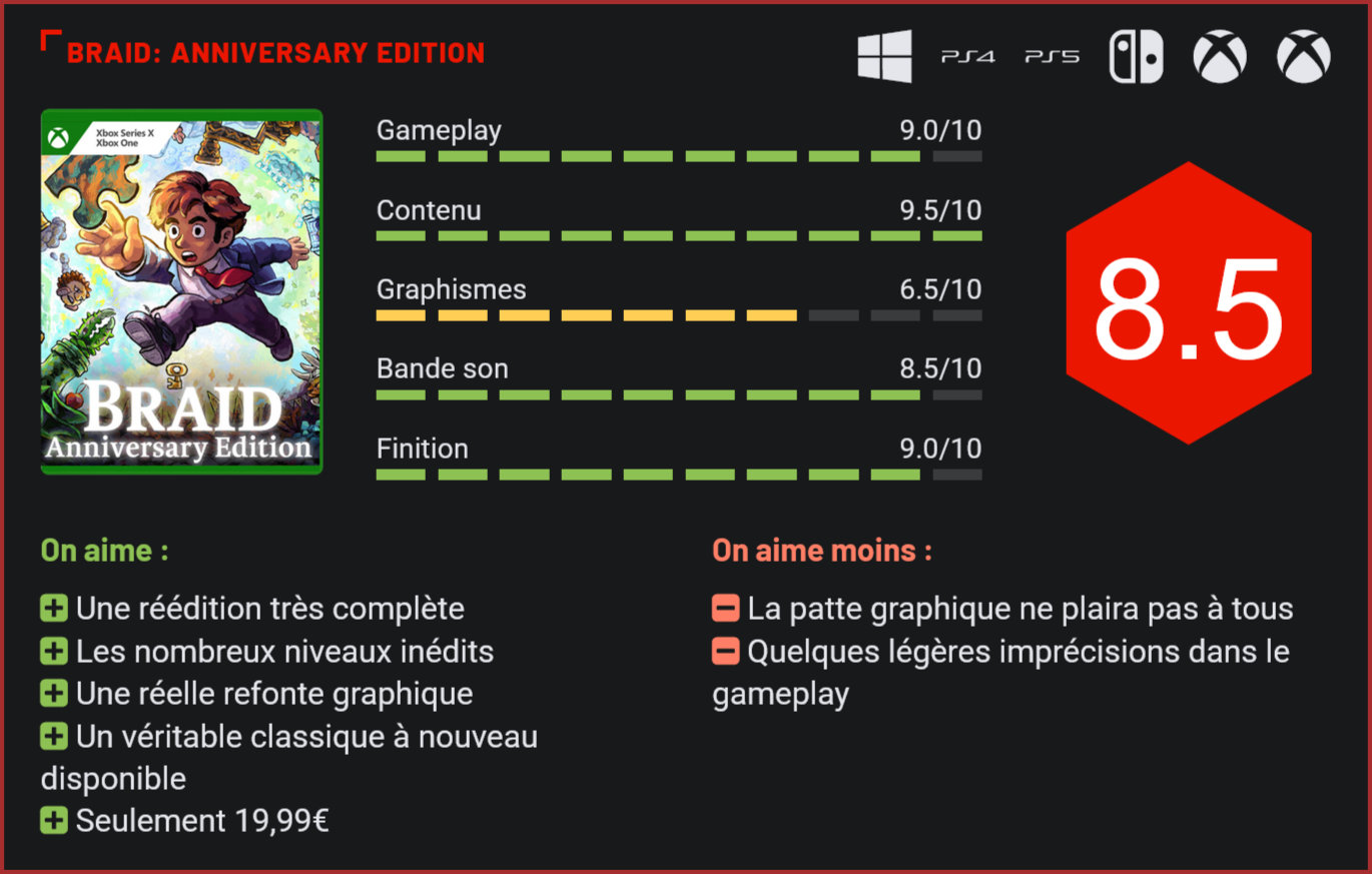 Sorti en 2008 sur Xbox 360, Braid fait partie de ces petites pépites du jeu indépendant qui ont marqué l’histoire du Xbox Live Arcade. Près de 15 ans après sa sortie originelle, le titre a enfin droit à une réédition sur toutes les plates-formes du moment, avec quantité de contenus totalement inédits… Les jeux du catalogue du Xbox Live Arcade qui ont marqué l’histoire du jeu vidéo sont nombreux. Limbo, Shadow Complex, Splosion Man, Brothers ou encore Dust sont autant de pépites qui ont marqué une génération de joueurs. S’il avait reçu un énorme succès critique en son temps, Braid avait rencontré un succès commercial plus mitigé. Plus de 15 ans après sa sortie, le studio Thekla lui offre enfin la réédition qu’il méritait. Le jeu a droit à un joli petit lifting. Braid fait partie de ces titres qui sont, par essence, difficiles à classer. Il s’agit d’un curieux mélange de platformer, d’énigmes et de jeu narratif. Pad en main, le titre se rapproche d’un Mario old school. Il faut sauter de plate-forme en plate-forme, éviter des ennemis, activer des interrupteurs. Bref, c’est du grand classique. L’originalité vient d’un système de contrôle du temps qui permet de revenir dans le passé pour éviter une mort tragique ou résoudre une énigme. Le titre se distingue des autres platformers également par la présence de nombreuses énigmes environnementales qui devront être résolues pour débloquer des pièces de puzzle, permettant de boucler à 100% un monde. Subtile, le titre est d’une profondeur rare et n’hésite d’ailleurs pas à jouer avec les standards du jeu vidéo en intégrant des mécanismes uniques. Dans le premier chapitre du jeu, il faudra par exemple placer les différentes pièces d’un puzzle pour créer un pont qui permettra d’accéder à une plate-forme et à une pièce de puzzle manquante… Des combats de boss sont aussi au programme. Braid est un excellent jeu indé. En réalité, il s’agit même d’un véritable incontournable pour les amoureux du jeu vidéo. Le jeu de Jonathan Blow fait partie de ces titres qui parviennent à continuellement surprendre les joueurs. En dépit des années, le jeu n’a également pas trop mal vieilli. On notera au passage que cette réédition est plus proche d’un remaster que d’un simple travail de portage, les graphismes ayant été totalement retravaillés, pixel par pixel… Visuellement, le jeu est donc beaucoup plus joli que l’original. Il suffira d’ailleurs d’appuyer sur une touche pour pouvoir comparer la version originale au remaster. Le travail des développeurs ne s’est d’ailleurs pas arrêté là puisque cette Anniversary Edition intègre de nombreuses autres petites nouveautés, dont 15 heures de commentaires des développeurs, 13 niveaux inédits, 12 niveaux alternatifs totalement inédits également et une bande son entièrement retravaillée. Le tout pour un prix très décent puisque cette édition anniversaire nous est facturée 19,99€. Les puzzles font partie intégrale de l’aventure. Mais alors, faut-il craquer ? Que vous ayez ou non joué à l’original, Braid: Anniversary Edition est un must-have absolu. Braid est non seulement l’un des meilleurs jeux de ces 20 dernières années, c’est également l’un des titres les plus innovants de sa génération et une véritable pépite. L’édition anniversaire intègre de nombreux nouveaux contenus est est vendue à un prix très décent. Pour la première fois, le jeu est également disponible sur tous les supports. Conclusion Si vous étiez passé à côté de cette pépite intemporelle, nous ne pouvons que vous conseiller de vous jeter sur Braid: Anniversary Edition. Pour les fans, cette réédition intègre un paquet de nouveautés parmi lesquelles une bande son remaniée, des graphismes retravaillés, de nouveaux niveaux et plus de 15h de commentaires des développeurs. Pour les autres, c’est l’occasion de jouer les séances de rattrapage. Curieux mélange de platformer old-school et de jeu d’énigme, Braid est l’un des jeux les plus créatifs de sa génération et incontestablement l’un des meilleurs jeux de ces 20 dernières années. Son style graphique ne plaira pas à tous, au premier regard, mais croyez-nous, vous aurez beaucoup de mal à décrocher après 30 minutes de jeu…