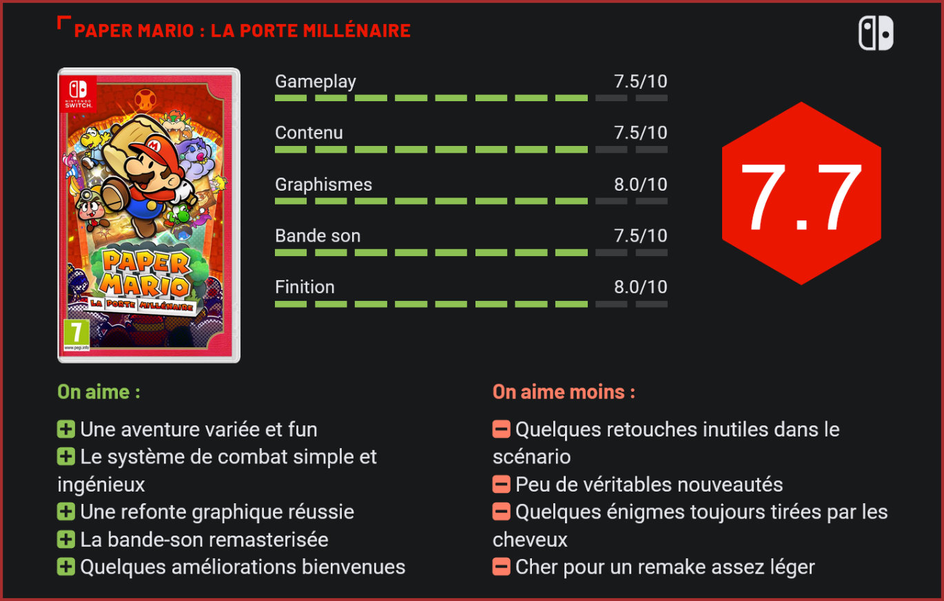 Paru sur Gamecube il y a presque 20 ans, Paper Mario : La Porte Millénaire fait son grand retour avec un remake on ne peut plus fidèle à l’original. Celui qui est souvent considéré comme le meilleur épisode de la franchise Paper Mario est désormais bien plus accessible et un peu amélioré. Si à peu près tout le monde est familier avec la licence Super Mario, les nombreux spin-offs qui composent la série phare de Nintendo restent parfois un peu moins connus. Le plombier a eu de nombreuses occasions d’apparaître dans des jeux de sport, des puzzle game, mais aussi dans des jeux de rôle. Débutée sur Nintendo 64, la série Paper Mario propose des aventures inspirées des RPG japonais phares de l’époque (mais également de son prédécesseur Super Mario RPG) dans un univers singulier et absurde réalisé en papier. Son deuxième épisode sorti sur Gamecube en 2004, La Porte Millénaire, est souvent considéré comme étant ce que cette branche de la série a proposé de meilleur. Vingt ans après sa sortie, Nintendo et Intelligent Systems proposent un véritable remake de cet épisode phare destiné à la Switch. Nous suivons une nouvelle aventure de Mario qui débarque cette fois dans la ville malfamée de Port-Lacanaïe. Le plombier a été appelé par la princesse Peach afin de la rejoindre là-bas et de prendre part à une chasse au trésor à l’aide d’une carte que Mario a désormais en sa possession. Peach semble pourtant introuvable, et une organisation mystérieuse nommée les “Mégacruxis” convoite aussi cette carte au trésor qui possède un lien avec la fameuse porte Millénaire qui donne son nom au jeu. Aidé par Goomélie et le professeur Goomstein, Mario part alors explorer les quatre coins de cette nouvelle région afin de trouver sept gemmes étoiles capables d’ouvrir la porte Millénaire, et d’élucider tous ces mystères. À la manière de nombreux RPG, chaque chapitre du jeu nous emmène explorer différents lieux et propose un petit arc narratif qui nous permet bien souvent d’agrandir notre équipe de héros avec un nouveau personnage jouable. Si l’intrigue de ce deuxième Paper Mario n’est pas renversante, elle arrive tout de même à nous captiver grâce à son écriture tout en humour et en légèreté, mais également grâce à la diversité de situations et d’ambiance que nous parcourons tout au long de ce scénario. Étalé sur une trentaine d’heures (sans compter le contenu annexe conséquent du jeu), cette histoire se révèle toujours aussi charmante vingt ans après sa conception. Le script du jeu a été revu à l’occasion de ce remake, et si le ton est généralement bien conservé, il est tout de même dommage de voir que certaines thématiques sont altérées. Des changements sans doute effectués pour éviter d’aborder quelques sujets sensibles, mais qui portent aussi atteinte à la qualité de l’écriture de certains personnages. Les graphismes du titre ont été entièrement refaits. Cette nouvelle version de Paper Mario : La Porte Millénaire est aussi entièrement retravaillée en ce qui concerne ses visuels. Tout en restant reconnaissables, les zones du jeu ont subi de sacrés changements pour coller au style plus moderne des derniers épisodes. On retrouve plus de détails dans les décors ainsi que de nombreux effets de lumières qui n’étaient pas présents dans la version Gamecube. Le résultat est très convaincant et donne encore plus de vie aux personnages et aux différents lieux. Il y a eu beaucoup de changements côté musique aussi puisque la bande-son originale, déjà très bonne à l’époque, a été remasterisée. De nouvelles variations des musiques sont aussi présentes au cours du titre, à l’image du thème de combat qui possède une nouvelle version pour chaque chapitre du jeu. Le reste de l’aventure est pourtant sensiblement le même qu’en 2004. La Porte Millénaire est un RPG au tour par tour dans lequel nous alternons entre des phases de combat et de l’exploration dans différentes villes et donjons. Mario acquiert de nouvelles capacités au cours du jeu, permettant d’amener quelques énigmes dans les zones explorables. Une formule classique et efficace, qui est accompagnée d’un système de combat particulièrement convaincant. Le système de combat reste simple tout en apportant de très bonnes idées. Son gameplay au tour par tour nous permet de contrôler deux personnages qui peuvent utiliser différentes compétences. Les combats se déroulent tout de même un peu en temps réel puisqu’il est nécessaire de réaliser des actions contextuelles dépendant de l’attaque que nous effectuons avec notre personnage. Il est aussi possible de diminuer les dégâts d’une attaque ennemie en appuyant sur un bouton au bon moment, et de réaliser une véritable parade qui rend l’attaque inefficace, mais cette dernière nécessite un timing bien plus précis. Le système de combat reste simple, mais est aussi plutôt intelligent et propose tout de même de quoi réfléchir face aux différentes configurations d’ennemis. Nous possédons aussi des badges à équiper à Mario qui servent à modifier le gameplay. Ces derniers permettent d’obtenir de nouvelles attaques, d’avoir des effets passifs, ou même d’altérer un peu la difficulté du jeu qui, sans cela, reste relativement simple tout au long de l’aventure. S’il n’est pas l’antagoniste principal, Bowser a aussi son rôle à jouer dans cette histoire. Plusieurs petites améliorations sont à noter pour ce remake, permettant de rendre l’expérience un peu plus agréable qu’à l’époque. De nouveaux lieux permettent une meilleure navigation à travers les zones du jeu, il est aussi possible de débloquer musiques et illustrations bonus… Le titre propose également un nouveau système d’aide pour nous aider à progresser dans l’aventure, ce qui est plutôt pratique lorsqu’on est face à quelq