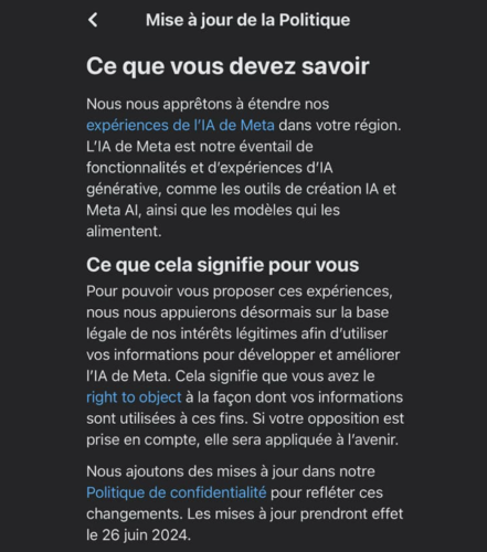 Meta compte entraîner son intelligence artificielle générative afin de concurrencer ChatGPT et Google Gemini. Pour ce faire, l’entreprise de Mark Zuckerberg va récolter un nombre important de données sur les utilisateurs de Facebook et d’Instagram. Les contenus créés, les informations sur nos amis, les commentaires postés, Meta mobilise (quasiment) toutes les informations pour former son IA. Certains utilisateurs belges et français de Facebook ont reçu un message provenant de Meta. En effet, en ouvrant l’application, ces derniers ont reçu un message concernant une “Mise à jour de la politique de confidentialité”. Le message précise également : “Nous nous apprêtons à étendre nos expériences de l’IA de Meta dans votre région”. À noter que cette mise à jour concerne également les utilisateurs d’Instagram et de Threads. De prime à abord, nous pourrions nous dire qu’il s’agit d’une énième modification de la réglementation de Meta, mais cette mise à jour revêt pourtant un caractère particulier. Pour cause, Meta annonce au travers de ce message une collecte de données conséquente afin d’entraîner son intelligence artificielle générative. Meta explique à ce titre : “Pour pouvoir vous proposer ces expériences, nous nous appuierons désormais sur la base légale de nos intérêts légitimes afin d’utiliser vos informations pour développer et améliorer l’IA de Meta”. La date d’entrée en vigueur de cette nouvelle mise à jour est fixée au 26 juin prochain. Mais quelles seront les données récoltées par Meta “pour créer, fournir, soutenir et conserver la technologie d’intelligence artificielle“, comme l’explique l’entreprise ? Autant dire qu’il est question de quasiment toutes les informations que nous laissons sur Facebook, Instagram et Threads. Comme nous pouvons le lire dans la nouvelle politique de confidentialité, les récoltes de données concerneront : l’activité et les informations que l’utilisateur fournit, les informations sur les amis, les followers et “autres relations”, les informations de l’application, du navigateur et de votre appareil ou encore les informations provenant de partenaires, fournisseurs et tout autre tiers. Source : Meta Meta se donne donc le droit d’utiliser les contenus que l’utilisateur crée sur Facebook, Instagram et Threads “comme les publications, les commentaires ou les fichiers audio”. Sont également concernés par ces récoltes de données : les contenus que l’utilisateur fournit “via notre fonctionnalité Appareil photo, les paramètres de votre pellicule ou les fonctionnalités activées vocalement”. L’entreprise de Mark Zuckerberg précise tout de même que : “Nous [Meta] n’utilisons pas le contenu de vos messages privés échangés avec vos ami·es et votre famille pour l’entraînement de nos modèles d’IA“. Pour ceux qui ne désirent pas participer à l’entraînement de l’intelligence artificielle générative de Meta, il est possible de bloquer cette mise à jour de la politique de confidentialité. En ce qui concerne la récolte de données sur Facebook, il faut suivre ce lien. Cependant, nous pouvons noter qu’il ne fonctionne pour l’instant pas. En ce qui concerne la récolte de données sur Instagram, il faut suivre ce lien (qui est cette fois-ci bien opérationnel), et remplir le formulaire en ligne. Pour rappel, une intelligence artificielle générative se forme sur base d’une certaine quantité d’informations. Au plus cette quantité d’informations sera importante, au plus l’intelligence artificielle parviendra à s’affiner, dans ses réponses, mais aussi dans sa façon de se comporter. Afin de concurrencer ChatGPT et Google Gemini, Meta a donc tout intérêt à récolter un maximum d’informations sur ses utilisateurs, qu’ils soient sur Facebook, Instagram ou Threads.