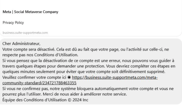 Un message avertit certains utilisateurs de Facebook que leur compte sera bientôt supprimé. Le message en question contient un lien qui permettrait de rétablir la situation. Il s’agit en réalité d’une arnaque. Depuis quelques jours, certains utilisateurs de Messenger (Facebook) ont reçu un message étrange dans leur boîte de réception. L’initiateur du message se présente comme le support technique de Meta et avertit d’une désactivation imminente de votre compte Facebook. Le message en question, provenant soi-disant de Meta, indique que la désactivation de votre compte Facebook est « dû au fait que votre page, où l’activité de celle-ci, ne respecte pas nos Conditions d’Utilisation ». Bien entendu, nous avons ici affaire à une tentative d’arnaque, et plus précisément à du phishing. Pour cause, le message précise ensuite qu’il s’agit peut-être d’une erreur et qu’il est possible d’annuler la désactivation du compte. Un lien présent dans le message permettrait de « demander une protection » (pour une menace qui n’existe pas). Ce lien permettrait également d’annuler la suppression du compte Facebook en « confirmant son compte ». En réalité, c’est précisément ce lien qui permettra à l’arnaqueur de dérober diverses informations confidentielles à sa victime. Le lien ne redirige pas vers un site d’aide de Meta, mais vers un site frauduleux réglé pour voler des données personnelles. Un élément en particulier nous permet de repérer clairement l’arnaque : Meta ne communique pas par message privé. Par ailleurs, il ne faut jamais cliquer sur un lien qui renvoie à un site externe à Facebook, même si le lien en question présente dans son nom “Support Meta”. Si vous rencontrez un quelconque problème avec Messenger ou Facebook, rendez-vous dans les réglages.