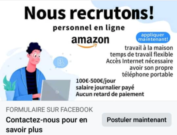 Les arnaques à l’offre d’emploi se multiplient sur les réseaux sociaux. Télétravail, horaires flexibles, salaire (très) attractif, les conditions de travail annoncées ont comme objectif de piéger les internautes. Comme le signale le média français PhonAndroid, une arnaque circule actuellement sur WhatsApp. Certains utilisateurs de WhatsApp ont ainsi reçu un message leur annonçant que le site de réservation en ligne Booking cherche de nouveaux employés pour un job en ligne. Le message frauduleux indique ainsi : « Nous recherchons des personnes pour travailler sur notre plateforme mobile de réservation d’attractions hôtelières (Booking.com) afin d’aider les hôtels à augmenter le nombre de vues, de réservations et la notoriété ». Le message est également accompagné de quelques précisions sur ce soi-disant poste à pourvoir. Et autant dire que ces précisions sont attrayantes, ou plutôt, trop belles pour être vraies. La personne qui effectuera ce “travail” pourra : gérer ses horaires comme bon lui semble, travailler depuis sur smartphone et gagner jusqu’à 300 € par tâche effectuée ! Bien entendu, il s’agit tout simplement d’une arnaque, et plus précisément d’une tentative d’hameçonnage. Un bouton situé en dessous du texte indique “Envoyer un message à l’entreprise”. C’est précisément au travers de ce bouton que l’arnaque débutera. Par ailleurs, sur la version mobile de WhatsApp, nous pouvons remarquer que le numéro du destinataire commence par +62, soit l’indicatif de l’Indonésie. Il s’agit là d’un indice qui nous oriente clairement sur la piste de l’arnaque. Mais ce type d’arnaque à l’emploi ne se retrouve pas seulement sur WhatsApp. Sur Facebook, nous retrouvons des arnaques similaires, voire identiques. À titre d’exemple, un post Facebook annonce recruter du personnel en ligne pour Amazon. Comme c’était le cas avec l’arnaque sur WhatsApp, les promesses ont de quoi donner envie : télétravail, horaires flexibles, aucun retard de payement, salaire jusqu’à 500 € par jour, etc. Bien entendu, il s’agit également d’une arnaque, et il ne faut en aucun cas remplir le “formulaire en ligne” lié au post. De façon générale, ne prêtez aucune attention aux annonces de recrutement qui circulent sur les réseaux sociaux, cela même si les conditions de travail annoncées vous paraissent séduisantes. Méfiez-vous également des tâches “simples” à effectuer contre rémunération, comme noter des produits sur Internet. En ce qui concerne le recrutement, aucune grande entreprise ne procède de cette façon pour embaucher du personnel. Prudence donc.