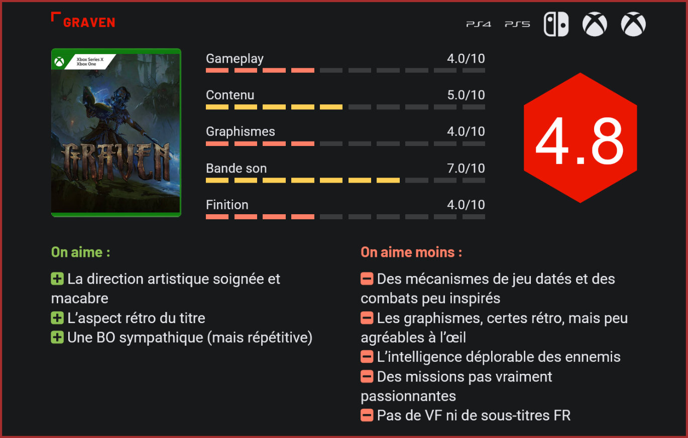 Sorti en janvier sur PC, Graven a droit moins de 6 mois plus tard à un portage sur consoles. Le RPG rétro de Slipgate Ironworks s’en sort-il avec les honneurs ? Depuis quelques temps, on assiste à un véritable raz de marée de FPS rétro pixélisés. Phantom Fury, Warhammer 40,000 Boltgun, Chasm, Dusk, Wrath ou Prodeus sont autant d’exemples types qui nous viennent à l’esprit en quelques secondes. Graven s’en distingue toutefois de par son orientation. Graven s’inspire en effet davantage d’un Hexen, avec son univers médiéval-fantastique, ou d’un Elder Scrolls pour son gameplay plus typé RPG que d’un Doom ou d’un Quake. Ambiance, ambiance. Rapidement, nous réalisons que ce titre exploite fortement la nostalgie tout en utilisant les codes de la Dark Fantasy. Ainsi, dans Graven, nous incarnons un prêtre exilé pour un crime altruiste. Dès les premières secondes de jeu, la direction artistique se dévoile, à la fois séduisante et macabre. Le joueur commence sur une barque en route vers le port de Cruxfirth. L’ambiance est lugubre et des cris résonnent au loin. Une fois à terre, le malaise s’accentue. Des pendus, des cadavres jonchant le sol, et d’étranges créatures mortes parsèment les quais. Rapidement, nous comprenons que ce lieu est ravagé par une mystérieuse peste ayant transformé la majorité des habitants en morts-vivants. En ce qui concerne les graphismes, le titre n’est pas particulièrement beau et s’appuie sur une esthétique rappelant les années 90 ou le début des années 2000. Par certains aspects, Graven affiche même un style cartoonesque. D’un côté, ce type de graphismes s’harmonise avec l’intention du jeu, à savoir jouer sur la nostalgie. De l’autre, il convient de mentionner que Graven est développé par un petit studio. Proposer des graphismes d’apparence rétro ne constitue pas en soi un problème. On a vraiment l’impression de jouer à un jeu d’une autre époque, et la nostalgie opère. En revanche, proposer des mécaniques de jeu datées est cette fois-ci un véritable problème. Tout d’abord, le système de combat est assez rudimentaire. Il vous faudra alterner entre des coups physiques et des lancements de sorts. Pour ce faire, vous disposez d’armes (gourdin, arbalète, épée, etc.) et d’un livre de sorts. Les combats manquent de subtilité et se résument à frapper dans le tas. De plus, le jeu est émaillé d’énigmes à résoudre. Celles-ci sont parfois assez intéressantes, mais souvent très classiques. L’univers fantasy a son charme. Les tâches à accomplir ne sont guère passionnantes et se résument à ouvrir des portes, trouver des objets ou débloquer des situations. De plus, préparez-vous à casser des dizaines de caisses pour récupérer des munitions et des vies tout en évitant de frapper les tonneaux d’explosifs rouge vif. Concernant l’intelligence artificielle des ennemis, le constat est particulièrement décevant. Ils n’adoptent aucune stratégie et affichent parfois des comportements franchement stupides. Par exemple, lors de notre session de jeu, un groupe d’ennemis s’est éliminé tout seul en faisant exploser un baril d’explosifs, alors que nous étions à plusieurs mètres de distance. Plus globalement, Graven se révèle assez pauvre dans son contenu. Le monde semi-ouvert est plutôt vide, et les PNJ sont sporadiques et se ressemblent tous. Les interactions se limitent à deux ou trois lignes de dialogue écrites, tandis que les échanges oraux se résument à des onomatopées (hum!, arh!). De plus, le jeu donne très peu d’indications sur les objectifs à accomplir, ce qui nécessite souvent de nombreux allers-retours sur la carte pour débloquer une situation. À noter que Graven propose un mode coopératif. Enfin, le titre ne dispose pas de sous-titres en français. A noter que ce portage sur consoles est globalement réussi, mais n’apporte pas d’amélioration majeure. Le titre reste assez bugué et a peu évolué depuis sa sortie sur PC. Niveau optimisation, c’est donc loin d’être parfait… Conclusion Sorti en début d’année, Graven séduit et déçoit par son aspect rétro, non seulement dans son esthétique (graphismes, direction artistique), mais aussi, malheureusement, dans son gameplay. Les combats se révèlent sommaires et peu intéressants à jouer. On est loin d’un fast-FPS ici puisque le titre lorgne un peu du côté des RPG. En effet, Graven s’adresse à un public très spécifique. Ceux qui ont grandi avec ce type de jeu dans les années 90/2000 ressentiront probablement un sentiment de nostalgie en y jouant. En revanche, ceux qui ne sont pas familiers avec ce style risquent de ne pas accrocher du tout. S’il n’est pas mauvais, le titre peine en tout cas à marquer les esprits. Mieux vaut donc être prévenu, et prêt à s’investir, avant de se lancer dans cette quête !