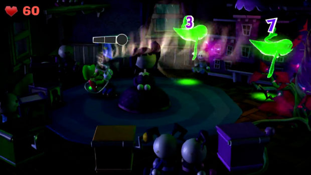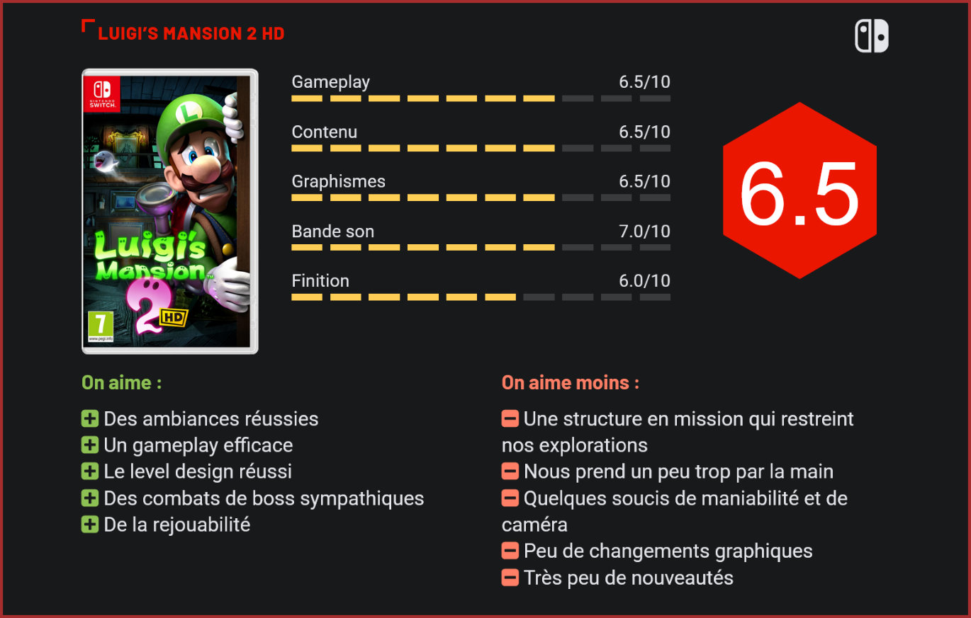 Malgré les sorties prochaines de titres intéressants pour cette fin de vie de la Switch, Nintendo semble aussi vouloir meubler avec des ressorties peu intéressantes d’anciennes productions. Cette nouvelle version “HD” de Luigi’s Mansion 2 est malheureusement à mettre dans cette catégorie. Après un premier épisode sorti sur Gamecube, la licence Luigi’s Mansion a fait une grande pause avant de proposer un second opus sur Nintendo 3DS en 2013, puis un troisième sur Switch en 2019. Souvent considéré comme l’épisode le moins intéressant de la trilogie, le second jeu est pourtant de retour sur la console de Nintendo dans une nouvelle version HD, toujours signée par Next Level Games, les développeurs originaux. Savant mélange entre jeu d’aventure et jeu (légèrement) horrifique, cette licence nous permet d’incarner le frère de Mario dans des épopées qui vont lui faire affronter ses peurs. Luigi retrouve très vite son arme de prédilection pour vaincre les fantômes. Dans la Vallée des Ombres, la Lune Noire est mystérieusement brisée en plusieurs morceaux. Sans cet objet qui permet de rendre les fantômes pacifiques, la vallée est plongée dans le chaos face à tous ces ectoplasmes agressifs. Non loin de là se trouve le laboratoire du professeur K. Tastroff qui étudie les spectres. Ce dernier fait alors appel à Luigi pour régler le problème. Les différents fragments de la Lune Noire se trouvent dans plusieurs manoirs infestés de fantômes en tout genre. Luigi doit alors explorer les différents lieux, capturer des esprits, et découvrir où se cachent les fragments de la Lune Noire, tout cela grâce à plusieurs outils liés à l’Ectoblast 5000, un aspirateur capable de capturer les spectres. Contrairement aux deux autres épisodes qui laissent une plus grande liberté d’action et plus de possibilités d’exploration, Luigi’s Mansion 2 est un titre divisé en missions. Si plusieurs missions se déroulent dans le même manoir et nous font retraverser les mêmes pièces, le level design restreint souvent nos déplacements pour ne pas dévier de notre mission actuelle. Ce deuxième opus est donc une aventure bien plus linéaire, ce que les nombreux appels du professeur K. Tastroff au beau milieu de nos missions ne cessent de nous rappeler. Cette aventure se concentre aussi beaucoup plus sur de la réflexion que sur de l’action, puisque toutes les salles des manoirs proposent de nombreuses interactions. Luigi possède plusieurs outils différents liés à son aspirateur, qui doivent être utilisés à bon escient pour progresser. Capturer les spectres n’est jamais très compliqué. Les différents manoirs offrent des ambiances distinctes, des ennemis uniques et de nouvelles mécaniques de jeu afin de renouveler l’expérience. Si celle-ci est généralement plutôt plaisante, le gameplay se révèle parfois imprécis, la faute à une caméra pas toujours très claire sur la perspective et à des contrôles peu intuitifs. Luigi n’est pourtant pas désagréable à contrôler mais certains passages sont tout de même un peu frustrants, malgré une difficulté qui n’est pas très élevée. Le level design reste cependant plutôt réussi, de même que les combats de boss souvent ingénieux. L’équipement de Luigi peut aussi s’améliorer grâce à l’argent que l’on récolte un peu partout dans les manoirs. Les niveaux proposent aussi des collectables sous formes de pierres précieuses à trouver, ainsi qu’un Boo qui se cache dans chacune des missions. Ces bonus permettent de gonfler la durée de vie déjà correcte de l’aventure (entre 10 et 15h) qui gagne plusieurs heures si vous avez pour objectif de tout trouver. Le titre propose également plusieurs modes coopératifs à plusieurs, à la fois en ligne et en multijoueur sans fil local, pour prolonger l’expérience. Les niveaux proposent de nombreux objets cachés. Cette nouvelle version n’est pas non plus très convaincante sur son aspect graphique. Si les changements réalisés concernant l’éclairage des salles et les ombres sont très convaincants et permettent de renforcer l’ambiance légèrement horrifique du titre, il faut tout de même constater que le gros du travail réalisé pour cette version HD reste plutôt léger. De nombreux éléments de décors ont toujours une géométrie très simpliste malgré ce passage à la haute définition. Le jeu se montre plus beau que sa version originale, mais peine à convaincre à côté d’un titre spécifiquement conçu pour la Switch comme Luigi’s Mansion 3. La bande-son est tout de même très réussie, elle propose différentes versions des musiques récurrentes de Luigi’s Mansion, tout en insufflant ce soupçon d’horreur qui caractérise cette série de spin-offs. Luigi’s Mansion 2 HD propose de retrouver un épisode de cette saga qui s’éloigne un peu des autres opus dans sa formule. Cette dernière reste bien exécutée même si elle paraît plus restrictive et qu’elle ne brille pas par son originalité. Le titre n’est malheureusement pas très mémorable non plus, et très rarement passionnant à parcourir. S’il est tout de même agréable de retrouver un Luigi très expressif qui doit affronter ses peurs, cette version “HD” ne propose quasiment aucune nouveauté par rapport à la version originale. Nintendo propose pourtant ce remaster à 59,99€, ce qui est un prix franchement trop élevé. Conclusion La Nintendo Switch n’a pas encore rendu son dernier souffle et plusieurs grosses productions sont encore prévues pour la machine du géant japonais. Pourtant, Nintendo compte aussi proposer quelques portages pour meubler. Luigi’s Mansion 2 HD est malheureusement à ranger dans cette catégorie tant cette version propose peu de nouvelles choses. Nous incarnons le frère de Mario dans une aventure où il va explorer plusieurs manoirs pour retrouver les morceaux de la Lune Noire, un objet qui