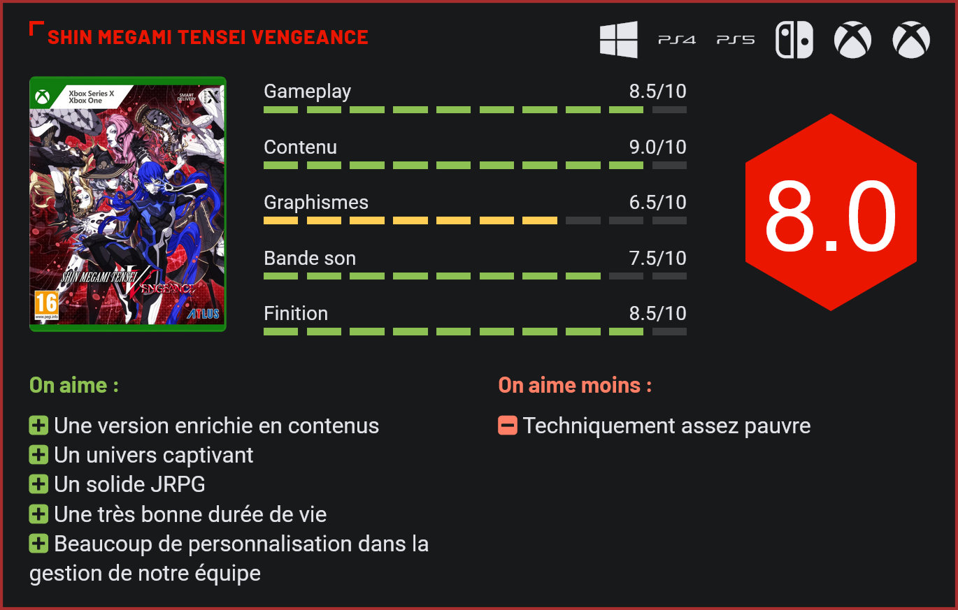Sorti il y a déjà presque 3 ans sur Switch, Shin Megami Tensei V a remporté un joli petit succès sur la console de Nintendo. Assez pour décider Atlus de nous livrer une version upgradée sur PC et consoles de salon. Spin-off de Persona, la série phare d’Atlus, Shin Megami Tensei reste relativement méconnu en Europe. La popularité de Persona pousse toutefois l’éditeur à explorer de nouveaux horizons et à donner une seconde chance à Shin Megami Tensei V, qui était sorti en 2021 sur Switch. Il nous livre aujourd’hui une version “revue et corrigée” de cet excellent RPG. Rassurez-vous, il n’est pas indispensable d’avoir joué à un précédent opus de la franchise pour se lancer dans ce “cinquième opus”. Les différents jeux ne sont en effet pas liés sur le plan narratif et il est possible, comme dans un Final Fantasy, de débuter l’aventure avec n’importe quel épisode. Shin Megami Tensei V se déroule à Tokyo de nos jours, où de mystérieuses disparitions et des meurtres inexpliqués surviennent fréquemment. Le protagoniste, un étudiant, est chargé de mener l’enquête et, alors qu’il suit un de ses camarades dans un tunnel, il s’évanouit à la suite d’un séisme. À son réveil, il se retrouve non plus à Tokyo mais au cœur d’un désert appelé Da’at, le monde des enfers. Subitement attaqué par une multitude de démons, il est secouru de justesse par un être nommé Aogami, qui lui propose de fusionner pour devenir un Nahobino, une entité puissante mi-humaine, mi-divine. Ensemble, ils vont tenter de comprendre leur présence dans ce monde post-apocalyptique, où une guerre sans fin oppose les démons aux anges envoyés par Dieu. Ce nouvel opus s’appuie sur les concepts établis dans les précédents jeux Megami Tensei. Il conserve l’atmosphère apocalyptique propre à la franchise, avec un univers où démons sinistres et anges autoritaires se disputent la domination du monde, cherchant respectivement à instaurer le chaos ou l’ordre pour satisfaire des divinités tyranniques. La série est connue pour incorporer des éléments de science-fiction, et ce cinquième volet ne fait pas exception, mêlant ces éléments à des thèmes résonnant particulièrement avec la société japonaise contemporaine. Le scénario, bien que puissant, ne s’impose pas trop, ce qui est surprenant pour le genre, souvent enclin à se concentrer lourdement sur la narration. Shin Megami Tensei V propose un récit complexe mais rapidement introduit, laissant une grande place au gameplay sans nécessiter plusieurs heures avant de pouvoir véritablement commencer à jouer. Le jeu est un RPG linéaire avec un gameplay au tour par tour fortement axé sur le “dungeon crawling”. La majeure partie du jeu se déroule dans de vastes zones bien conçues, où l’exploration apporte de nombreux avantages. Ces zones sont peuplées d’ennemis, d’objets à découvrir et de personnages offrant des quêtes secondaires. Les sources connectives, des points de sauvegarde, offrent un moment de répit en permettant également l’accès à un magasin et au Monde des Ombres, dont nous reparlerons plus bas. Les combats se déroulent au tour par tour, où nous contrôlons jusqu’à quatre personnages qui enchaînent leurs attaques. Le système est assez classique, reprenant les bases des jeux précédents de la série. Notamment, le système de tours permet de gagner une action supplémentaire lorsqu’on inflige un coup critique ou qu’on exploite les faiblesses élémentaires des ennemis. Les combats reposent beaucoup sur les éléments magiques (feu, glace, lumière, ténèbres, etc.), ce qui nécessite de composer une équipe équilibrée. Shin Megami Tensei V ne propose pas de groupe de personnages principaux comme c’est souvent le cas dans le genre. Le protagoniste est l’élément central de l’équipe, les autres membres étant des démons qu’il faut recruter en leur parlant et en négociant pendant les combats. Ces négociations ajoutent une touche d’humour, chaque type de créature ayant plusieurs dialogues, et il faut deviner quels choix leur plairont pour qu’ils nous rejoignent, ou simplement céder à leurs caprices en leur offrant de l’argent et des objets. À la manière de Pokemon, chaque créature a ses propres forces, faiblesses et compétences. Le Monde des Ombres offre encore plus de possibilités de personnalisation. Il permet de fusionner nos démons pour en obtenir de nouveaux, un système qui nous permet de gagner en puissance tout en découvrant de nouvelles créatures parmi les 200 disponibles dans le jeu. Le protagoniste peut également apprendre des effets passifs en échange de points de gloire, des points de compétence obtenus en trouvant des objets cachés dans les zones. Il est ensuite possible d’utiliser des essences de monstres pour acquérir leurs capacités. Le Nahobino et ses créatures disposent d’un nombre limité d’emplacements pour y placer des compétences telles que des attaques spéciales, des sorts magiques ou d’autres effets passifs, permettant ainsi de personnaliser notre approche des combats. Le protagoniste est le seul à pouvoir hériter des faiblesses et résistances élémentaires des essences, un aspect crucial à considérer pour ne pas être anéanti par les boss. En effet, la série Megami Tensei est réputée pour sa difficulté, et ce cinquième épisode ne fait pas exception. Si les actions supplémentaires peuvent rendre certains combats plus faciles, les ennemis peuvent aussi exploiter ce système. Une offensive d’ennemis avec un avantage d’affinité sur notre équipe peut rapidement devenir fatale, laissant toujours la possibilité d’un retournement de situation. Si le protagoniste meurt, c’est un Game Over direct et retour à l’écran titre. De plus, le jeu n’utilise que des sauvegardes manuelles, sans sauvegarde automatique. Avec un équilibrage rendant la progression d