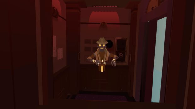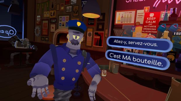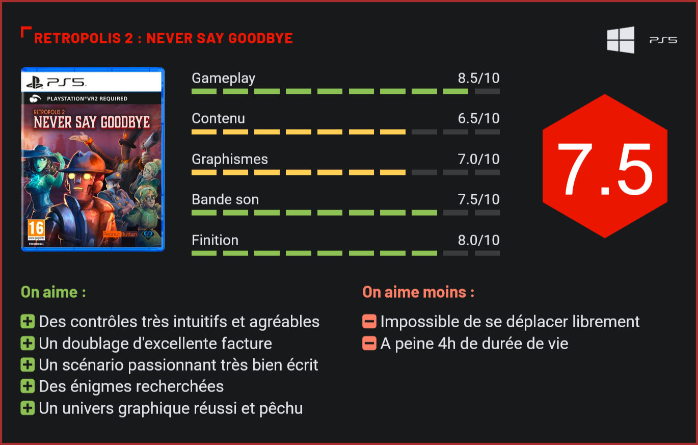 Vous rêviez d’incarner un policier robot dans une enquête haletante et passionnante en VR ? Peanut Button l’avait fait il y a 3 ans et réitère l’expérience avec l’excellentissime Retropolis 2. La VR est principalement exploitée par les studios de développement pour créer des titres en FPS ultra immersifs où l’on tire à tout-va ou encore des expériences courtes contemplatives. Mais certains studios profitent des capacités et possibilités apportées par la réalité virtuelle pour sortir des sentiers battus et proposer des titres originaux. C’est le cas de Peanut Button qui, il y a trois ans, sortait sa toute première production, The Secret of Retropolis, une aventure VR diablement réussie. Cette suite s’inscrit dans la droite lignée du premier épisode. On retrouve ainsi Philip Log, un ancien inspecteur de police de type robotique qui vit dans une ville “rétro-futuriste” appelée Retropolis. C’est sur fond de thriller policier que nous devrons mener une enquête, nous replonger dans les méandres de la police criminelle. Coup de théâtre avec ce second épisode, puisque Philip Log est ici poursuivi et traqué pour un crime qu’il n’a pas commis, celui de la femme de sa vie, Jenny Montage. Nous passerons ainsi de l’appartement de notre protagoniste à un bar en passant par la cellule d’un commissariat. Une histoire poignante, trépidante qui nous plonge réellement dans la peau du héros. Le scénario est habilement écrit, dans la droite lignée du premier épisode, et se permet même d’offrir une conclusion ouverte, sujette à toutes les spéculations pour un potentiel troisième opus. On se retrouve avec une intrigue profonde, passionnante et truffée de rebondissements. Espérons que le prochain épisode soit aussi bien écrit… Vous incarnez Philip Log, un robot ancien inspecteur de police qui fait tout pour retrouver Jenny Montage, la femme de sa vie. Si vous n’avez pas joué au précédent épisode, comment vous décrire Retropolis ? Concrètement, il s’agit d’un point and click en réalité virtuelle qui nous plonge dans un univers délicieusement rétro du plus bel effet. Ce ne sont, certes, pas les plus beaux graphismes vus dans un jeu en VR, mais l’univers graphique de la série fait mouche, et c’est bien là le principal. À ces graphismes, nous ajouterons une BO juste impeccable, des mélodies au doublage. Le titre n’est pas doublé en français, il faudra se contenter des sous-titres, mais cela est bien suffisant à la vue de l’excellent travail des doubleurs anglophones. Que ce soit au niveau de l’esthétique ou du gameplay, Retropolis 2 s’apparente à un véritable jeu point and click des années 1990, pour le meilleur, comme pour le pire. Commençons par le pire d’abord, puisque ce sera plus rapide. D’une part, on se retrouve avec un jeu extrêmement statique. On nous positionne à un endroit au centre de la pièce, duquel on ne peut bouger, et il faut interagir avec les éléments du décor. Si ceux-ci sont suffisamment bien agencés pour qu’on ne ressente le besoin de se déplacer, ce manque de mobilité est assez contraignant et pourrait rebuter plus d’un joueur. Cette capture d’écran résume parfaitement à elle seule la magnifique patte graphique du titre. L’autre point négatif que nous soulignerons de ce Retropolis 2 et qui est tout droit hérité des point and click des années 1990, c’est la courte durée de vie du titre. S’il n’est heureusement pas vendu très cher (un peu moins de 25€), ce second épisode des aventures de Philip Log s’achève, malheureusement, en un peu moins de 5 heures. Le premier épisode était sensiblement plus court, on sent qu’il y a du mieux du côté des développeurs, mais cela reste assez léger. Maintenant que nous nous sommes attardés sur les points négatifs du titre, abordons le reste. Du côté du gameplay, Retropolis 2 nous permet d’interagir avec près de 80% des éléments du décor, ce qui améliore sensiblement l’immersion. Manger une pizza remplie de boulons, fumer un écrou faisant office de cigarette, boire de l’huile… On a réellement l’impression d’être Philip Log. Et lorsque l’on attrape un objet et que l’on veut le combiner avec un autre, notre héros va dire des choses toujours en lien avec les objets choisis. Ce n’est pas grand-chose, mais c’est assez sympathique. Tout au long de l’aventure, nous devrons donc interagir avec les objets du décor, mais également résoudre de nombreuses énigmes parsemées ici et là. Vous en rencontrerez plusieurs par chapitre (sachez que Retropolis 2 est composé de cinq chapitres), toutes mieux fichues les unes que les autres. Jamais trop compliquées, elles impliquent une réflexion approfondie de la part du joueur pour en venir à bout. Tout au long de l’aventure, vous aurez à résoudre des énigmes, mais également à faire des choix dans vos conversations, tantôt très importants, tantôt de moindre importance. Pour interagir avec les éléments et résoudre les énigmes, Philip Log agit à la manière d’un Mr Fantastique. Il allonge ses bras pour attraper et assembler des objets ou les ajouter à la manne (qui fait office d’inventaire) pour les analyser ou utiliser plus tard, lorsque la situation s’y prêtera mieux. Seules deux touches sont à retenir : la gâchette arrière pour sélectionner une option ou attraper un objet, et le joystick pour pivoter sur soi-même. Cela facilite considérablement le gameplay et permet de se concentrer sur le principal : les énigmes, l’histoire et notre enquête. Conclusion Si vous recherchiez un thriller policier en réalité virtuelle qui requiert un minimum de réflexion sans vous rendre malade à cause des coups de feu et courses-poursuites à répétition, alors Retropolis 2 est assurément le titre qu’il vous faut. Servi par un scénario aux petits oignons et un gameplay intéressant qui vous met aux prises 
