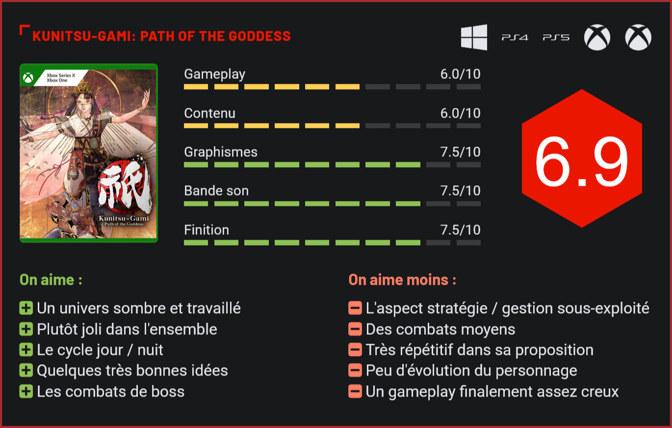 Capcom joue la carte de l’originalité avec Kunitsu-Gami, un nouveau jeu d’action et stratégie inspiré du folklore nippon qui n’hésite pas à mixer les genres. Quand on pense à Capcom, on pense forcément à Resident Evil, Street Fighter ou encore Monster Hunter. L’éditeur nous a habitués à nous livrer chaque année des suites de ses licences les plus prestigieuses. Alors lorsque Capcom se décide enfin à délivrer quelque chose de différent, les joueurs sont plutôt surpris, surtout lorsque l’éditeur mélange les genres. Kunitsu-Gami avait beaucoup surpris lors de sa présentation. Avec son univers médiéval fantastique morbide, son character design inquiétant et son gameplay atypique, le titre avait semé le chaud et le froid chez les joueurs. Rassurez-vous, après une grosse semaine passée dessus, on peut vous confirmer que le nouveau jeu de Capcom est plutôt une bonne surprise ! C’est elle qu’il faudra à tout prix protéger. Il faudra toutefois adhérer au concept, très particulier, du jeu. Car de facto, Kunitsu-Gami n’est pas un jeu comme les autres. Il s’agit certes d’un action-RPG, mais qui lorgne davantage du côté des jeux de stratégie que du côté de l’exploration. Vous incarnerez en effet ici un guerrier qui devra à tout prix protéger une prêtresse de terribles Ikoku, des monstruosités sorties du creux de l’enfer. Votre mission sera simple : protéger la prêtresse tout en purifiant chaque village du mont Kafuku, votre lieu de villégiature. Après une courte cinématique d’introduction, on pose donc les mains dans le cambouis et on tente de comprendre les mécanismes, beaucoup plus simples qu’il n’y paraît. Concrètement, vous dirigerez ici un seul personnage. Pas d’open world à l’horizon mais des “micro-niveaux” de taille très réduite, qu’il faudra d’abord explorer pour les “purifier” en libérant les villageois et en purifiant les quelques lieux infectés. En nettoyant le niveau, vous débloquerez des ressources, qui vous permettront soit d’attribuer des rôles à vos villageois en leur donnant un équipement – ils pourront ainsi se transformer en guerriers, mages, archers et vous aider dans votre tâche -, soit de “préparer le chemin” (ou “tracer la voie spirituelle” comme le jeu nous l’indique) pour votre prêtresse en lui indiquant la voie vers la porte damnée d’où sortiront les itokus chaque nuit. Les combats représentent facilement 40% du gameplay. Avant d’aller plus loin, il convient de le préciser : tout le jeu repose sur ce cycle de jour et de nuit. Concrètement, lorsque vous vous retrouvez dans un niveau, il faudra l’explorer et préparer vos défenses de jour, et combattre la nuit, puisque c’est ce moment que choisiront les itokus pour attaquer. Le jeu se transformera alors en une sorte de beat them all stratégique. Pour remporter la partie, il faudra placer judicieusement ses quelques unités, potentiellement dresser l’une ou l’autre barrière et choisir l’endroit où vous concentrerez vos efforts – car il vous sera impossible d’éliminer à vous seul tous les ennemis. Votre mission est simple : empêcher à tout prix qu’un itoku ne s’attaque à la prêtresse. Tant que votre prêtresse n’aura pas atteint la porte, les ennemis déferleront à intervalles réguliers. Il faudra donc tracer la voie spirituelle le plus vite possible, tout en protégeant au mieux votre prêtresse lorsque la nuit arrivera… Chaque mission sera ainsi composé d’au moins deux cycles jour/nuit. Autrement dit, impossible de finir un niveau sans passer par la case combat. Les combats de boss font partie des moments forts. Pad en main, le jeu a beaucoup de mal à trouver un équilibre. Il lorgne un peu du côté de l’action-RPG, un peu du côté du jeu de stratégie, sans convaincre dans aucun des deux domaines. Les combats sont assez mous et surtout, la partie stratégie est trop peu développée. Souvent, ce sont les rôles les plus basiques qui se révèlent les plus efficaces pour vos unités : bucherons ou archers feront des miracles face aux adversaires. Et ça tombe bien puisque ce sont les rôles les moins coûteux… C’est également assez dommage car finalement, on n’explore pas le potentiel stratégique du titre avant sa seconde moitié… Heureusement, les combats contre les boss sont beaucoup plus intéressants : les ennemis sont retords et nécessitent surtout la mise au point d’une stratégie appropriée. Entre deux missions, on repassera dans l’un des villages purifiés pour explorer le volet gestion. N’en attendez pas trop toutefois, il s’agira la plupart du temps d’attribuer quelques tâches de réhabilitation à vos villageois, à récupérer quelques cristaux qui vous permettront d’améliorer vos unités et à caresser des animaux. Vous l’aurez compris, là aussi l’aspect gestion n’est que caressé du bout de l’index. Il faudra attribuer un rôle à chacun de vos villageois. Piètre jeu de stratégie et de gestion, Kunitsu-Gami a toutefois l’atout de nous plonger dans un univers médiéval fantastique plein de charme et à explorer brillamment le folklore japonais. Des créatures au design macabres à la danse de notre prêtresse, tout inspire à la découverte. “Sympathique” et foisonnant de très bonnes idées, le jeu de Capcom peine toutefois à délivrer une expérience concluante. Le schéma des missions se reproduit sans finesse jusqu’au bout de l’aventure et il faut bien avouer que passé deux petites heures de jeu déjà, on a l’impression d’en avoir fait le tour. Malheureusement, ce sentiment ne vous quittera jamais. A 49,99€, l’addition n’est pas très salée pour un jeu qui reste “sympathique” à explorer. Mais n’espérez pas y passer des nuits. D’ailleurs, le fait que le titre soit intégré au Gamepass n’est en soi pas anodin. C’est typiquement le genre de titre auquel on ne jouerait 