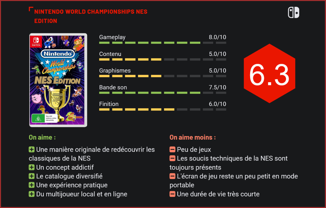 Si peu de jeux Nintendo vont sortir durant cet été, le géant de Kyoto propose tout de même une production plus modeste qui permettra de revisiter ses classiques. Nintendo World Championships : NES Edition est une compilation de micro défis reprenant le concept des championnats organisés par la firme durant l’année 1990. Si Nintendo existe depuis maintenant plus de cent ans, l’entreprise japonaise a véritablement trouvé son domaine de prédilection durant les années 1980 avec sa percée dans le monde du jeu vidéo. Fort du succès de sa toute première console, la NES, Nintendo of America organise une compétition devenue culte durant l’année 1990 : le Nintendo World Championship. Si la pratique est revenue à quelques reprises plus récemment, la firme propose désormais un jeu inspiré par ces mêmes compétitions : Nintendo World Championships NES Edition. Cette production disponible sur Switch propose des micro défis inspirés par les épreuves de la compétition originale, tout cela à réaliser sur des jeux NES. Le principe est on ne peut plus simple, puisque le titre va nous proposer environ 150 défis différents qu’il faudra réaliser le plus vite possible. Ces derniers se déroulent sur treize jeux cultes de la première console de Nintendo, à savoir : Super Mario Bros, The Legend of Zelda, Metroid, Donkey Kong, Kid Icarus, Super Mario Bros. 2, Excitebike, Ice Climbers, Balloon Fight, Super Mario Bros. 3, Zelda II The Adventure of Link, Super Mario Bros. 2 (The Lost Levels) et Kirby’s Adventure. Si la sélection est finalement peu surprenante, et ne propose que des productions directement liées à Nintendo, elle apporte une diversité bienvenue. Il est possible de visualiser son dernier record tout en jouant. Chaque titre propose un certain nombre de défis qui sont relativement courts. Les premières épreuves nous demandent souvent de réaliser des tâches simplistes qui ne prennent que quelques secondes, afin de s’habituer aux contrôles du jeu en question, tandis que les défis suivants proposent des missions un peu plus longues (terminer un niveau, trouver un secret…). Chaque jeu possède une dernière mission bien plus longue, qui peut potentiellement prendre plusieurs minutes, et qui demande de mettre en œuvre ce que les défis précédents nous ont appris. Super Mario Bros nous demande par exemple de terminer l’entièreté du jeu en prenant les Warp Zones, tandis que Zelda 2 nous charge de parcourir tout un donjon le plus rapidement possible. Tout l’intérêt du titre repose sur son aspect “speedrun”. Les différentes épreuves ne proposent finalement que peu de difficultés, d’autant plus que les solutions pour les terminer nous sont données par des vidéos. Il en va de même pour les missions finales des différents jeux qui sont accompagnées d’un petit guide sous forme de manuel d’instruction. Si Nintendo World Championships : NES Edition nous donne les solutions à ses défis, les petites vidéos ne nous montrent pas toujours les chemins les plus rapides, c’est alors à nous d’essayer de trouver le parcours optimal pour faire le meilleur temps. Plusieurs outils utiles sont à notre disposition pour accompagner cette expérience de speedrun. Recommencer un défi se fait presque instantanément, l’interface affiche les boutons sur lesquels nous sommes en train d’appuyer, et nous avons aussi la possibilité d’afficher, juste à côté de notre partie, un replay de notre meilleur temps. Certains défis sont beaucoup plus longs que d’autres. Selon la note qui est attribuée lorsqu’on remporte une épreuve, nous gagnons des pièces qui peuvent être dépensées pour débloquer d’autres défis, mais également pour personnaliser notre profil de joueur avec des personnages tirés des jeux disponibles. Le titre propose également des succès, tout un tas d’objectifs à atteindre afin de débloquer des icônes à afficher aussi sur notre profil. Cette collection de défis propose tout de même de quoi jouer à plusieurs à travers différents modes de jeu. Il est ainsi possible de jouer en compagnie d’un maximum de sept personnes en multijoueur local pour savoir qui sera le plus rapide. Le titre possède aussi deux modes de jeux en ligne dont les épreuves, tirées évidemment des 150 proposées par le jeu, changent toutes les semaines. Le “Championnat du monde” nous propose une série de cinq défis à réaliser pour battre le temps des joueuses et joueurs du monde entier, tandis que le mode “Tournois de survie” nous fait affronter les fantômes de sept autres participants. Il est d’ailleurs possible de consulter les parties des meilleurs compétiteurs afin de voir comment ils s’y prennent. On ne joue jamais directement contre d’autres joueurs en ligne. Le principe du jeu rappellera sans doute les “NES Remix” aux plus gros fans de la firme, titres que Nintendo proposait au début des années 2010. Ce Nintendo World Championships NES Edition se montre tout de même moins créatif que ses prédécesseurs spirituels en reprenant des morceaux de jeux exactement tels qu’ils étaient sur NES. Malheureusement, cela inclut les petits bugs visuels et chutes de framerate qui apparaissent dans certains titres de l’époque. Il faut aussi ajouter la trop petite taille de l’écran de jeu lorsque la Switch est utilisée en mode portable, et ce malgré une option permettant de l’agrandir. La durée de vie du titre se montre aussi très limitée puisque les défis se terminent très vite, et qu’il ne faut pas plus de quelques heures pour faire le tour de l’expérience. Seuls les modes multijoueurs et l’envie de réaliser les meilleurs temps nous incitent à jouer. L’expérience se révèle un peu légère et son tarif de 29,99€ parait un tantinet élevé. La sélection de jeux proposée ici est aussi un peu décevante, un ou deux titres en plus n’auraient pas été de refus. S’il se nomme 