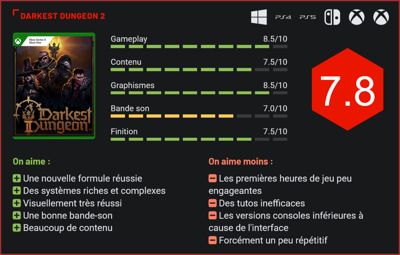 Sorti très récemment sur toutes les consoles actuelles, la suite du rogue-like de Red Hook Studios a eu droit à quelques années d’accès anticipé sur PC. Darkest Dungeon 2 est un RPG très complet aux nombreuses qualités, mais qui peut aussi se montrer impitoyable envers la personne qui tient la manette. En 2016 sortait Darkest Dungeon, un RPG au tour par tour rogue-like développé par une équipe indépendante nommée Red Hook Studios. Véritable succès, leur premier jeu a ensuite donné naissance à une suite qui se repose sur les bases installées, tout en apportant beaucoup de changements. Darkest Dungeon 2 a eu droit à une période d’accès anticipé dès la fin de l’année 2021, avant de véritablement sortir en 2023 sur PC. Le titre est désormais disponible sur consoles depuis ce mois de juillet, l’occasion de voir ce que cette suite a dans le ventre. Nous retrouvons ici l’univers de Dark Fantasy du premier titre. Ce deuxième jeu se déroule après les évènements du précédent, alors que le monde est plongé dans les ténèbres, et que des monstres y pullulent. Nous devons recruter quatre héros et les embarquer dans un voyage afin d’apporter l’espoir à ce monde en ruine. Le scénario est très léger et se révèle petit à petit au fil des multiples campagnes disponibles. Le voyage entrepris par notre équipe n’est pas de tout repos. Cette suite garde l’ambiance gothique et l’univers sombre déjà bien installé dans le premier. La direction artistique a pourtant subi quelques changements et le résultat se montre encore plus détaillé et convaincant. Les graphismes sont cette fois réalisés presque entièrement en 3D mais avec un style qui fait parfaitement illusion en nous donnant l’impression de voir un comics animé sous nos yeux. Le titre ne fait aucune faute à ce niveau et propose une mise en scène simple mais efficace, ainsi qu’une bande-son qui est aussi très agréable. Nos aventures sont accompagnées par les paroles d’un narrateur charismatique qui donne un charme très marqué à cette ambiance apocalyptique. Malgré son statut de suite, Darkest Dungeon 2 est un titre qui se démarque de son prédécesseur sur plusieurs points. Le début d’une partie nous demande de constituer une équipe de quatre personnages, chacun ayant ses propres capacités en combat. Le jeu nous lance ensuite dans une campagne où nous voyageons à travers plusieurs lieux à bord de notre diligence. La route est composée de plusieurs chemins et les évènements qui s’y trouvent sont générés procéduralement, c’est alors à nous de choisir les itinéraires parmi plusieurs possibilités. Chaque choix nous amène vers des affrontements contre des ennemis, des pièges endommageant notre diligence, mais aussi vers des destinations plus positives comme les hôpitaux permettant de soigner nos personnages, ou encore les “autels de la réflexion” qui permettent d’en apprendre plus sur nos héros et débloquer de nouvelles compétences. Une fois arrivés au bout du chemin, nos personnages se reposent à l’auberge avant de reprendre la route. Les combats sont complexes dès le départ. Si le principe est simple, les informations que nous avons sont souvent limitées. De nombreux éléments sont aléatoires et chaque choix peut avoir des conséquences sur le déroulé de la partie. Évidemment, la mort de nos personnages est permanente, et une fois notre équipe décimée, nous devons tout reprendre à zéro. Enfin, pas “tout”, puisque contrairement au premier jeu qui était un rogue-like pur et dur, ce deuxième épisode prend une approche un peu plus “lite” du genre en proposant une progression sur le long terme. Chaque fin de partie rapporte un certain nombre de bougies dépendant du déroulement. Cette monnaie peut être dépensée dans “l’autel de l’espoir” juste avant de commencer une nouvelle partie afin d’obtenir de très nombreuses améliorations affectant nos personnages, notre équipement, notre diligence… L’expérience Darkest Dungeon 2 est assez difficile dès le départ, même si les choses s’améliorent naturellement au fil des heures de jeu. Les combats au tour par tour nous confrontent vite à des ennemis féroces, et ces affrontements peuvent parfois durer de nombreuses minutes, de quoi nous mettre sous tension. Le titre nous demande de prendre en compte de nombreux éléments pour progresser efficacement. C’est par exemple le cas de l’état de santé mental de nos personnages, ces derniers étant soumis au stress qui peut s’avérer très problématique, ou encore la relation des membres du groupe qui peut tout aussi bien être positive que négative, amenant différents effets en combat. Les cartes sont remplies d’évènements et de pièges. Malheureusement, le titre se révèle peu accueillant. Même si cette approche est thématiquement très cohérente dans cet univers empli de désespoir et qui ne cesse de vouloir notre mort, il est difficile de ne pas reconnaître que les premières heures de jeu sont on ne peut plus raides. On ne s’amuse que très rarement avant d’avoir appris comment jouer à Darkest Dungeon 2. Le titre propose bien des explications, mais elles sont généralement délivrées sous forme d’une encyclopédie. Si elle a le mérite d’être consultable à tout moment, elle ne donne pas vraiment envie d’apprendre les systèmes pourtant riches et intelligents du jeu. Les versions consoles y ajoutent un autre problème puisque les interfaces du jeu sont clairement conçues pour la version PC (en affichant par exemple de nombreuses informations et statistiques en passant notre curseur sur tout un tas d’éléments différents). Le contrôle à la manette se montre beaucoup moins pratique et peu intuitif. Une fois passé le cap de l’apprentissage, Darkest Dungeon 2 se révèle particulièrement riche et complet. Rogue-lite oblige, de nombreux éléments se débloquen